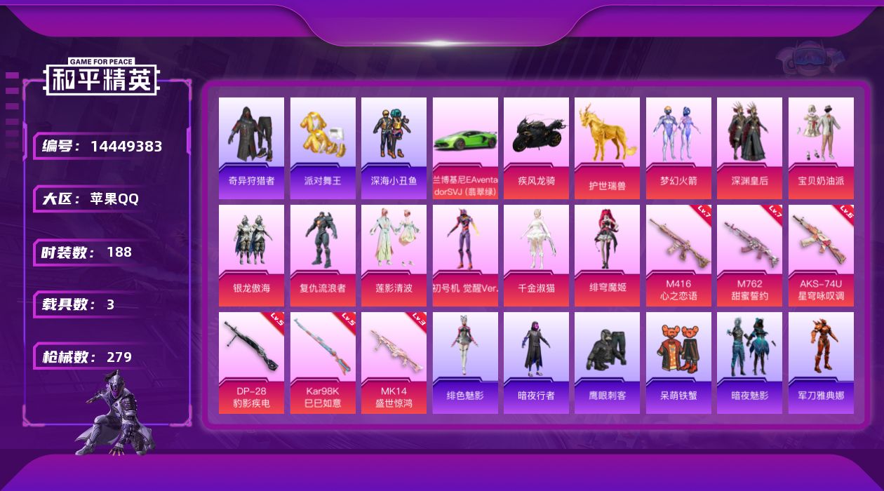 [14449383]【1609】苹果 手Q-9粉装-6特效枪-3载具-5粉色飞行器-90297热力值-12王牌印记-188套装-279枪皮 【热门品类】:粉装-梦幻火箭,套装-派对舞王,套装-深海小丑鱼,套装-奇异狩猎者,角色-军刀雅典娜,套装-金羽特工,套装-暗夜行者,套装-龟仙人,套装-暗影哥特,角色-8号机 【粉色载具】:兰博基尼Aventador SVJ(翡翠绿),疾风龙骑,护世瑞兽 【粉色套装】:粉装-深渊皇后,粉装-宝贝奶油派,粉装-梦幻火箭,粉装-银龙傲海,角色-复仇流浪者,粉装-莲影清波,角色-初号机 觉醒Ver.,角色-千金淑猫,角色-绯穹魔姬 【粉色枪皮等级】:M416-心之恋语(七级),M762-甜蜜誓约(七级),AKS-74U-星穹咏叹调(六级),Kar98K-巳巳如意(五级),Mk14-盛世惊鸿(三级),DP-28-豹影疾电(五级) 【粉色枪皮】:M416-心之恋语,M762-甜蜜誓约,AKS-74U-星穹咏叹调,Kar98K-巳巳如意,Mk14-盛世惊鸿,DP-28-豹影疾电 【粉色飞行器】:梦幻火箭飞行器,沙丘之主天马,镜域双华-灵镜之阶,龙翔九天飞行器,万象金身飞行器 【粉色降落伞】:百万伏特降落伞,未来战士降落伞,甜心宝贝降落伞,星之信仰降落伞,甜蜜誓约降落伞,四圣焕新降落伞,潮汐统领降落伞,香水柠檬降落伞,暗夜玫瑰降落伞,齐天大圣降落伞,环太平洋降落伞,垂柳戏鸭降落伞,炫光之旅降落伞,圣堂之誓降落伞,镜域双华降落伞,江南烟雨降落伞,精灵梦叶罗丽降落伞,魔法神域降落伞,时空协奏降落伞,雪月幻音降落伞 【稀有套装】:套装-龟仙人,套装-巳巳如意,套装-雏菊兔兔,套装-萝兰蝴蝶,套装-小熊娃娃,角色-多纳泰罗,套装-糖糖葫芦,套装-青团波波,套装-棉花软糖,角色-许七安,套装-燕燕于飞,套装-鱼渊荷华,套装-闪电轻猫,套装-粉恋花,套装-紫幽梦,套装-蓝冰羽,角色-绯色魅影 【稀有枪皮】:AKM-夜灯,AKM-奇异狩猎者,AKM-彩虹符号,AKM-恐龙拽拽,AKM-生命誓言,AKM-萌趣颜团子,AKM-虎虎生威,AKM-龙的传人,M16A4-夜灯,M16A4-幻世战舞者,M16A4-甜心亚梦,M16A4-红色方程式,SCAR-L-未来战士,SCAR-L-浪客战士,SCAR-L-炫彩节奏,SCAR-L-玉兔迎春,SCAR-L-碧影闪光,SCAR-L-红色方