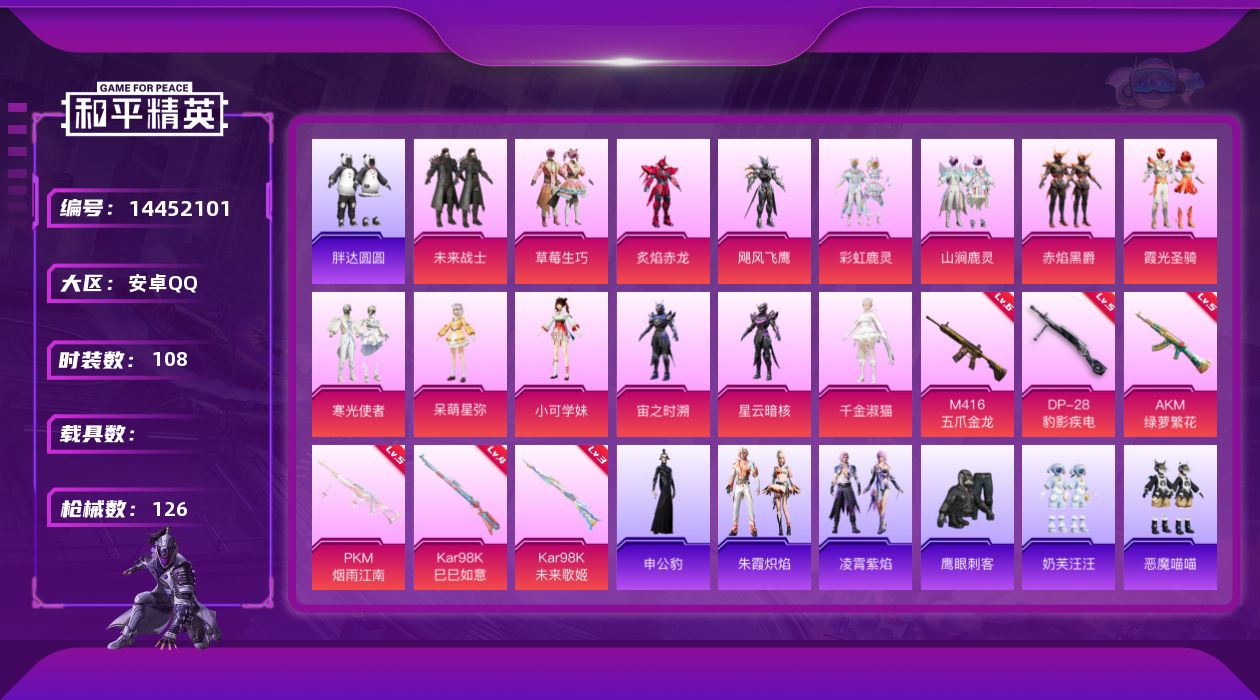 [14452101]【1618】安卓 手Q-14粉装-6特效枪-0载具-1粉色飞行器-38596热力值-3王牌印记-108套装-126枪皮