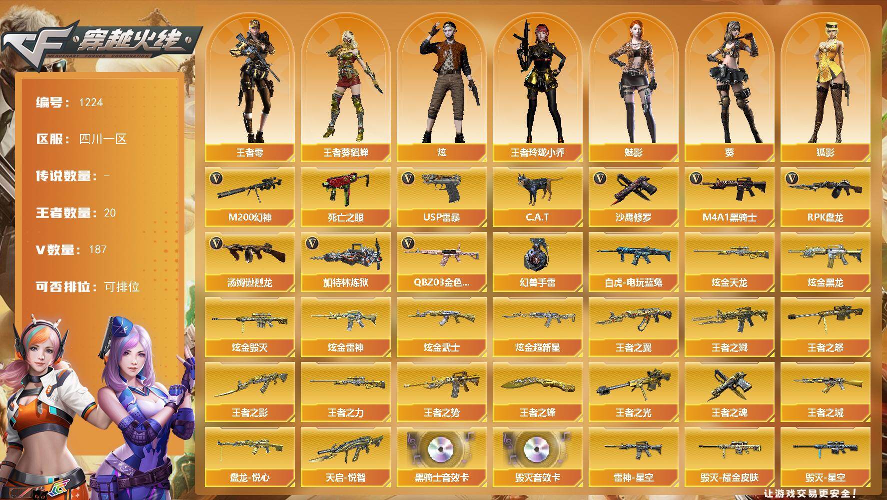 [16514227]四川一区-187V-20王者-10炫金 【热门武器】:QBZ03-金色蔷薇*2,M200-幻神,死亡之眼,白虎-电玩蓝兔,C.A.T,M4A1-黑骑士*7,汤姆逊-烈龙*6,RPK-盘龙*5,加特林-炼狱*2,USP-雷暴,沙鹰-修罗*8,高爆手雷-幻兽 【王者炫金武器】:王者之城,王者之戮,天启-悦智,王者之翼,王者之势,王者之影,王者之光*2,王者之怒*2,王者之力,盘龙-悦心,王者之魂,王者之锋,炫金黑龙*2,炫金雷神,炫金武士,炫金超新星*3,炫金毁灭*2,炫金天龙 【音效卡】:M4A1-黑骑士音效卡,Barrett-毁灭音效卡 【皮肤】:雷神-暗月,雷神-能量核心*2,雷神-星空,雷神-虎将,雷神-宇航兔皮肤,火麒麟-雷神*2,火麒麟-冠军之心,火麒麟-平天大圣,毁灭-荣耀之怒,毁灭耀金皮肤,毁灭-星空,黑龙-能量核心*2,无影-暗月*2,无影-能量核心,战神-粉色甜心皮肤*2,战神-紫绶金章皮肤*8,战神-流金岁月皮肤*6,AK47-B-常胜将军-刘备*3,AK47-B-常胜将军-孙权*2,天龙-秘银,天龙-能量核心,AWM-天龙-传奇白鲨,极光-能量核心*2,修罗-能量核心*7,天神-暗月*2 【角色】:葵,魅影,炫,王者-葵-貂蝉,王者-零,王者玲珑-小乔,狐影,乔伊教练,修道士,风暴女,嘉年华灵狐,娟娟,兰-海滩派对,灵狐者-黄金海岸,龙儿,麻雀,潘多拉-X,青霞仙子,蜀雪,铁骑荣耀,兔囡囡,影武者-X,雅典娜 【人偶武器】:AWM-灵狐-15周年嘉年华,M37-葵,COP-旗袍,C.A.T,迷你深渊冰龙*5,夺魂,迷你牛牛,迷你生化手雷,深渊终结者手雷,闪光弹-小乔,闪光弹-貂蝉,高爆手雷-大乔,迷你艾比,迷你超能女侍 【暴走生化】:死亡之眼 【挑战大师】:火狱乱世-超越Max,神圣爆裂者III*2,AK47-冰龙粉碎者,激光毁灭者III-白马银枪,激光毁灭者III,神圣爆裂者-末日III,阐释者III 【英雄级武器】:AK47-火麒麟*3,M4A1-黑龙*3,M4A1-雷神*5,M4A1-黑骑士*7,AK47-无影,M4A1-死神*4,AK47-黑武士,AK12-天启,AN94-超新星,M4A1-武圣,AK47-机械迷城,M4A1-龙血,M4A1-雷霆,AK47-雷暴,M4A1-玫瑰精灵,QBZ03-金色蔷薇*2,M4A1-猎神,王者之心-觉