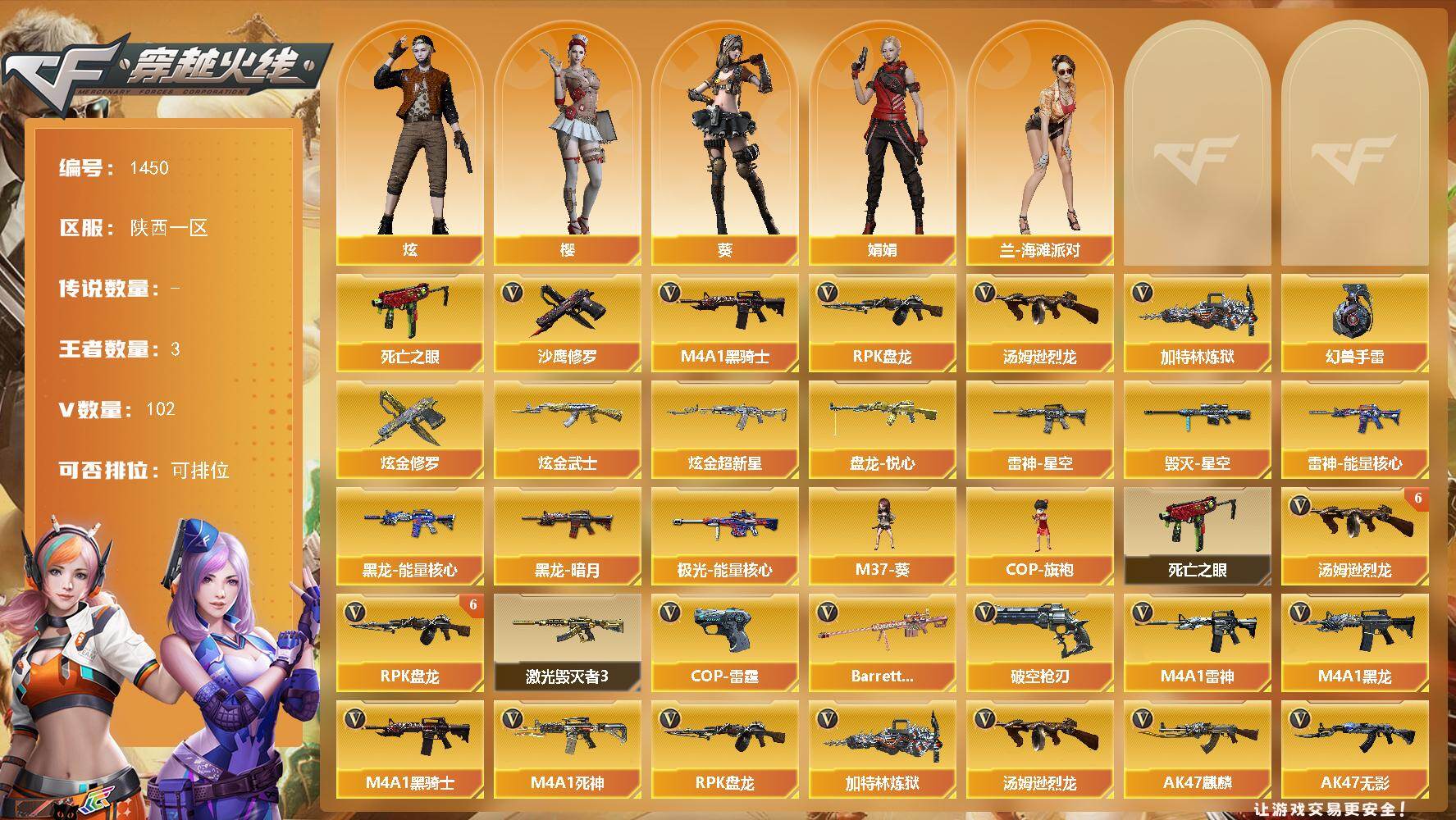 [16514282]陕西一区-102V-3王者-3炫金 【热门武器】:死亡之眼,M4A1-黑骑士,汤姆逊-烈龙*8,RPK-盘龙*6,加特林-炼狱*2,沙鹰-修罗*3,高爆手雷-幻兽*4 【王者炫金武器】:盘龙-悦心*2,炫金武士,炫金超新星,炫金修罗 【皮肤】:雷神-能量核心,雷神-星空,毁灭-星空,黑龙-能量核心,黑龙-暗月,极光-能量核心*2 【角色】:葵,樱,炫,娟娟,兰-海滩派对 【人偶武器】:M37-葵,COP-旗袍 【暴走生化】:死亡之眼 【挑战大师】:激光毁灭者III*3 【英雄级武器】:M4A1-千变,AK47-火麒麟,AK47-麒麟,M4A1-黑龙,M4A1-雷神*3,M4A1-黑骑士,AK47-无影,M4A1-死神,AK47-黑武士,AN94-超新星,M4A1-武圣,AK47-黑鲨,M4A1-龙血,M4A1-雷霆,QBZ95-幻兽,王者之心-觉醒版,AWM-天龙,Barrett-毁灭*3,Barrett-极光*2,AWM-裁决,Barrett-金色蔷薇,RPK-盘龙*6,加特林-炼狱*2,汤姆逊-烈龙*8,沙鹰-修罗*3,沙鹰-天神*3,COP-雷霆*2,破空枪刃,沙鹰-幻兽*4,Glock18-武圣,屠龙*5,龙啸*3,擎天,麒麟刺*2,女皇利刃-幻兽,高爆手雷-雷霆*6,高爆手雷-幻兽*4,闪光弹-雷霆*6,闪光弹-幻兽*4,烟雾弹-雷霆*6,烟雾弹-幻兽*4 【道具】:战舰背包,炫彩背包,超级背包*2,绿色巨人,灵魂忍者,变异宝贝,迷雾幽灵,夺命之镰,防化服*2,防弹头盔*2,防弹衣*2,C4工具钳*2,手雷包*2 【特殊枪械】:1黑骑士,6烈龙,6盘龙,2炼狱