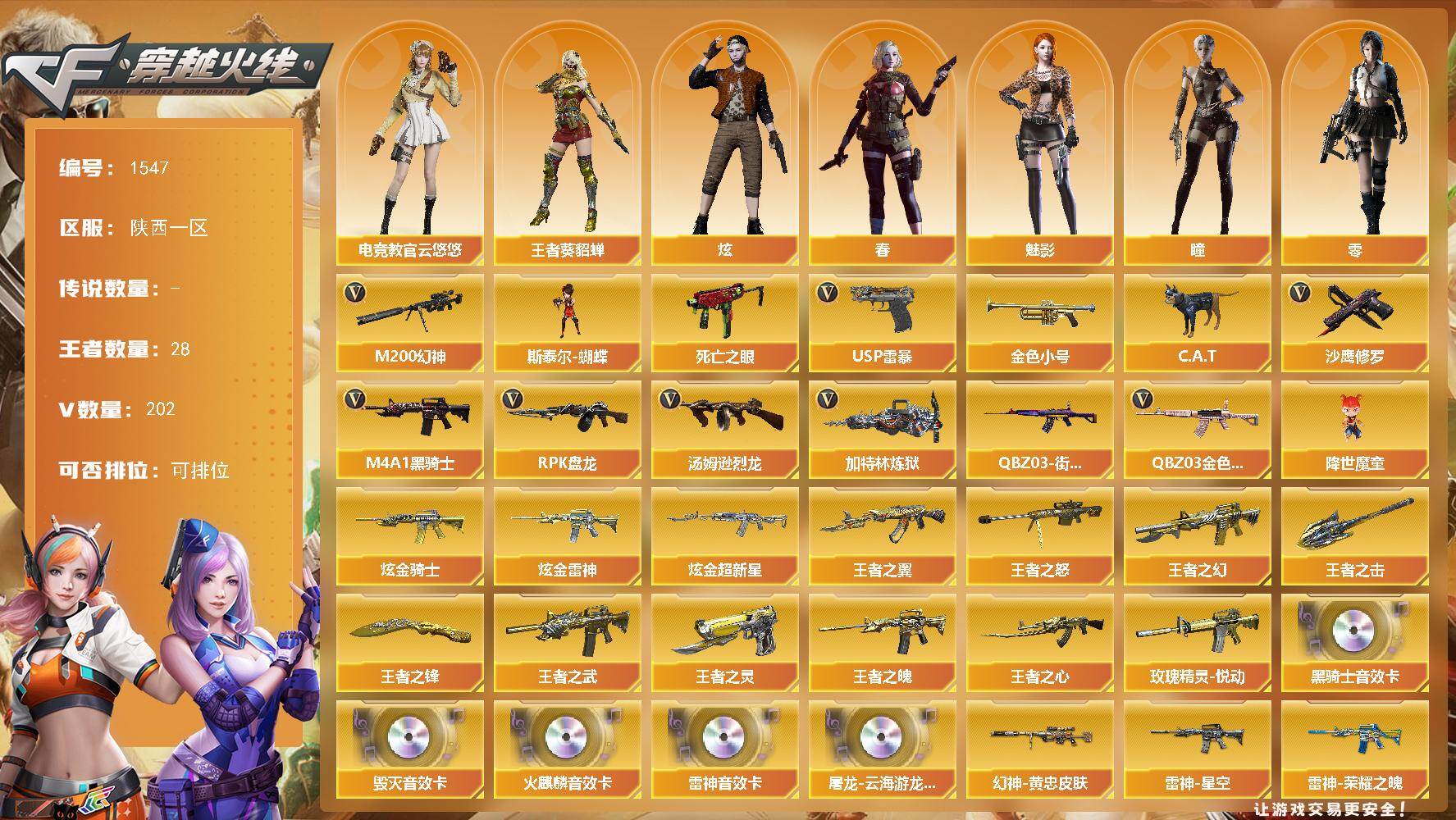 [16515334]陕西一区-202V-28王者-6炫金 【热门武器】:QBZ03-金色蔷薇,M200-幻神,死亡之眼,QBZ03-街机,金色小号,C.A.T,M4A1-黑骑士*3,汤姆逊-烈龙*5,RPK-盘龙,加特林-炼狱,斯泰尔-蝴蝶,降世魔童,USP-雷暴,沙鹰-修罗*6 【王者炫金武器】:王者之幻,王者之翼,王者之武,玫瑰精灵-悦动*2,王者之魄*4,王者之心,王者之怒*5,王者之灵,王者之击,王者之锋,炫金骑士,炫金雷神*2,炫金超新星*3 【音效卡】:屠龙-云海游龙音效卡,AK47-火麒麟音效卡,M4A1-雷神音效卡,M4A1-黑骑士音效卡,Barrett-毁灭音效卡*2 【皮肤】:M200-幻神-黄忠皮肤,雷神-暗月,雷神-荣耀之魄,雷神-星空,火麒麟-雷神,火麒麟-冠军之心,火麒麟-华夏之心,AK47-火麒麟-传奇EVEN,火麒麟-轻羽皮肤,火麒麟-平天大圣,火麒麟-心动糖果,毁灭-暗月,毁灭-荣耀之怒,毁灭耀金皮肤,毁灭-星空,毁灭-冠军之怒,毁灭-英雄计划 皮肤,黑龙-暗月,M4A1-黑龙-361,黑骑士-暗月,黑骑士耀金皮肤,黑骑士-CFS2021,无影-暗月*2,无影-能量核心,死神-秘银*4,黑武士-典韦皮肤,天启-暗月*2,战神-粉色甜心皮肤*14,战神-紫绶金章皮肤*31,战神-流金岁月皮肤*26,天龙-秘银,天龙-能量核心,AWM-天龙-传奇70KG,AWM-天龙-传奇白鲨,极光-能量核心,屠龙-荣耀之锋*3 【角色】:零,瞳,魅影,炫,春,电竞教官-云悠悠,王者-葵-貂蝉,狐影,蛇隐宗,空,暗夜-X,葵-赛博朋克,灵狐-花神,灵狐者-黄金海岸,龙儿,玫瑰花神,潘多拉-甜心教官,蛇姬,斯沃特-X,铁骑荣耀,雪莉杨,影武者-X 【人偶武器】:天龙-曼陀罗,M4A1-雷神-精英刀锋,斯泰尔-蝴蝶,COP-旗袍*2,C.A.T,夺魂,生化手雷-机甲核心,闪光弹-小乔,降世魔童 【暴走生化】:死亡之眼 【挑战大师】:神圣爆裂者III 【英雄级武器】:M4A1-千变,AK47-火麒麟*4,M4A1-黑龙*3,M4A1-雷神*3,M4A1-黑骑士*3,AK47-无影*3,M4A1-死神,AK12-天启,AK47-黑鲨*2,M4A1-龙血*4,M4A1-雷霆,AK47-雷暴,QBZ03-金色蔷薇,王者之心-觉醒版,王者之魄-觉醒版,王者之势-觉醒版,王者之戮-觉醒