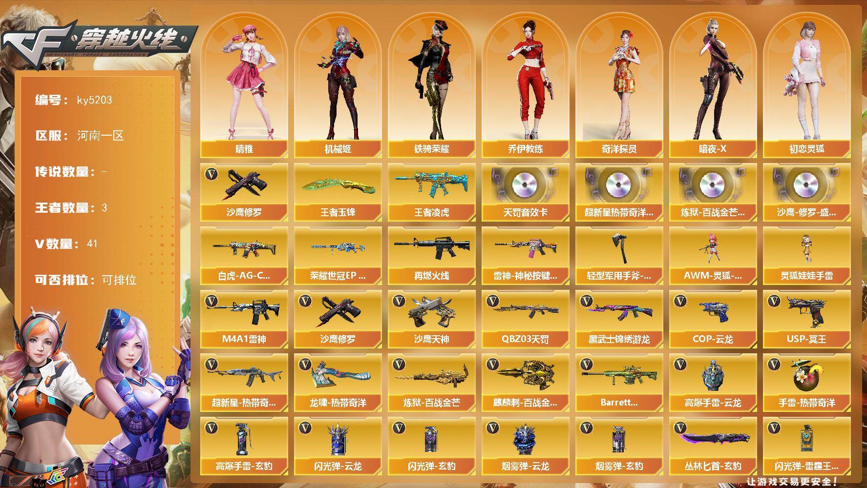 [16515503]河南一区-41V-3王者-0炫金 【传说角色】:传说星骇 【热门武器】:沙鹰-修罗*3 【王者炫金武器】:王者凌虎,王者玉锋 【音效卡】:AN94-超新星-热带奇洋音效卡,QBZ03-天罚音效卡,炼狱-百战金芒-庆典舞曲音效卡,沙鹰-修罗-盛典舞曲音效卡 【皮肤】:幻神-荣耀世冠EP 皮肤,白虎-AG-CFPLS20冠军,M4A1-再燃火线,雷神-神秘按键 皮肤,轻型军用手斧-再燃火线 【角色】:晴雅,机械姬,妮妮,奇洋探员,乔伊教练,暗夜-X,初恋灵狐,飞虎队-X,灵狐者-七夕宝贝,龙儿-小淘气,潘多拉-X,潜龙队-X,铁骑荣耀,新娜塔莎,夜玫瑰-宠粉,樱-战斗天使 【人偶武器】:AWM-灵狐-15周年嘉年华*2,灵狐娃娃手雷 【英雄级武器】:M4A1-雷神*2,QBZ03-天罚,黑武士-锦绣游龙,超新星-热带奇洋,炼狱-百战金芒,沙鹰-修罗*3,沙鹰-天神,COP 357-云龙,Anaconda-玄豹,USP-冥王,龙啸-热带奇洋,麒麟刺-百战金芒,丛林匕首-玄豹*2,高爆手雷-云龙*4,手雷-热带奇洋,高爆手雷-玄豹,闪光弹-云龙*3,闪光弹-玄豹*2,闪光弹-雷霆王者-觉醒版,烟雾弹-云龙*3,烟雾弹-玄豹*2,烟雾弹-荣耀世冠EP,Barrett-碧霄极光 【道具】:BS战队炫彩背包,CFS限定背包,奇洋探员-海龟背包,女皇终结者-背包,炫彩背包-诺拉,热带奇洋炫彩背包,百战金芒炫彩背包,超级背包,女皇终结者-魔龙之吻,绿色巨人,灵魂忍者*2,迷雾幽灵,夺命之镰,防化服*3,流光-鎏金之域,枪王排位28赛季金色流光,语音特效-盛典烟火,萌萌小葵表情,热带奇洋表情,防弹头盔*4,防弹衣*4,C4工具钳*4,手雷包*4 【特殊枪械】: