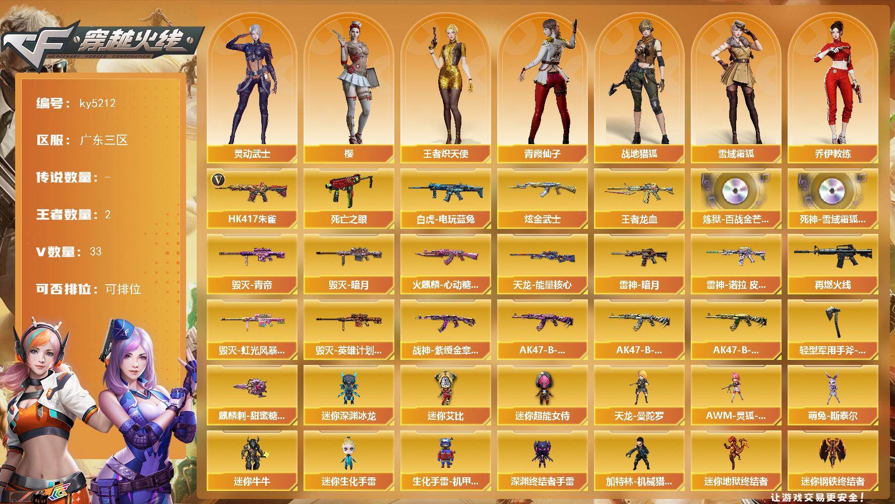 [16515831]广东三区-33V-2王者-1炫金 【热门武器】:HK417-朱雀*2,死亡之眼,白虎-电玩蓝兔 【王者炫金武器】:王者龙血,炫金武士 【音效卡】:炼狱-百战金芒-庆典舞曲音效卡,死神-雪域霜狐-怀旧音效卡 【皮肤】:雷神-暗月,雷神-诺拉 皮肤,M4A1-再燃火线,火麒麟-心动糖果,毁灭-暗月,毁灭-青帝,毁灭-虹光风暴 皮肤,毁灭-英雄计划 皮肤,战神-紫绶金章皮肤,AK47-B-常胜将军-曹操,AK47-B-常胜将军-刘备,AK47-B-常胜将军-孙权,天龙-能量核心,轻型军用手斧-再燃火线,麒麟刺-甜蜜糖果 皮肤 【角色】:樱,战地猎狐,王者炽天使,雪域霜狐,奇洋探员,乔伊教练,云海玲珑,暗夜-X,初恋灵狐,芳心审判者,飞虎队-X,风暴女,虎妞,嘉年华灵狐,灵动武士,龙儿,麻雀,潘多拉-甜心教官,青霞仙子,蛇姬,影武者-X,游珑儿 【人偶武器】:天龙-曼陀罗,迷你钢铁终结者,迷你救赎猎手,萌兔-斯泰尔,加特林-机械猎手,迷你地狱终结者,AWM-灵狐-15周年嘉年华,迷你深渊冰龙,迷你牛牛*4,迷你生化手雷*2,生化手雷-机甲核心*2,深渊终结者手雷,迷你艾比,迷你超能女侍 【暴走生化】:死亡之眼,超级对讲机 【挑战大师】:神圣爆裂者-末日III*2 【英雄级武器】:M4A1-雷神,HK417-朱雀*2,无影-神兵利器,黑武士-锦绣游龙,超新星-热带奇洋,死神-雪域霜狐,烈火-动感闪耀,王者之圣-觉醒版,AK-47-猩红传说*3,白虎-电玩蓝兔,AWM-天龙,Barrett-毁灭,AWM-裁决,炼狱-百战金芒,烈龙-云海游龙,天神-动感闪耀,屠龙,擎天*2,麒麟刺,屠龙-动感闪耀,擎天-云海游龙,龙啸-热带奇洋,斩神刀-雷暴,麒麟刺-百战金芒,手雷-动感闪耀,手雷-云海游龙,手雷-热带奇洋,M4A1-赤狱骑士 【道具】:CFS限定背包,云海游龙炫彩背包,亚洲杯纪念炫彩背包,冰冰企鹅背包-猛男专用,冰冰企鹅背包,奇洋探员-海龟背包,女皇终结者-背包,机械魔影背包-红色,热带奇洋炫彩背包,牛魔王背包-至尊黄金,百战金芒炫彩背包,老虎背包,背包-洛丽塔,裂空之翼背包-金色,超级背包,雪域霜狐炫彩背包,黄金曼提柯尔的背包,圣拳猎手-炽雪,终极猎手-秦魂将军,女皇终结者-魔龙之吻,救世主-黑桃战神,绿色巨人,灵魂忍者*2,变异宝贝,妖姬,迷雾幽灵*2,生化弹匣,夺命之镰