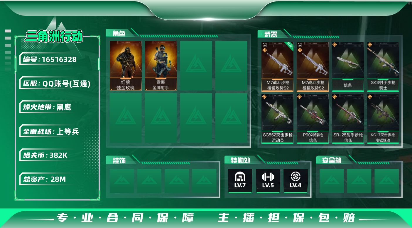 [16516328]【特价出售/店主推荐】 28m总资产-382k哈伏币-60烽火等级-黑鹰-25战场等级-上等兵 【干员外观】:红狼-蚀金玫瑰,露娜-金牌射手 【近战皮肤】:近战-信条,近战-黑鹰 【典藏外观】:M7战斗步枪-棱镜攻势S2 【典藏外观成色】:M7战斗步枪-棱镜攻势S2(优品C) 【传说外观】:M4A1突击步枪-蚀金玫瑰,SG552突击步枪-运动员,KC17突击步枪-电锯惊魂,P90冲锋枪-信条,M14射手步枪-蛮荒,SKS射手步枪-骑士,SR-25射手步枪-信条 【史诗外观】:K416突击步枪-冬日风情,M7战斗步枪-百步穿杨,G3战斗步枪-流沙送葬,AS Val突击步枪-百步穿杨,MP5冲锋枪-竞技风,Vector冲锋枪-百步穿杨,勇士冲锋枪-深海恐惧,S12K霰弹枪-曙光,PKM通用机枪-阿萨拉特攻,M249轻机枪-丛影谍踪,M250通用机枪-囚徒,QJB201轻机枪-炽焰,SVD狙击步枪-阿萨拉工艺,M14射手步枪-工业狂潮, M14射手步枪-航天庆典,M700狙击步枪-百步穿杨,AWM狙击步枪-流沙送葬 【稀有外观】:M4A1突击步枪-繁盛,AKM突击步枪-肃杀,ASh-12战斗步枪-繁盛,K416突击步枪-一帆风顺,M7战斗步枪-精英联盟,M7战斗步枪-捣蛋鬼,SG552突击步枪-2026,SG552突击步枪-马年新春,SG552突击步枪-贴花艺术,SCAR-H战斗步枪-荣耀列队,SCAR-H战斗步枪-精英联盟,G3战斗步枪-主宰,CAR-15突击步枪-来财,AS Val-精英联盟 ,腾龙突击步枪-冰天雪地,K437突击步枪-生存指令,MK47突击步枪-精英联盟,MP5冲锋枪-哈夫克卫队,Vector冲锋枪-先锋,UZI冲锋枪-亚特兰蒂斯,SMG-45-行动开启,SMG-45冲锋枪-幻影结构,勇士冲锋枪-主宰,勇士冲锋枪-冰天雪地,M249轻机枪-冰天雪地,QJB201轻机枪-哈夫克卫队,SR9射手步枪-肃杀,PSG-1射手步枪-主宰,SV-98狙击步枪-星链科技,SV-98狙击步枪-哈夫克航天,SV-98狙击步枪-精英联盟 【普通外观】:沙漠之鹰-蛇纹涂装,M4A1突击步枪-粉色涂装,M4A1突击步枪-高雅黑,QBZ95-1突击步枪-海浪,QBZ95-1突击步枪-海色,QBZ95-1突击步枪-2026,K416突击步枪-几何迷彩,K416突击步枪-高雅黑