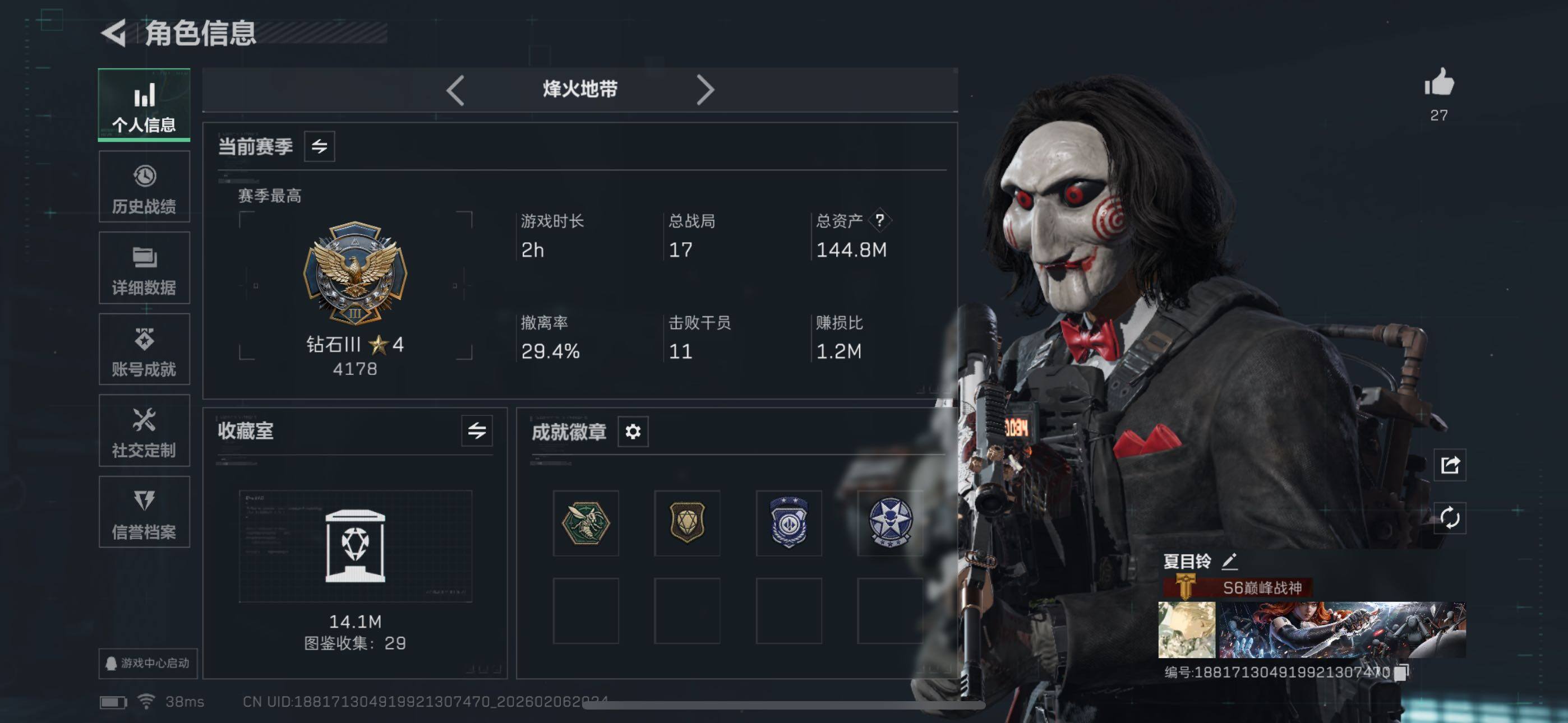 [16516378]【特价出售/店主推荐】144m总资产-5081k哈伏币-60烽火等级-钻石-16战场等级-上等兵