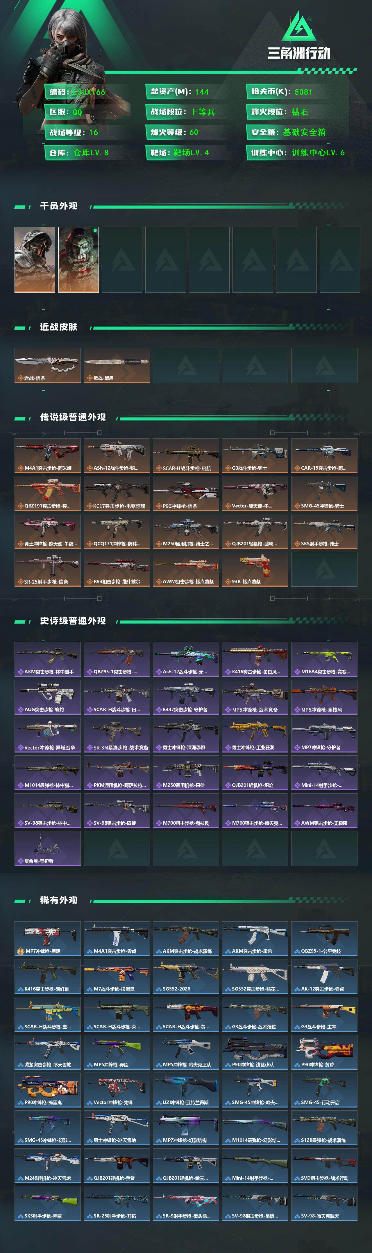[16516378]【特价出售/店主推荐】144m总资产-5081k哈伏币-60烽火等级-钻石-16战场等级-上等兵 【干员外观】:深蓝-不破誓约,红狼-电锯惊魂 【近战皮肤】:近战-信条,近战-黑鹰 【传说外观】:M4A1突击步枪-阿米娅,ASh-12战斗步枪-鹅鸭杀,SCAR-H战斗步枪-启航,G3战斗步枪-骑士,CAR-15突击步枪-阿米娅,腾龙突击步枪-捞点薯条,KC17突击步枪-电锯惊魂,P90冲锋枪-信条,Vector冲锋枪-能天使-午夜邮差,SMG-45冲锋枪-骑士,勇士冲锋枪-能天使-午夜邮差,QCQ171冲锋枪-鹅鸭杀,M250通用机枪-骑士之心,QJB201轻机枪-鹅鸭杀,SKS射手步枪-骑士,SR-25射手步枪-信条,R93狙击步枪-维什戴尔,AWM狙击步枪-捞点薯条,93R-捞点薯条 【史诗外观】:AKM突击步枪-林中猎手,QBZ95-1突击步枪-曙光,ASh-12战斗步枪-无极限,K416突击步枪-冬日风情,M16A4突击步枪-竞赛选手,AUG突击步枪-蝮蛇,SCAR-H战斗步枪-囚徒,K437突击步枪-守护者,MP5冲锋枪-战术竞备,MP5冲锋枪-竞技风,Vector冲锋枪-异域战争,SR-3M紧凑突击步枪-战术竞备,勇士冲锋枪-深海恐惧,勇士冲锋枪-工业狂潮,MP7冲锋枪-守护者,M1014霰弹枪-林中猎手,PKM通用机枪-阿萨拉特攻,M250通用机枪-囚徒,QJB201轻机枪-炽焰,Mini-14射手步枪-守护者,SV-98狙击步枪-林中猎手,SV-98狙击步枪-囚徒,M700狙击步枪-竞技风,M700狙击步枪-哈夫克警备,AWM狙击步枪-无极限,复合弓-守护者 【稀有外观】:MP7冲锋枪-黑潮,M4A1突击步枪-零点,AKM突击步枪-战术演练,AKM突击步枪-肃杀,QBZ95-1突击步枪-公平竞技,K416突击步枪-碳纤维,M7战斗步枪-捣蛋鬼,SG552突击步枪-2026,SG552突击步枪-贴花艺术,AK-12突击步枪-零点,SCAR-H战斗步枪-童趣,SCAR-H战斗步枪-荣耀列队,SCAR-H战斗步枪-黄昏,G3战斗步枪-战术演练,G3战斗步枪-主宰,腾龙突击步枪-冰天雪地,MP5冲锋枪-弄臣,MP5冲锋枪-哈夫克卫队,P90冲锋枪-浅鲨小队,P90冲锋枪-黄昏,P90冲锋枪-捣蛋鬼,Vector冲锋枪-先锋,UZI冲锋枪-亚特兰蒂斯,SMG