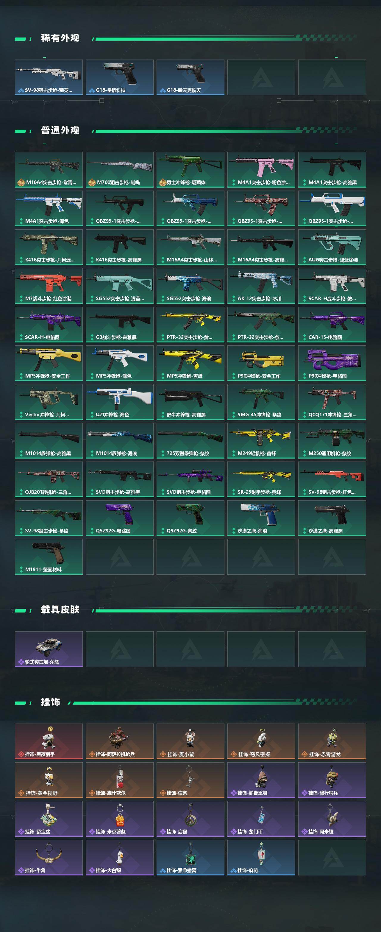 【稀有外观】:MP7冲锋枪-黑潮,M4A1突击步枪-零点,AKM突击步枪-战术演练,AKM突击步枪-肃杀,QBZ95-1突击步枪-公平竞技,K416突击步枪-碳纤维,M7战斗步枪-捣蛋鬼,SG552突击步枪-2026,SG552突击步枪-贴花艺术,AK-12突击步枪-零点,SCAR-H战斗步枪-童趣,SCAR-H战斗步枪-荣耀列队,SCAR-H战斗步枪-黄昏,G3战斗步枪-战术演练,G3战斗步枪-主宰,腾龙突击步枪-冰天雪地,MP5冲锋枪-弄臣,MP5冲锋枪-哈夫克卫队,P90冲锋枪-浅鲨小队,P90冲锋枪-黄昏,P90冲锋枪-捣蛋鬼,Vector冲锋枪-先锋,UZI冲锋枪-亚特兰蒂斯,SMG