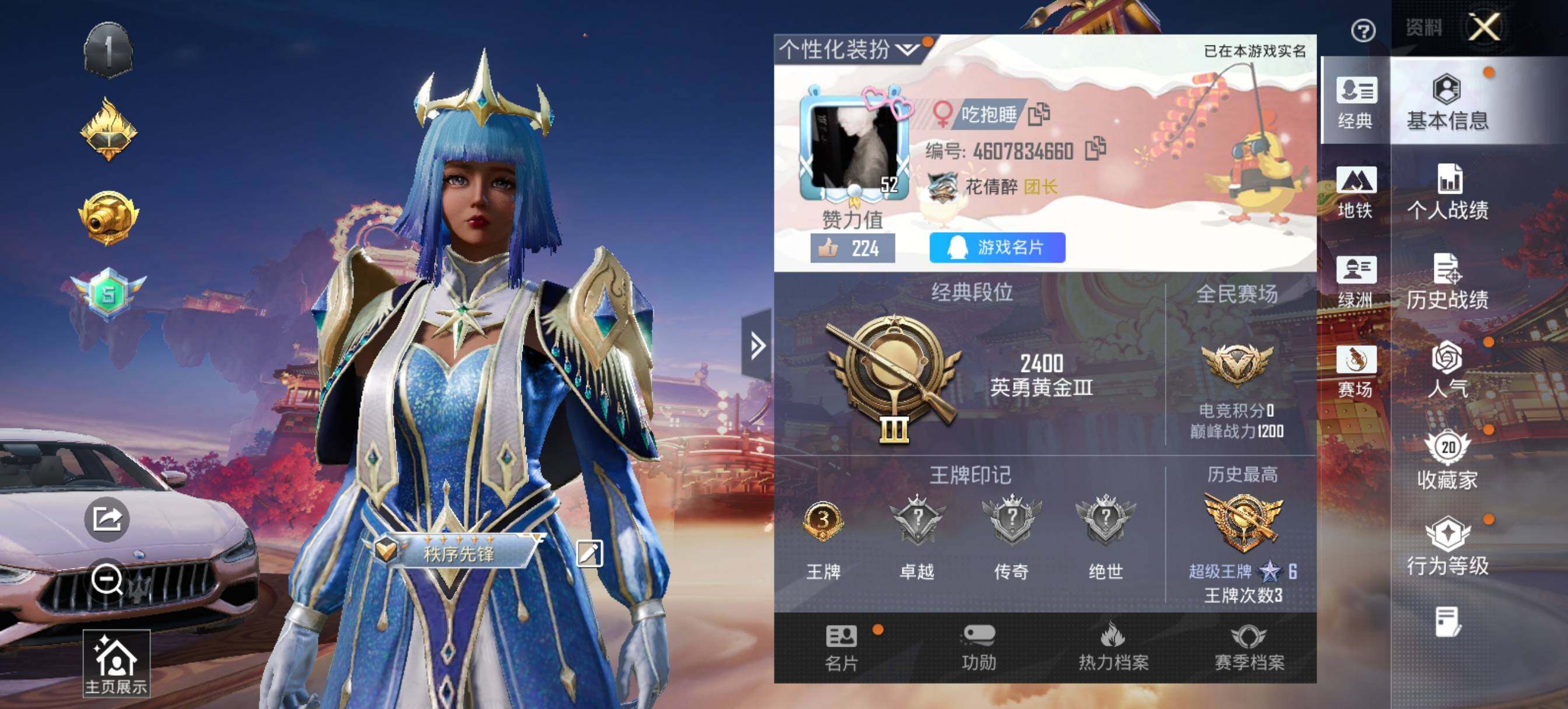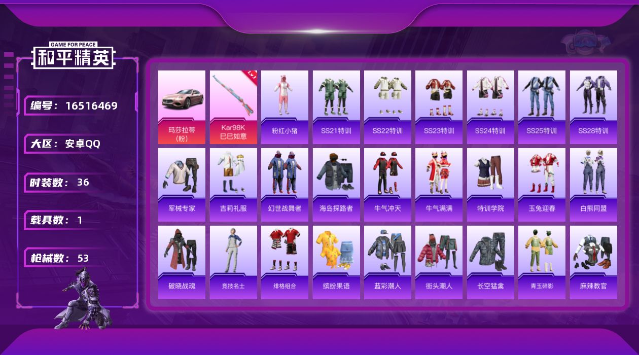 - PX_2095480- 安卓手Q-7王牌印记-1粉装-3特效枪-0载具-28791热力值-57套装-101枪皮-2卓越印记-1传奇印记 【1粉装】,罗征 【3特效枪】M416-电玩时刻-5级 AUG-暖羊咩咩-5级 Kar98K-巳巳如意-5级 【1稀有紫装】,龟仙人, 【57稀有时装】,SS31特训,SS33特训,SS32特训,彩虹兔,蓝冰羽,霓虹热舞,雪绒豹,恋语绒绒,SS34特训,紫幽梦,