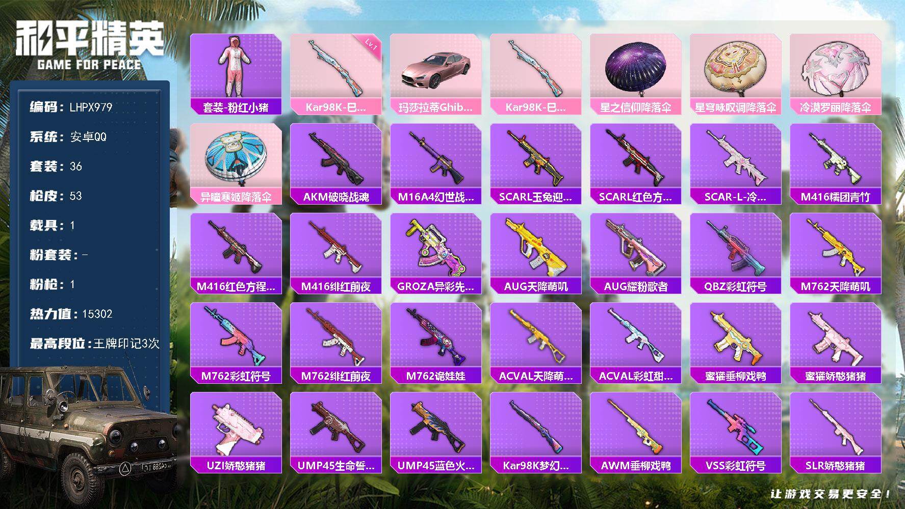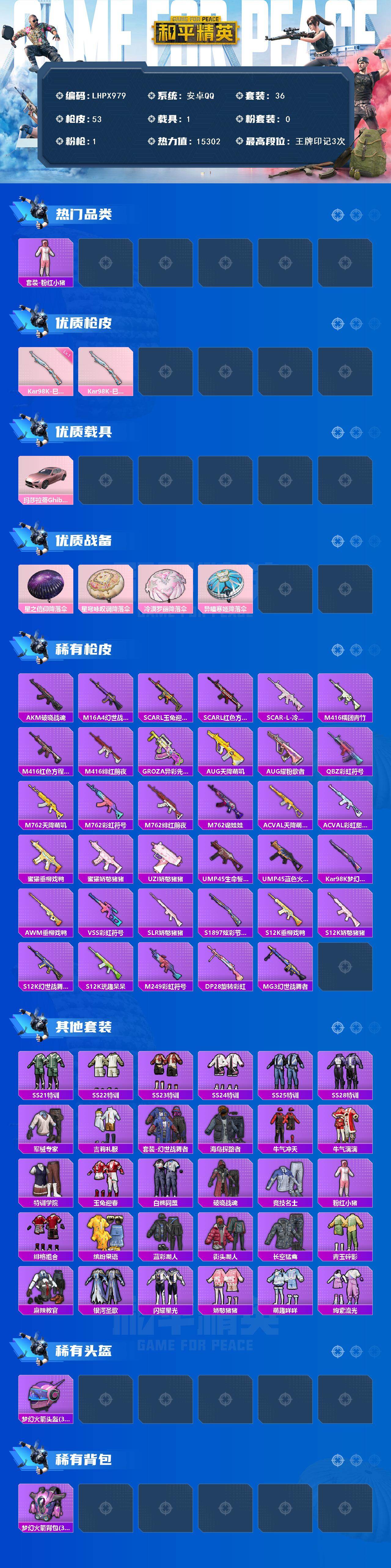 [16516469]可二次【特价出售/店主推荐】安卓 手Q-0粉装-1特效枪-1载具-0粉色飞行器-15302热力值-3王牌印记-36套装-53枪皮 【热门品类】:套装-粉红小猪 【粉色枪皮等级】:Kar98K-巳巳如意(一级) 【粉色载具】:玛莎拉蒂Ghibli(粉) 【粉色枪皮】:Kar98K-巳巳如意 【粉色降落伞】:星之信仰降落伞,星穹咏叹调降落伞,冷漠罗丽降落伞,异瞳寒姬降落伞 【稀有枪皮】:AKM-破晓战魂,M16A4-幻世战舞者,SCAR-L-玉兔迎春,SCAR-L-红色方程式,SCAR-L-冷漠罗丽,M416-糯团青竹,M416-红色方程式,M416-绯红前夜,GROZA-异彩先驱,AUG-天降萌叽,AUG-耀粉歌者,QBZ-彩虹符号,M762-天降萌叽,M762-彩虹符号,M762-绯红前夜,M762-诡娃娃,AC-VAL-天降萌叽,AC-VAL-彩虹甜喵,蜜獾-垂柳戏鸭,蜜獾-娇憨猪猪,UZI-娇憨猪猪,UMP45-生命誓言,UMP45-蓝色火焰,Kar98K-梦幻火箭,AWM-垂柳戏鸭,VSS-彩虹符号,SLR-娇憨猪猪,S1897-炫彩节奏,S12K-玩趣呆呆,S12K-垂柳戏鸭,S12K-娇憨猪猪,S12K-幻世战舞者,M249-彩虹符号,DP-28-旋转彩虹,MG3-幻世战舞者 【其他套装】:套装-SS21特训,套装-SS22特训,套装-SS23特训,套装-SS24特训,套装-SS25特训,套装-SS28特训,套装-军械专家,套装-吉莉礼服,套装-幻世战舞者,套装-海岛探路者,套装-牛气冲天,套装-牛气满满,套装-特训学院,套装-玉兔迎春,套装-白熊同盟,套装-破晓战魂,套装-竞技名士,套装-粉红小猪,套装-绯格组合,套装-缤纷果语,套装-蓝彩潮人,套装-街头潮人,套装-长空猛禽,套装-青玉碎影,套装-麻辣教官,套装-银河圣歌,套装-闪耀星光,套装-娇憨猪猪,套装-萌趣咩咩,套装-绚紫流光 【稀有头盔】:梦幻火箭头盔(3级) 【稀有背包】:梦幻火箭背包(3级) 【营地ID】:905702611