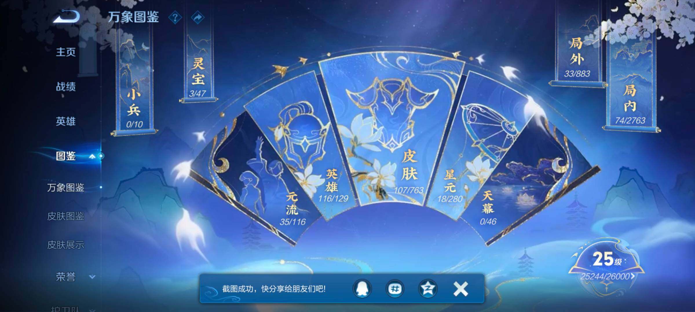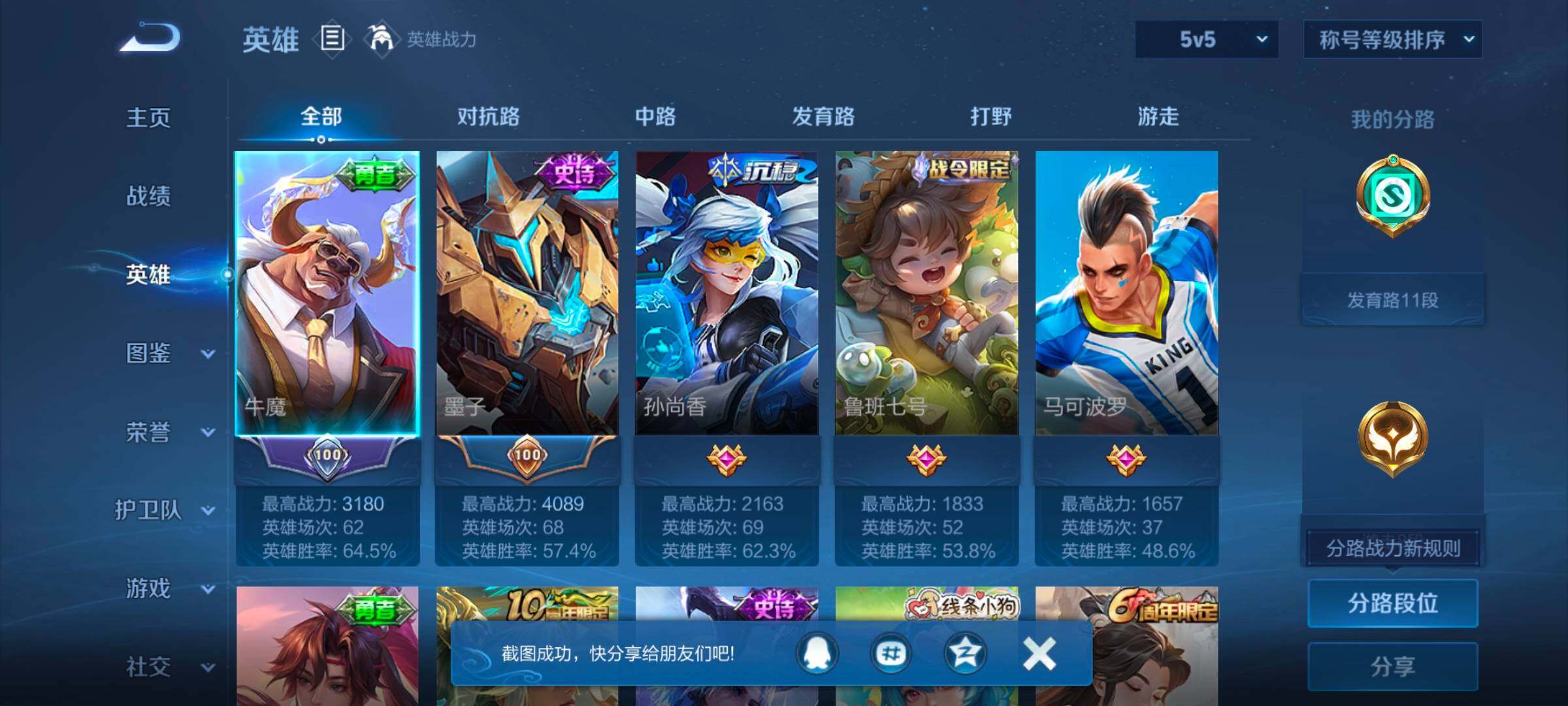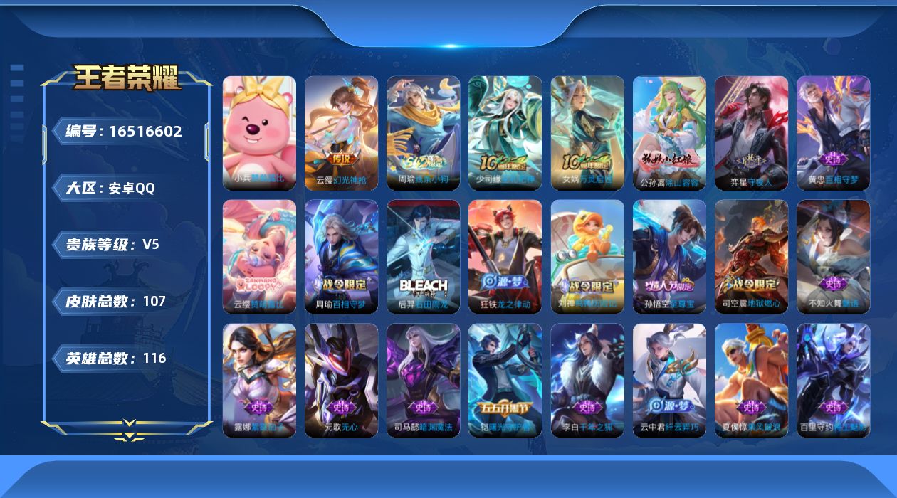 - PX_2082985-贵族等级: V5 英雄数: 61 皮肤数: 51 传说皮: 末日机甲-孙策,幻光神枪 限定皮: 山海·玄木吟,鸣野蒿,愿照·山河定,愿照·九州拓
