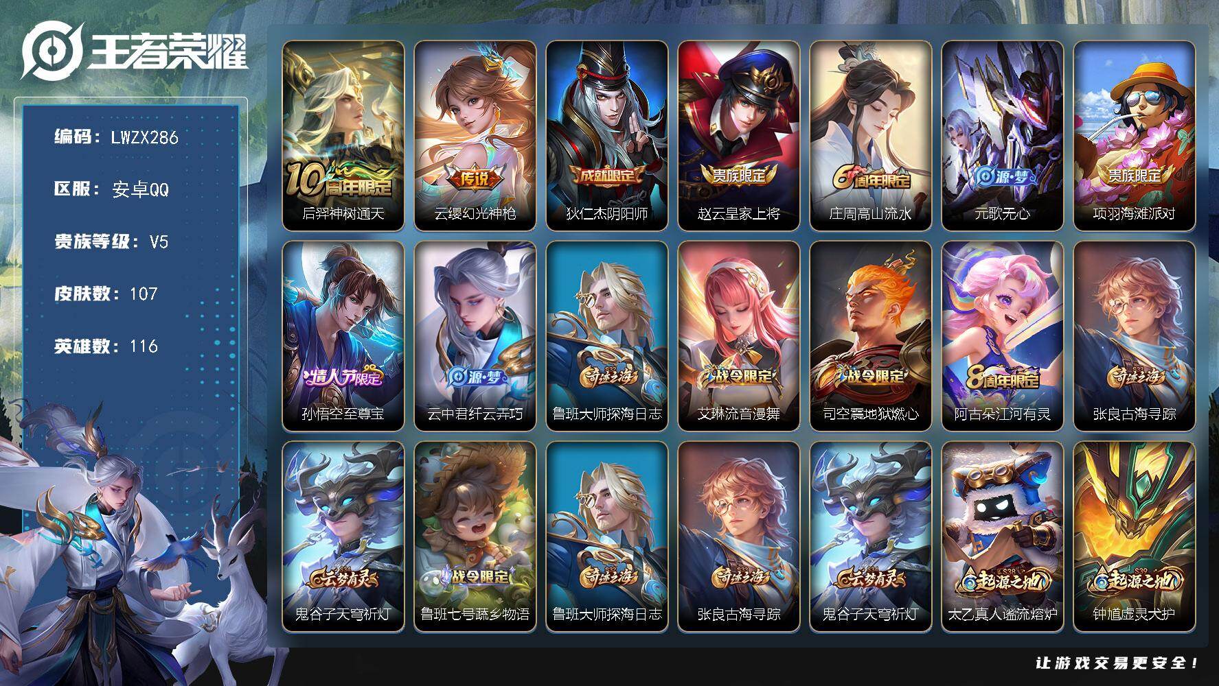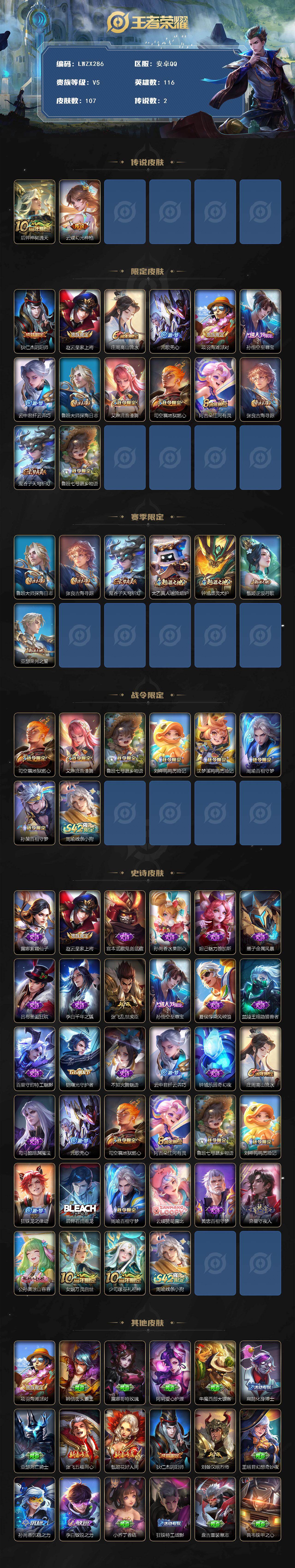 [16516602]【特价出售/店主推荐】安卓Q-V5-永恒钻石IV段位-116英雄-107皮肤-2传说-33史诗