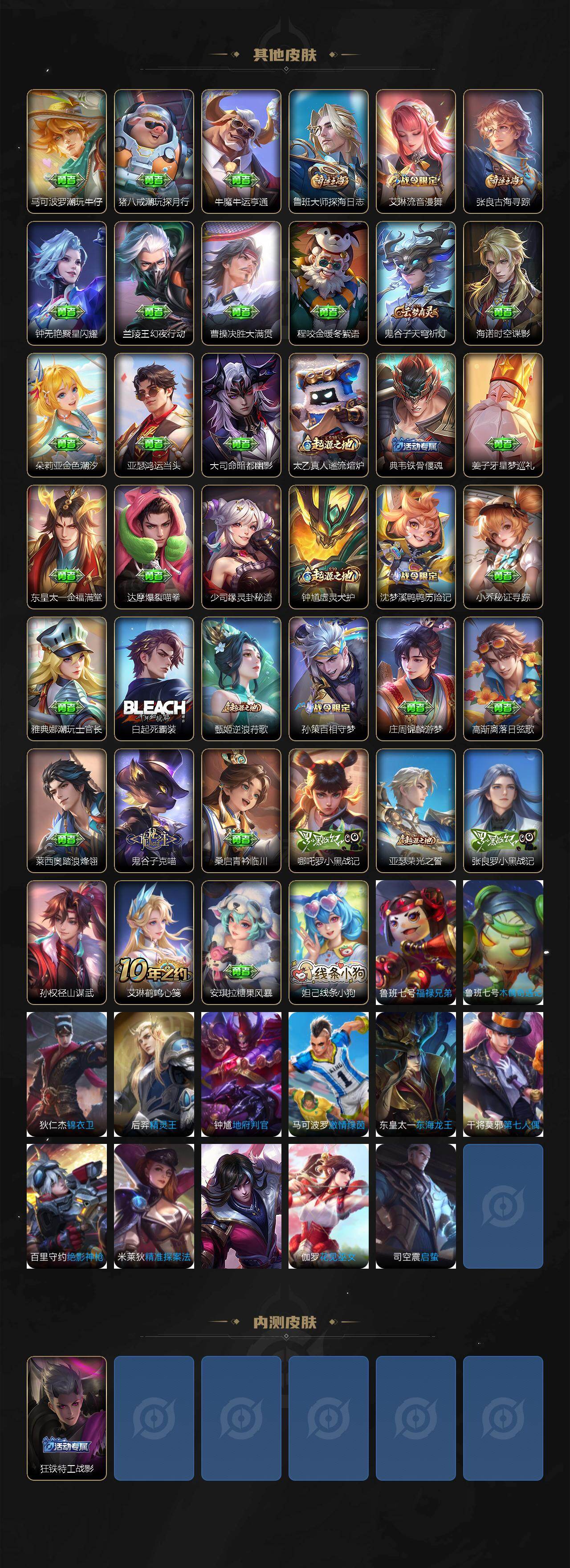 【其他皮肤】:项羽海滩派对,韩信街头霸王,露娜哥特玫瑰,阿轲爱心护理,牛魔西部大镖客,扁鹊化身博士,亚瑟死亡骑士,张飞五福同心,甄姬花好人间,狄仁杰阴阳师,刘备汉昭烈帝,王昭君幻想奇妙夜,孙尚香沉稳之力,李白敏锐之力,小乔丁香结,狂铁特工战影,盘古重装意志,典韦铁甲之心,马可波罗潮玩牛仔,猪八戒潮玩探月行,牛魔牛运亨通,鲁班大师探海日志,艾琳流音漫舞,张良古海寻踪,钟无艳聚星闪耀,兰陵王幻夜行动,曹操决胜大满贯,程咬金暖冬絮语,鬼谷子天穹祈灯,海诺时空谍影,朵莉亚金色潮汐,亚瑟鸿运当头,大司命暗都幽影,太乙真人谧流熔炉,典韦铁骨偃魂,姜子牙星梦巡礼,东皇太一金福满堂,达摩爆裂喵拳,少司缘灵卦秘语,钟馗虚灵犬护,沈梦溪鸭鸭历险记,小乔秘证寻踪,雅典娜潮玩士官长,白起死霸装,甄姬逆浪荇歌,孙策百相守梦,庄周锦麟游梦,高渐离落日弦歌,莱西奥踏浪烽翎,鬼谷子克喵,桑启青衿临川,哪吒罗小黑战记,亚瑟荣光之誓,张良罗小黑战记,孙权径