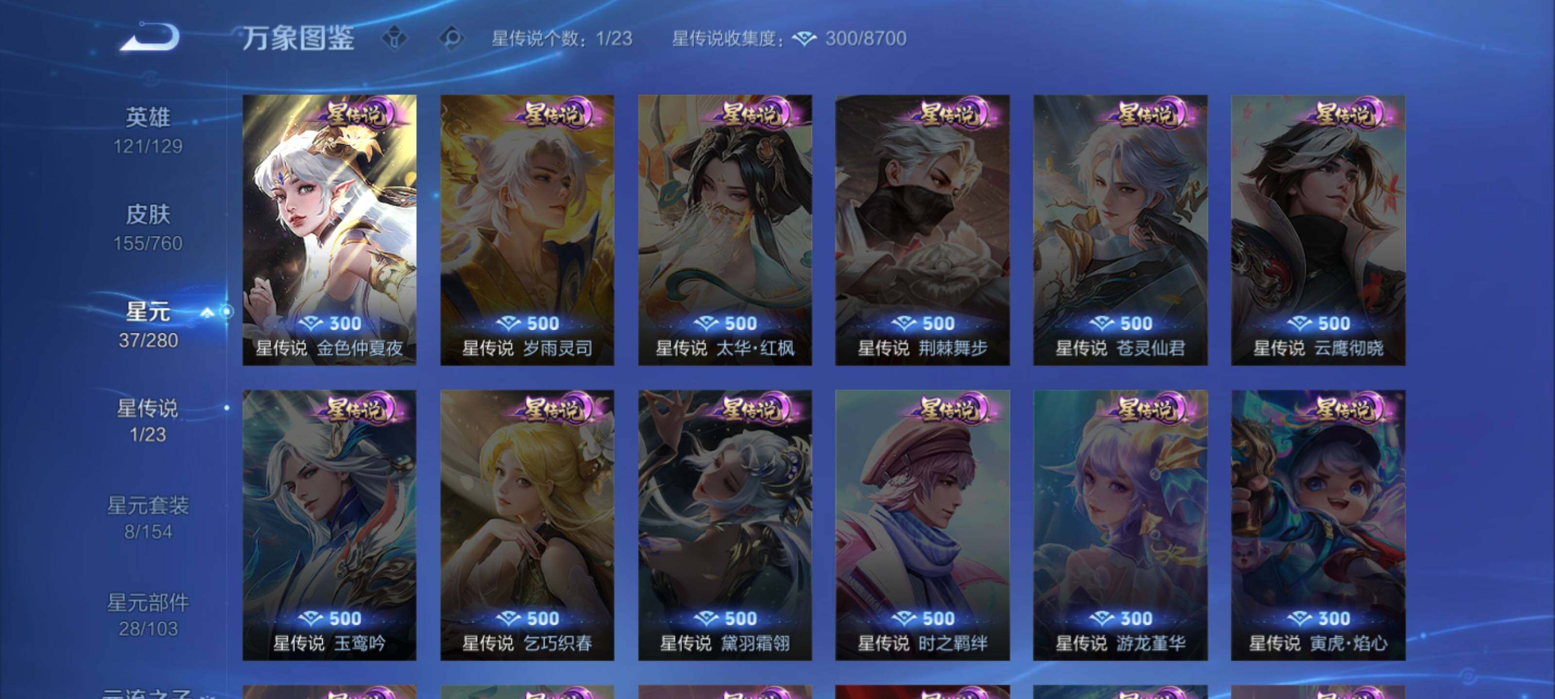 亚瑟狮心王,庄周蜃楼王,孙膑妖精王,扁鹊炼金王,虞姬凯尔特女王,白起狰,太乙真人饕餮,曹操烛龙,芈月重明,典韦穷奇,狂铁御狮,米莱狄御霄,牛魔御旌,盾山御銮,夏侯惇朔风刀,明世隐疑决卦,老夫子醍醐杖,鬼谷子原初探秘者,狄仁杰万华元夜,程咬金演武夺筹,钟馗驱傩正仪,吕布猎兽之王,嬴政白昼王子,钟馗神迹守卫,鲁班七号狮舞东方,弈星混沌棋