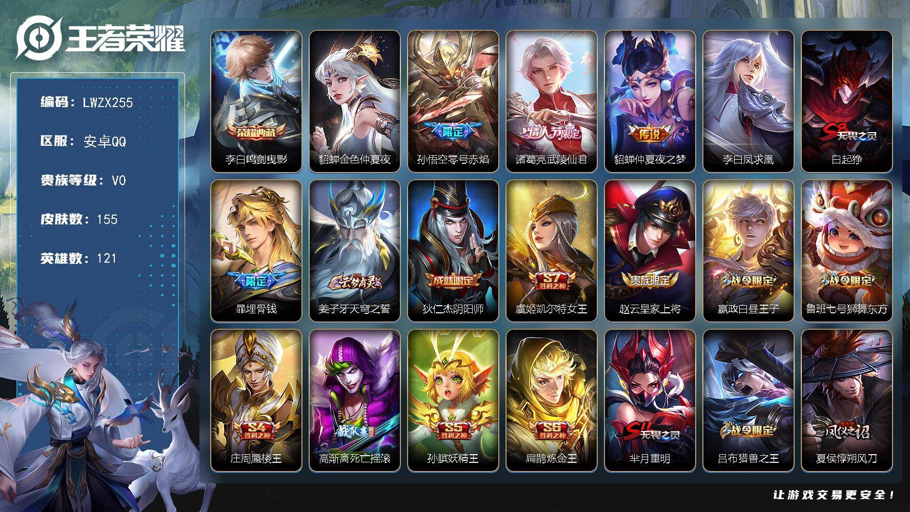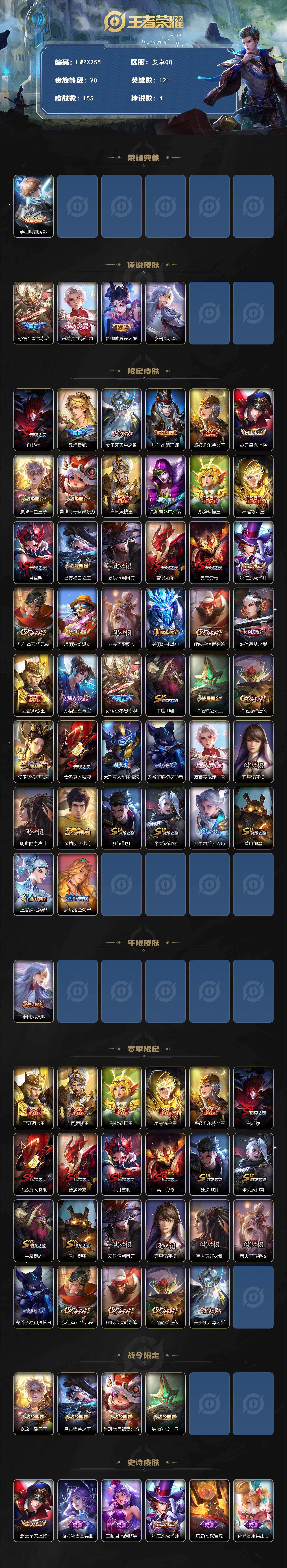 [16518952]【特价出售/店主推荐】安卓Q-V0-永恒钻石V段位-121英雄-155皮肤-1典藏皮肤-4传说-29史诗