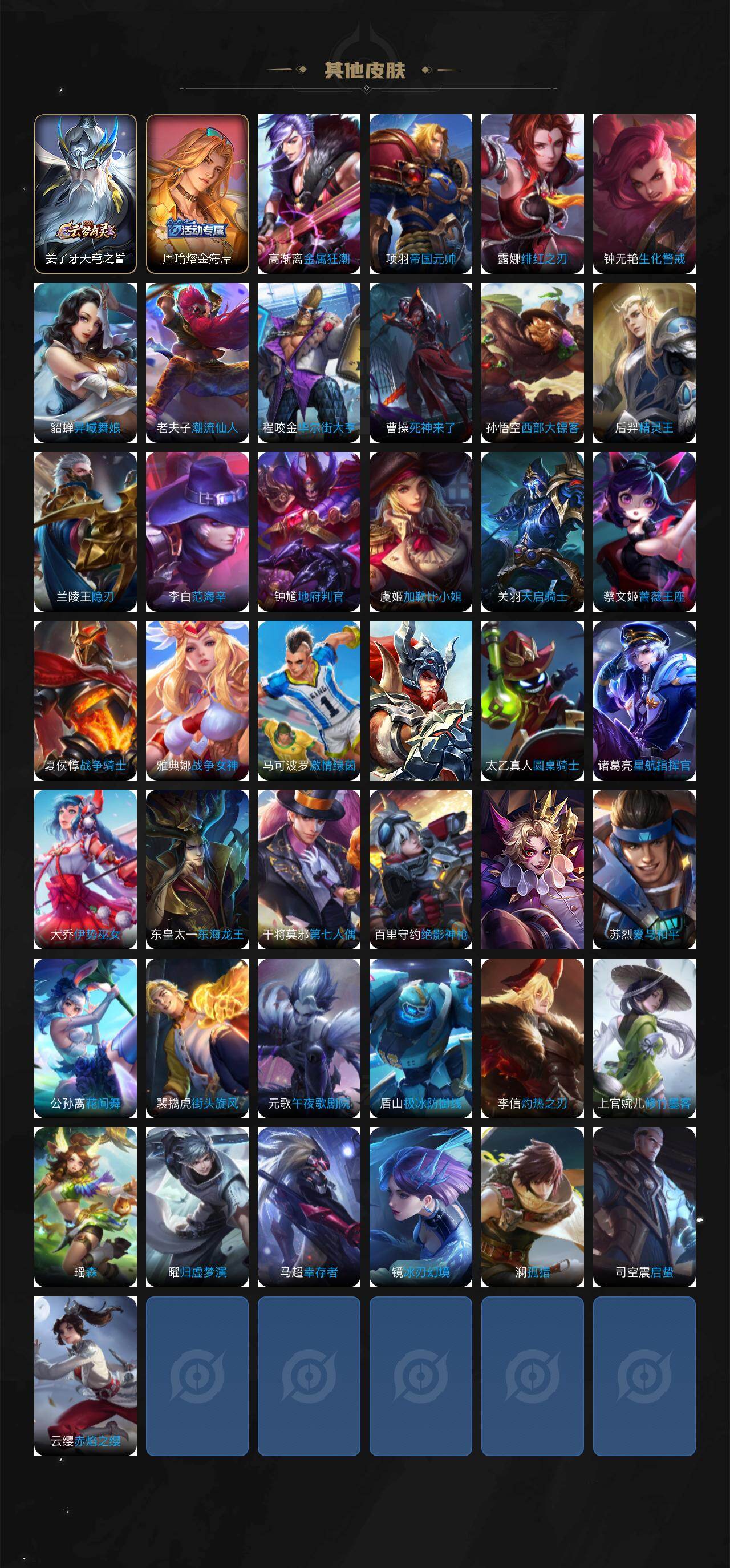 【限定皮肤】:白起狰,暃埋骨钱,姜子牙天穹之誓,狄仁杰阴阳师,虞姬凯尔特女王,赵云皇家上将,嬴政白昼王子,鲁班七号狮舞东方,庄周蜃楼王,高渐离死亡摇滚,孙膑妖精王,扁鹊炼金王,芈月重明,吕布猎兽之王,夏侯惇朔风刀,曹操烛龙,典韦穷奇,狄仁杰魔术师,狄仁杰万华元夜,项羽海滩派对,老夫子醍醐杖,关羽冰锋战神,程咬金演武夺筹,韩信逐梦之影,亚瑟狮心王,孙悟空至尊宝,孙悟空零号赤焰,牛魔御旌,钟馗神迹守卫,钟馗驱傩正仪,杨玉环遇见飞天,太乙真人饕餮,太乙真人华丽摇滚,鬼谷子原初探秘者,诸葛亮武陵仙君,弈星混沌棋,明世隐疑决卦,裴擒虎李小龙,狂铁御狮,米莱狄御霄,云中君纤云弄巧,盾山御銮,上官婉儿梁祝,周瑜熔金海岸