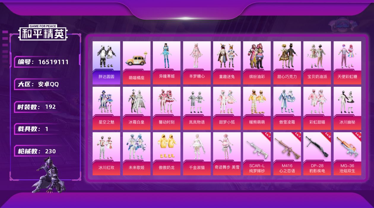 [16519111]安卓 手Q-21粉装-8特效枪-1载具-2粉色飞行器-79384热力值-14王牌印记-192套装-230枪皮 【热门品类】:粉装-童趣迷兔,粉装-缤纷油彩,套装-浪漫天命,套装-胖达圆圆,套装-潮萌小黄鸭,套装-糯粉咩咩,套装-软软马卡龙,角色-六号稻草人,套装-红熊茄茄 【粉色套装】:粉装-甜心巧克力,粉装-宝贝奶油派,粉装-天使彩虹糖,粉装-缤纷油彩,粉装-星空之魅,粉装-冰霜白皇,粉装-童趣迷兔,粉装-馨动时刻,粉装-岚岚物语,粉装-甜梦小狐,粉装-暖熊萌萌,粉装-傲雪凌霜,粉装-彩虹甜喵,粉装-冰川幽秘,粉装-冰川红玫,粉装-未来歌姬,粉装-傲傲奶龙,角色-千金淑猫,角色-奇迹舞步 美雪,角色-羊梦糖心,角色-异瞳寒姬 【粉色枪皮等级】:SCAR-L-纯梦嫁纱(七级),M416-心之恋语(七级),GROZA-镜光银凌(五级),AUG-暖羊咩咩(五级),AKS-74U-森灵之息(五级),Kar98K-巳巳如意(五级),DP-28-豹影疾电(五级),MG-36-沧焰双生(五级) 【粉色载具】:萌喵橘座 【粉色枪皮】:SCAR-L-纯梦嫁纱,M416-心之恋语,GROZA-镜光银凌,AUG-暖羊咩咩,AKS-74U-森灵之息,Kar98K-巳巳如意,DP-28-豹影疾电,MG-36-沧焰双生 【粉色飞行器】:冰川粉黛飞行器 【粉色降落伞】:甜心宝贝降落伞,春暖花开降落伞,橘柚倾心降落伞,垂柳戏鸭降落伞,千面幻镜降落伞,冰川粉黛降落伞,莲影清波降落伞,镜光幻境降落伞,蜜语绒猫降落伞,奇迹舞步降落伞,异瞳寒姬降落伞,炫彩糖果降落伞 【稀有套装】:套装-绒宝小鹅,套装-巳巳如意,套装-雪国风尚,套装-炫彩糖果,套装-顽皮橙,套装-雏菊兔兔,套装-萝兰蝴蝶,套装-小熊娃娃,套装-糖糖葫芦,套装-青团波波,套装-棉花软糖,套装-燕燕于飞,套装-鱼渊荷华,玩偶服-小狗蛇点点,套装-晶辉守护,角色-糖霜甜心,角色-蜜桃派对,套装-萌萌史莱姆,套装-粉恋花,套装-紫幽梦,套装-蓝冰羽,角色-猎影月神,角色-六号稻草人,套装-果冻柠檬,玩偶服-懒羊羊,角色-绯色魅影,套装-书海巡游,套装-画境星梦,套装-琴音绮想,角色-拉面少女,套装-红釉青花 【稀有枪皮】:AUG-冰晶雪宝,AKM-冰凉西瓜,AKM-墨染幽兰,AKM-生命誓言,AKM-龙的传人,M16A4-红色方程式,M16A
