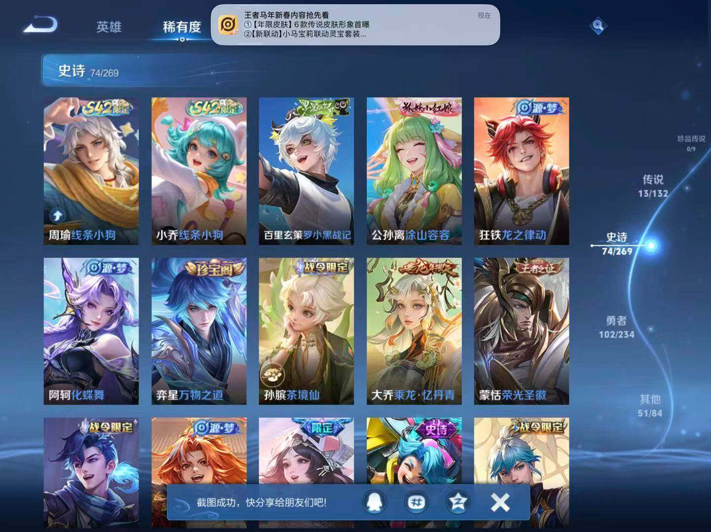 【史诗皮肤】:露娜紫霞仙子,赵云皇家上将,赵云未来纪元,甄姬冰雪圆舞曲,王昭君偶像歌手,狄仁杰魔术师,廉