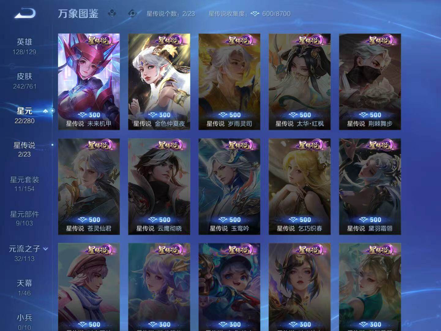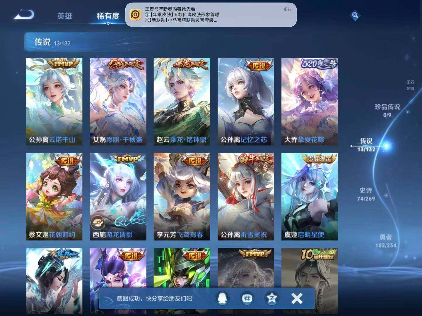 【传说皮肤】:公孙离云诺千山,女娲愿照千秋盛,赵云乘龙铭钟鼎,公孙离记忆之芯,大乔挚爱花嫁,蔡文姬花朝如约,西施游龙清影,李元芳飞鸢探春,公孙离祈雪灵祝,虞姬启明星使,虞姬云霓雀翎,貂蝉仲夏夜之梦,孙尚香末日机甲
