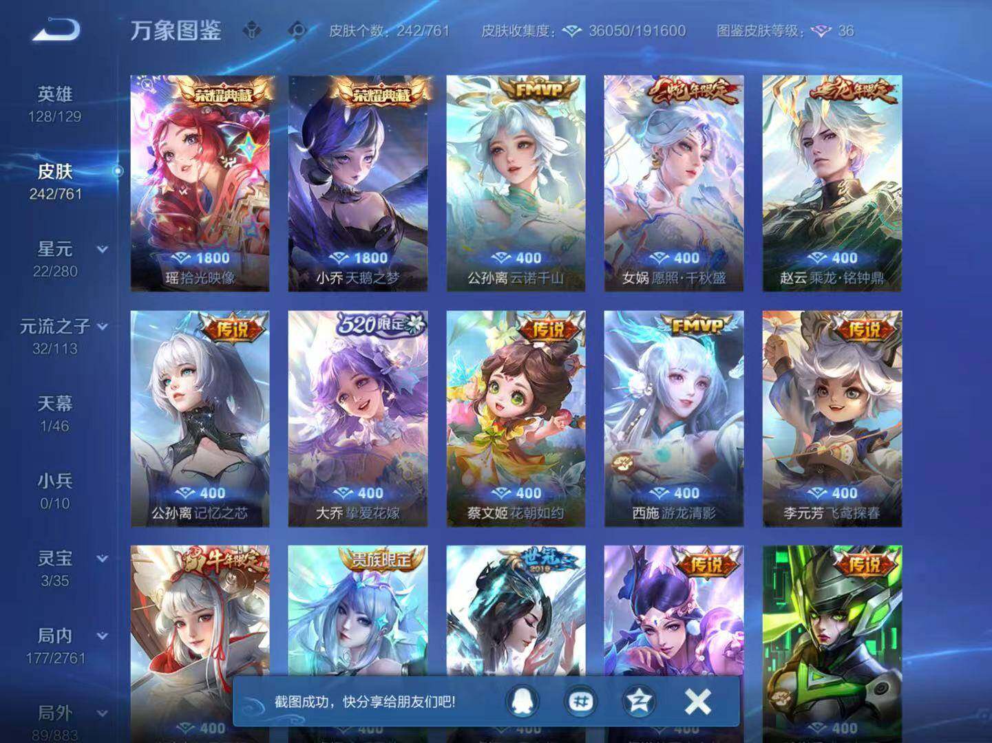 - [14098843]可二次,【店主推荐捡漏号!可直接换绑】,安卓Q-V10-尊贵铂金III段位-128英雄-492皮肤-7典藏-2珍品传说-70传说-153史诗 【英雄全皮】:刘禅全皮,阿轲全皮,达摩全皮,司马懿全皮,刘邦全皮,橘右京全皮,钟馗全皮,鬼谷子全皮,苏烈全皮,狂铁全皮,李信全皮,猪八戒全皮,蒙犽全皮,夏洛特全皮,空空儿全皮,影全皮 【荣耀典藏】:武则天英雄,武则天倪克斯神谕,夏侯惇无限飓风号,小乔天鹅之梦,孙尚香杀手不太冷,鲁班七号星空梦想,程咬金活力突击,李白鸣剑曳影 【珍品传说】:马可波罗怪盗基德,孙策时之奇旅 【传说皮肤】:后羿神树通天,司马懿九山相柳,后羿千劫归真,司空震愿照山河定,女娲愿照千秋盛,妲己愿照众生和,澜愿照九州拓,蔡文姬愿照福禄聚,虞姬愿照岁时盈,云缨幻光神枪,裴擒虎祥瑞亨通,桑启鸣野蒿,夏侯惇霜北刀,典韦战鼓燎原,艾琳觅芳踪,鲁班七号时之奇旅,东皇太一灼幽烈阳,张飞百相守梦,夏洛特浮生妄,虞姬无限倾心,项羽无限倾心,伽罗炽翼辉光,孙悟空齐天大圣,小乔山海琳琅生,曜山海苍雷引,李信山海炽霜斩,吕布怒海麟威,李白诗剑行,不知火舞绯月行,百里守约碎云,橘右京枫霜尽,马可波罗深海之息,马超无双飞将,大乔挚爱花嫁,孙策挚爱之约,孙策末日机甲,赵云淬星耀世,王昭君乞巧织情,西施游龙清影,曜李逍遥 ,周瑜音你心动,小乔音你心动,李元芳飞鸢探春,兰陵王默契交锋,公孙离祈雪灵祝,诸葛亮时雨天司,铠绛天战甲,镜炽阳神光,虞姬启明星使,孙悟空零号赤焰,曜云鹰飞将,李信一念神魔,刘备时之恋人,张良黄金白羊座,干将莫邪久胜战神,虞姬云霓雀翎,达摩黄金狮子座,百里玄策白虎志,花木兰冠军飞将,梦奇胖达荣荣,后羿黄金射手座,杨戬永曜之星,诸葛亮武陵仙君,貂蝉仲夏夜之梦,李白凤求凰,孙尚香末日机甲,宫本武藏地狱之眼,孙悟空地狱火,吕布天魔缭乱,狄仁杰超时空战士 【限定皮肤】:白起狰,夏侯惇霜北刀,蒙犽顽岩魄,姜子牙天穹之誓,狄仁杰阴阳师,虞姬凯尔特女王,小乔山海琳琅生,赵云皇家上将,墨子神迹守卫,嬴政白昼王子,孙尚香蔷薇恋人,鲁班七号狮舞东方,鲁班七号乒乒小将,鲁班七号时之奇旅,庄周云端筑梦师,庄周高山流水,高渐离死亡摇滚,高渐离玩趣恶龙,阿轲迷踪丽影,钟无艳超时空战士,孙膑妖精王,扁鹊炼金王,扁鹊奇幻香踪,白起夜都怪侠,芈月重明,芈月白晶晶,芈月幻夜卜梦,吕布天魔缭乱,吕布猎兽之