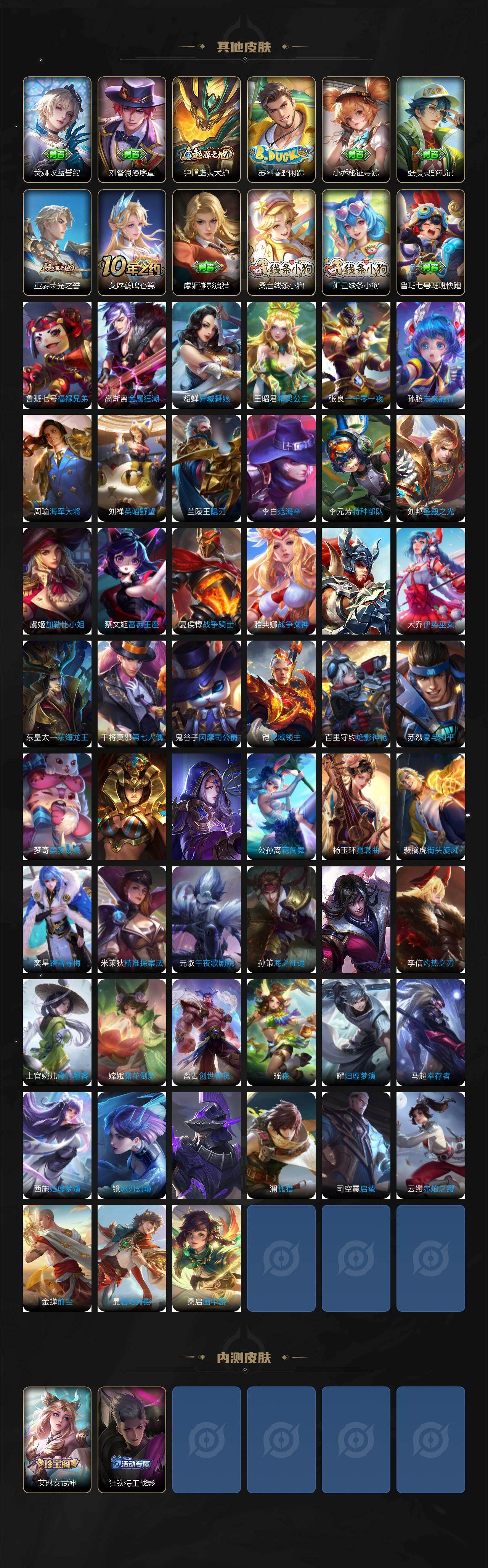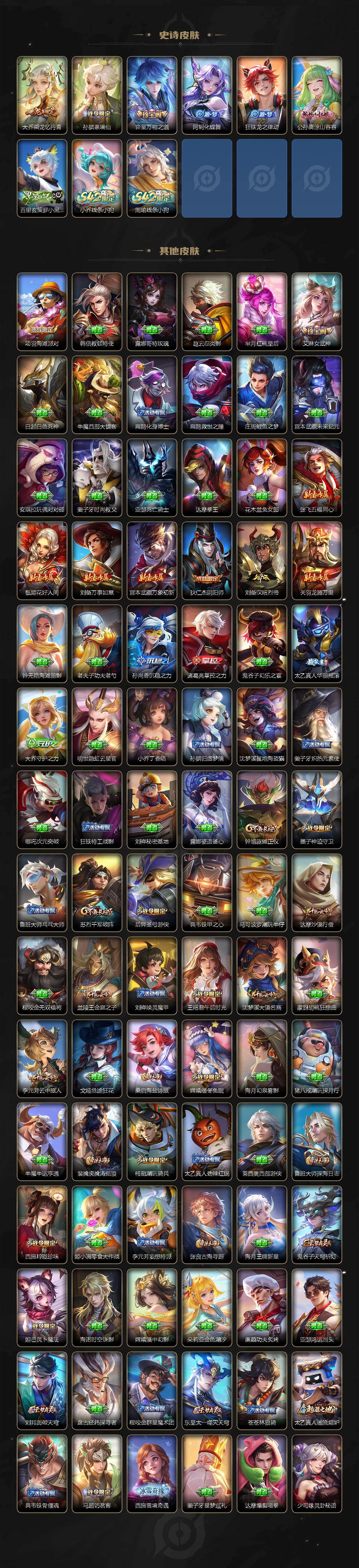 【限定皮肤】:狄仁杰阴阳师,赵云皇家上将,墨子神迹守卫,孙膑寅虎展翼,扁鹊奇幻香踪,元歌无心,马可波罗山海玄木吟,狄仁杰魔术师,达摩沙漠行僧,项羽海滩派对,老夫子航海奇遇记,王昭君午后时光,兰陵王金庭之子,花木兰瑞麟志,后羿圣弓游侠,李元芳云中旅人,虞姬启明星使,钟馗驱傩正仪,杨玉环寅虎心曲,杨戬潮玩骑兵,干将莫邪真爱魔法,雅典娜黎明之约,太乙真人华丽摇滚,大乔挚爱花嫁,苏烈千军破阵,百里玄策原初追逐者,梦奇顽趣,公孙离蜜橘之夏,公孙离祈雪灵祝,公孙离玉兔公主,沈梦溪大漠名商,裴擒虎擒涛扼浪,狂铁电玩高手,瑶山海碧波行,云中君纤云弄巧,上官婉儿神器万象笔,嫦娥如梦令,嫦娥拒霜思,嫦娥暖冬兔眠,西施玲珑珍味,西施至美乘鲤谣,鲁班大师探海日志,桑启海盐诗旅,暃星界游侠,艾琳女武神,张良古海寻踪,蒙犽百解令,蒙恬荣光圣徽,高渐离燃音魔法,妲己灵卜魔法,鬼谷子天穹祈灯,大乔乘龙忆丹青,赵云乘龙铭钟鼎,刘邦剑破天穹,程咬金群星魔术团