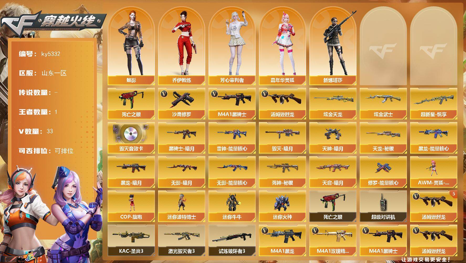 - [11679439]1传说角色 1炫金武器 33V武器 可二次 可修改实名 优质装备:M200-幻神,柯尔特-荣耀世冠白鲨2023,AK47-火麒麟,AK47-黑武士,Barrett-极光,AWM-裁决,加特林-炼狱,屠龙,龙啸,麒麟刺,擎天,斩神刀-雷暴,炽芒蝶刃,龙啸-堕天神,麒麟刺-堕天神 排位资格:有 V武器:AK47-黑鲨,AK47-B-战士,AK-47-猩红传说 王者武器:王者之力-觉醒版 炫金武器:炫金黑骑士