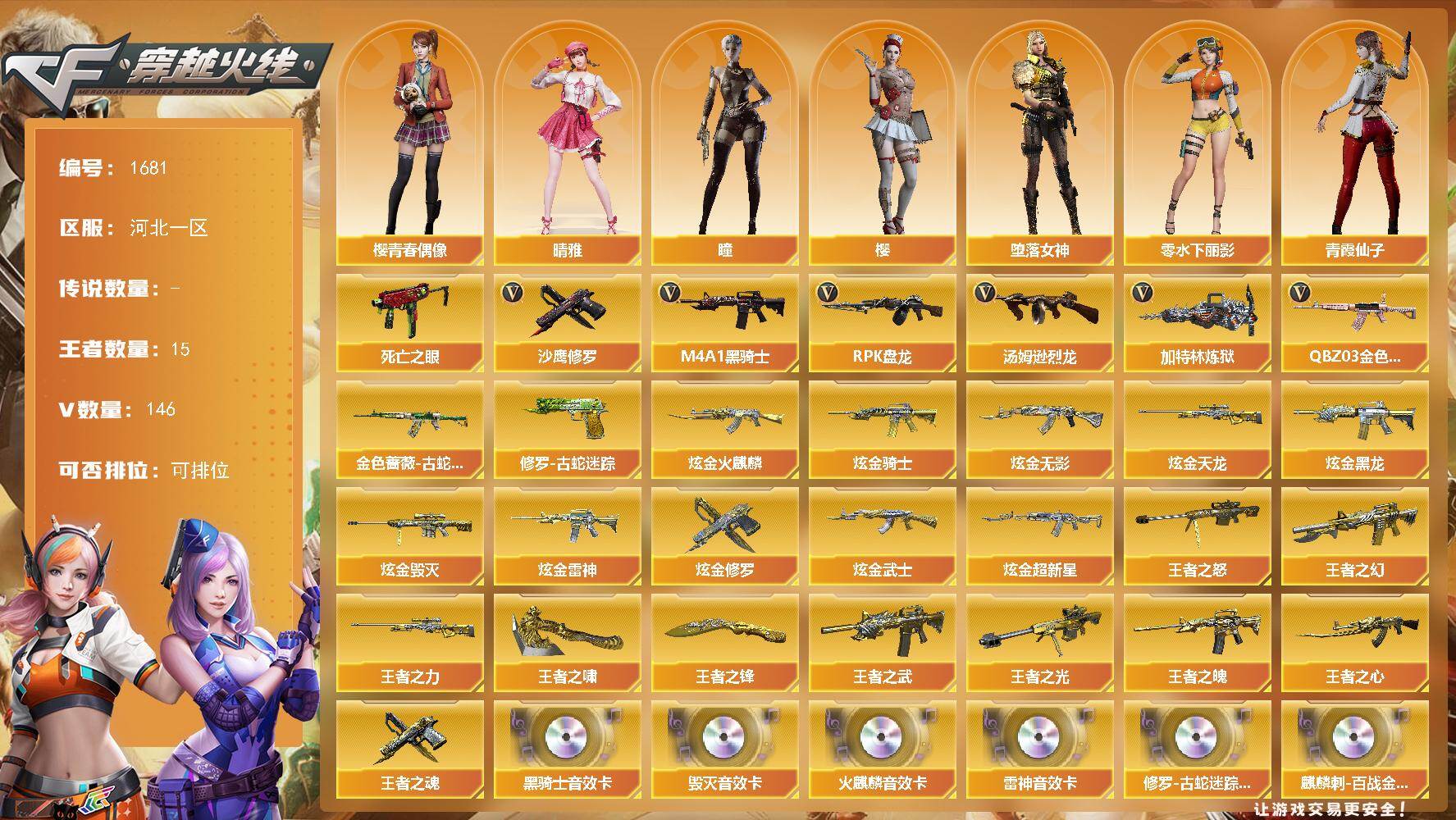 [16523907]河北一区-146V-15王者-18炫金 【热门武器】:QBZ03-金色蔷薇*4,金色蔷薇-古蛇迷踪,修罗-古蛇迷踪,死亡之眼*2,M4A1-黑骑士*5,汤姆逊-烈龙*7,RPK-盘龙*5,加特林-炼狱*5,沙鹰-修罗*6 【王者炫金武器】:王者之幻,王者之武,王者之魄,王者之心,王者之光,王者之怒,王者之力,王者之魂,王者之啸,王者之锋,炫金火麒麟,炫金骑士,炫金无影,炫金黑龙*3,炫金雷神,炫金武士,炫金超新星*4,炫金毁灭*2,炫金天龙*3,炫金修罗 【音效卡】:修罗-古蛇迷踪音效卡,AK47-火麒麟音效卡,M4A1-雷神音效卡,M4A1-黑骑士音效卡,Barrett-毁灭音效卡,麒麟刺-百战金芒-盛典舞曲音效卡,炼狱-百战金芒-庆典舞曲音效卡 【皮肤】:雷神-暗月,雷神-能量核心,雷神-荣耀之魄,雷神-星空,雷神-耀金皮肤,雷神-源计划2.0专属 皮肤,雷神-化蛇 皮肤,M4A1-再燃火线,雷神-神秘按键 皮肤,火麒麟-冠军之心,火麒麟-轻羽皮肤,火麒麟-心动糖果,毁灭-荣耀之怒,毁灭耀金皮肤,毁灭-星空,毁灭-风暴*2,M4A1-千变-孔明皮肤,黑龙-能量核心,黑龙-暗月,黑骑士耀金皮肤,无影-能量核心,无影耀金皮肤,AK47-黑武士-361,战神-粉色甜心皮肤*3,战神-紫绶金章皮肤*3,战神-流金岁月皮肤*3,AWM-天龙-传奇70KG,AWM-天龙-传奇白鲨,极光-能量核心*3,炼狱-星空,屠龙-荣耀之锋,轻型军用手斧-再燃火线,擎天-秘银,麒麟刺-萌杀皮肤 【角色】:樱,瞳,晴雅,堕落女神,蛇隐宗,修道士,空,暗夜-X,初恋灵狐,芳心审判者,风暴女,嘉年华灵狐,娟娟,兰-海滩派对,兰-新年限定,0号玩家,零-水下丽影,灵狐-花神,灵狐者-黄金海岸,龙儿-小淘气,麻雀,玫瑰花神,萌儿,潘多拉-X,潘多拉-甜心教官,潜龙队-X,青霞仙子,蛇姬,斯沃特-X,蜀雪,铁骑-乘风破浪,铁骑荣耀,兔囡囡,铁扇公主-暗灵,雪莉杨-摸金校尉,樱-青春偶像,樱-战斗天使,影武者-X 【人偶武器】:迷你钢铁终结者,迷你救赎猎手,AWM-灵狐-15周年嘉年华*2,迷你深渊冰龙,迷你裂空之翼,迷你曼提柯尔,迷你牛牛*2,迷你生化手雷,生化手雷-机甲核心,闪光弹-小乔 【暴走生化】:死亡之眼*2 【挑战大师】:暴君乱世-超越Max,神圣爆裂者III,激光毁灭者III-白马银枪
