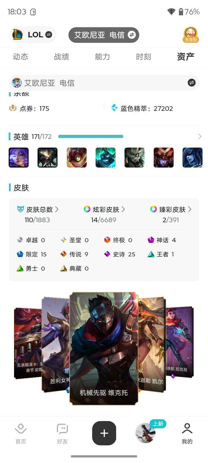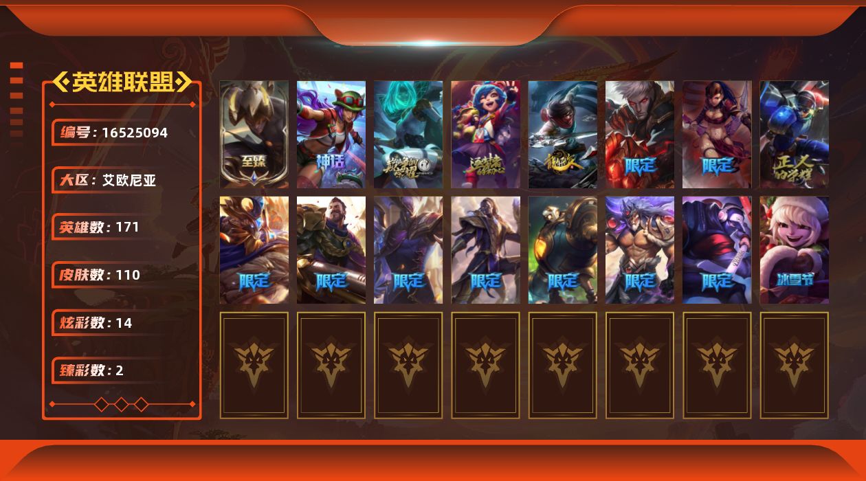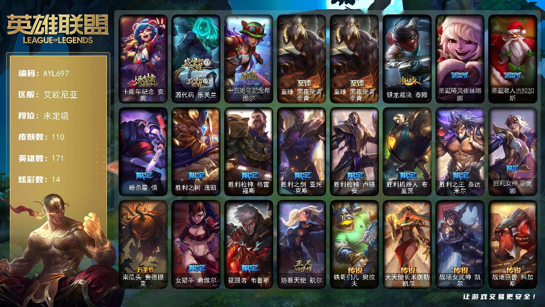 [16525094]【店主推荐捡漏号】未定级段位-171英雄-110皮肤-14炫彩-0终极-4神话-15限定-9传说-25史诗