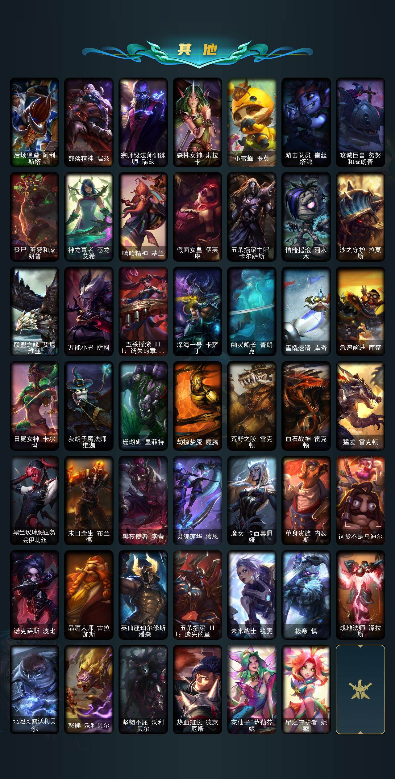 【其他皮肤1】:银河魔装机神安妮,幽蓝梦魇加里奥,逍遥赌侠崔斯特,深渊巨蟹厄加特,黑潮弗拉基米尔,末世天使凯尔,荒野镖客阿利斯塔,后场堡垒阿利斯塔,部落精神瑞兹,宗师级法师训练师瑞兹,森林女神索拉卡,小蜜蜂提莫,游击队员崔丝塔娜,攻城巨兽努努和威朗普,丧尸努努和威朗普,神龙尊者苍龙艾希,嘻哈精神基兰,假面女皇伊芙琳,五杀摇滚主唱卡尔萨斯,情绪摇滚阿木木,沙之守护拉莫斯,联盟之喙艾尼维亚,万能小丑萨科,五杀摇滚III遗失的章节娑娜,深海一号卡萨丁,幽灵船长普朗克,雪橇速滑库奇,急速前进库奇,日冕女神卡尔玛,灰胡子魔法师维迦,珊瑚礁墨菲特,劫掠梦魇魔腾,荒野之咬雷克顿,血石战神雷克顿,猛龙雷克顿,黑色玫瑰假面舞会伊莉丝,末日余生布兰德,黑夜使者李青,灵魂莲华薇恩,魔女卡西奥佩娅,单身贵族内瑟斯,这货不是乌迪尔,诺克萨斯波比,品酒大师古拉加斯,英仙座珀尔修斯潘森,五杀摇滚III遗失的章节莫德凯撒,未来战士锐雯,极寒