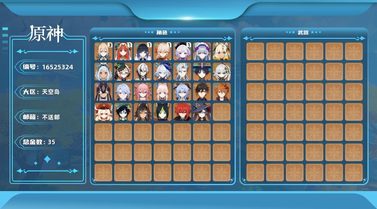 0命阿蕾奇诺,0命芙宁娜,0命那维莱特,0命迪希雅,0命流浪者,0命纳西妲,1命妮露,0命赛诺,0命提纳里,1命夜兰,0命神里绫人,0命八重神子,1命枫原万叶,0命钟离,0命甘雨,0命温迪,0命可莉,0命达达利亚,0命珊瑚宫心海,1命七七,3命琴,0命莫娜,0命迪卢克,0命希诺宁,0命玛拉妮,0命艾梅莉埃,0命梦见月瑞希,0命丝柯克