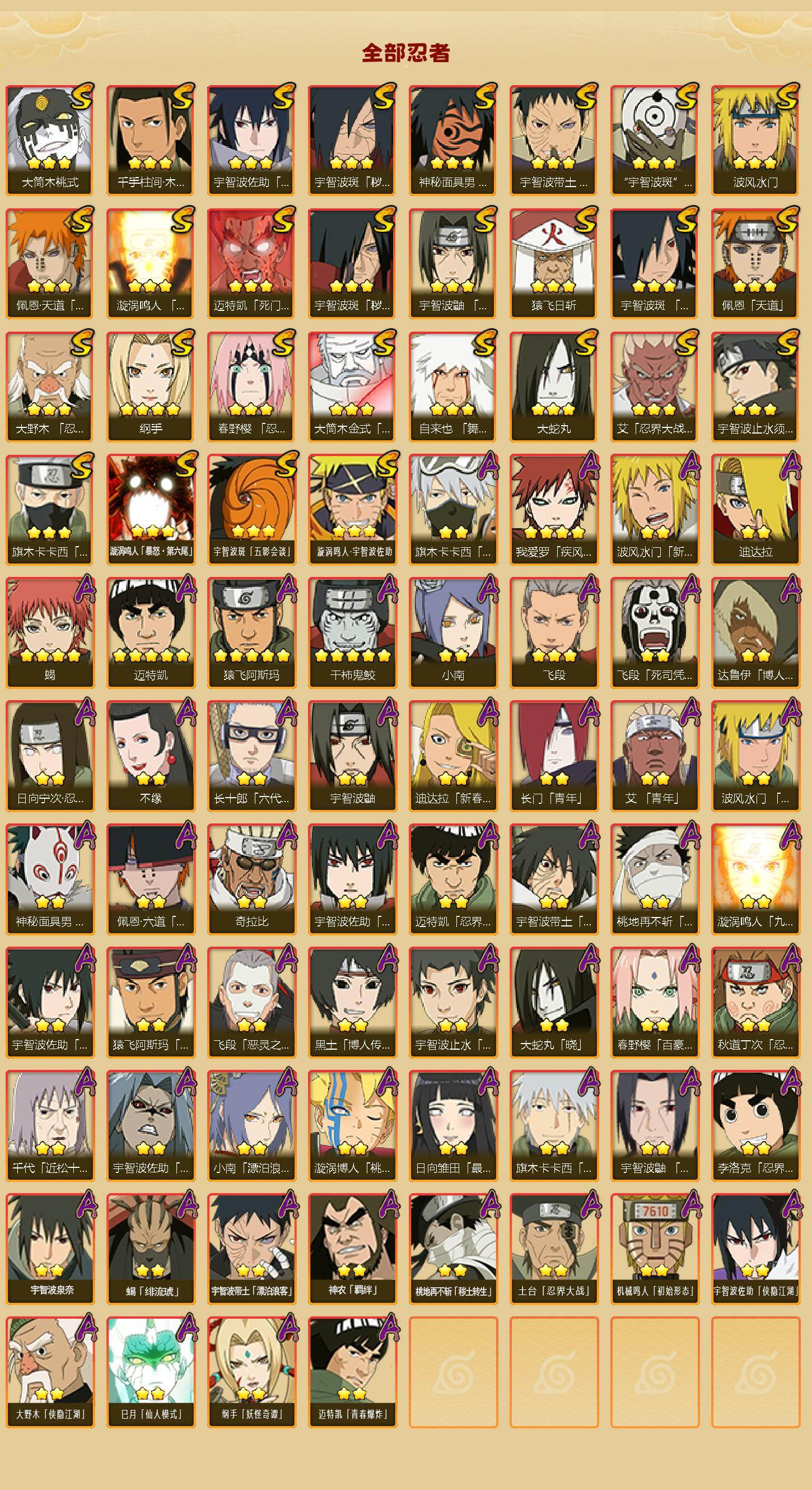 【S级忍者】:宇智波斑「秽土转生」(3星),宇智波斑「秽土转生·解」(3星),大野木「忍界大战」(3星),春野樱「忍界大战」(3星),宇智波带土「忍界大战」(3星),艾「忍界大战」(3星),宇智波鼬「须佐能乎」(3星),宇智波止水「须佐能乎」(3星),旗木卡卡西「须佐能乎」(3星),宇智波斑「木叶创立」(3星),千手柱间「木叶创立」(3星),自来也「舞之豪杰」(3星),大蛇丸(3星),纲手(4星),猿飞日斩(3星),波风水门(3星),神秘面具男「红夜之刃」(3星),漩涡鸣人「九喇嘛连结」(3星),迈特凯「死门」(3星),佩恩「天道」(3星),佩恩·天道「超」(3星),宇智波佐助「永恒万花筒」(3星),宇智波斑 「白面具」(3星宇智波斑「白面具」),大筒木金式(3星),大筒木桃式(3星),漩涡鸣人「暴怒·第六尾」(3星),宇智波斑「五影会谈」(3星),漩涡鸣人·宇智波佐助(3星)