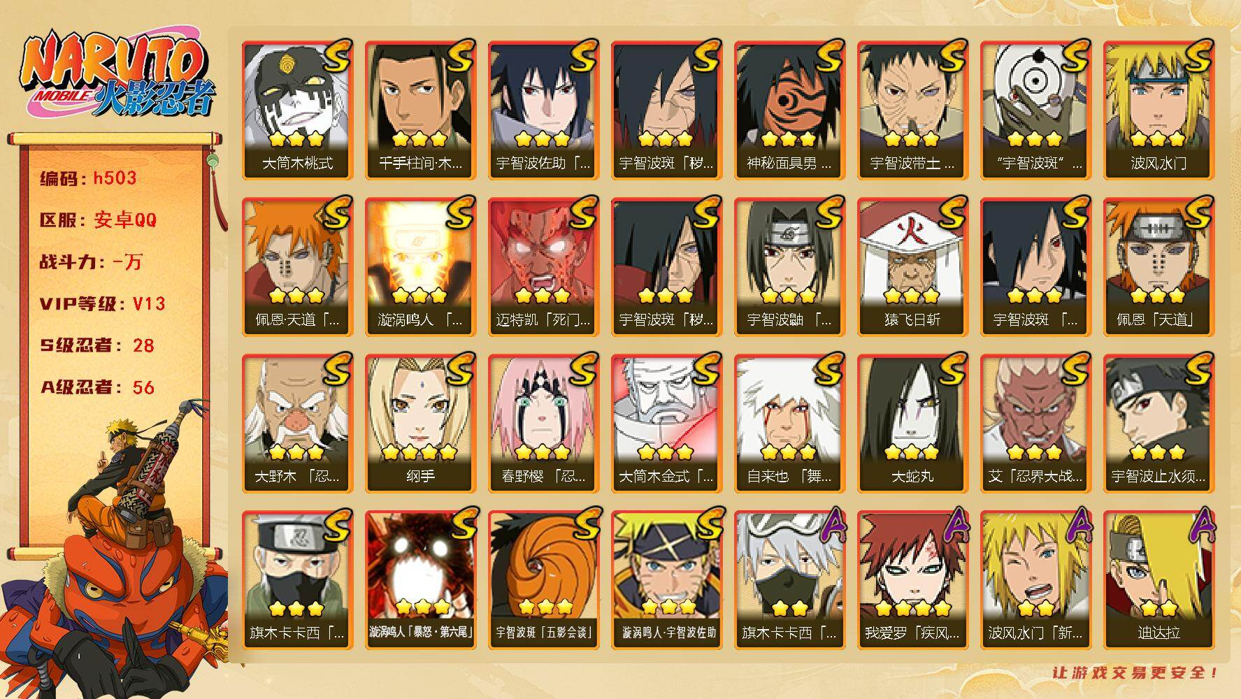 [16527167]28S级忍者数-56A级忍者数 【S级忍者】:宇智波斑「秽土转生」(3星),宇智波斑「秽土转生·解」(3星),大野木「忍界大战」(3星),春野樱「忍界大战」(3星),宇智波带土「忍界大战」(3星),艾「忍界大战」(3星),宇智波鼬「须佐能乎」(3星),宇智波止水「须佐能乎」(3星),旗木卡卡西「须佐能乎」(3星),宇智波斑「木叶创立」(3星),千手柱间「木叶创立」(3星),自来也「舞之豪杰」(3星),大蛇丸(3星),纲手(4星),猿飞日斩(3星),波风水门(3星),神秘面具男「红夜之刃」(3星),漩涡鸣人「九喇嘛连结」(3星),迈特凯「死门」(3星),佩恩「天道」(3星),佩恩·天道「超」(3星),宇智波佐助「永恒万花筒」(3星),宇智波斑 「白面具」(3星宇智波斑「白面具」),大筒木金式(3星),大筒木桃式(3星),漩涡鸣人「暴怒·第六尾」(3星),宇智波斑「五影会谈」(3星),漩涡鸣人·宇智波佐助(3星) 【A级忍者】:艾「青年」(2星),长门「青年」(2星),波风水门「青年」(2星),波风水门「新春限定」(2星),达鲁伊「博人传」(2星),迪达拉(2星),迪达拉「新春限定」(2星),大蛇丸「晓」(2星),奇拉比(2星),飞段(3星),飞段「死司凭血」(2星),飞段「恶灵之影」(2星),干柿鬼鲛(5星),漩涡博人「桃式显现」(2星),漩涡鸣人「九尾查克拉」(2星),机械鸣人「初始形态」(2星),迈特凯(5星),迈特凯「忍界大战」(2星),旗木卡卡西「元气夏日」(2星),旗木卡卡西「幻之真容」(2星),桃地再不斩「漂泊武士」(2星),桃地再不斩「秽土转生」(2星),我爱罗「疾风传」(4星),蝎(4星),蝎「绯流琥」(2星),小南(2星),小南「漂泊浪客」(2星),猿飞阿斯玛(5星),猿飞阿斯玛「七夕限定」(2星),宇智波止水「新春限定」(2星),宇智波鼬(2星),宇智波鼬「夏日限定」(2星),宇智波佐助「须佐能乎」(2星),宇智波佐助「疾风传咒印」(2星),宇智波佐助「万花筒写轮眼」(2星),宇智波佐助「侠隐江湖」(2星),日向宁次「忍界大战」(2星),日向雏田「最终章」(2星),宇智波带土「暴怒」(2星),宇智波带土「漂泊浪客」(2星),长十郎「六代目水影」(2星),神秘面具男「忍者之路」(2星),佩恩·六道「漂泊浪客」(2星),李洛克「忍界大战」(2星),黑
