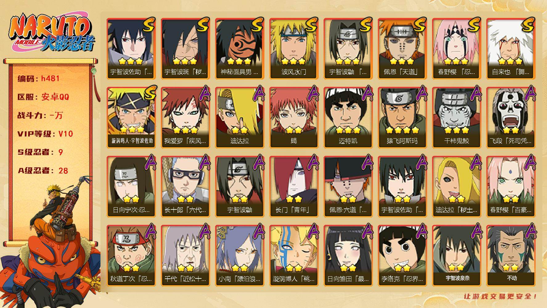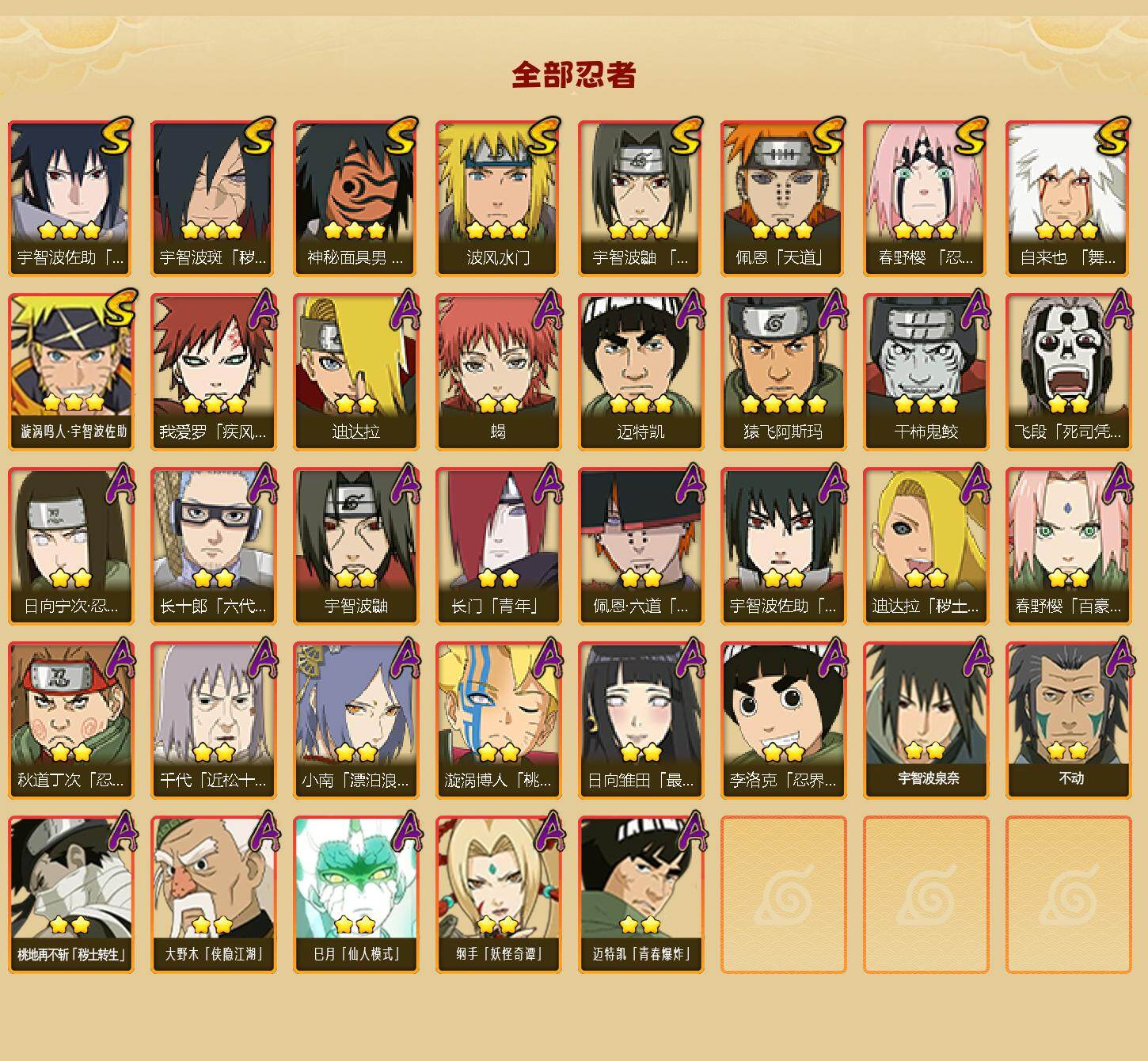 【S级忍者】:宇智波斑「秽土转生·解」(3星),春野樱「忍界大战」(3星),宇智波鼬「须佐能乎」(3星),自来也「舞之豪杰」(3星),波风水门(3星),神秘面具男「红夜之刃」(3星),佩恩「天道」(3星),宇智波佐助「永恒万花筒」(3星),漩涡鸣人·宇智波佐助(3星)