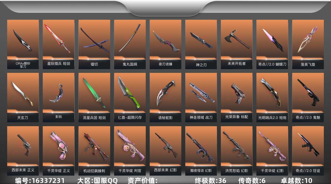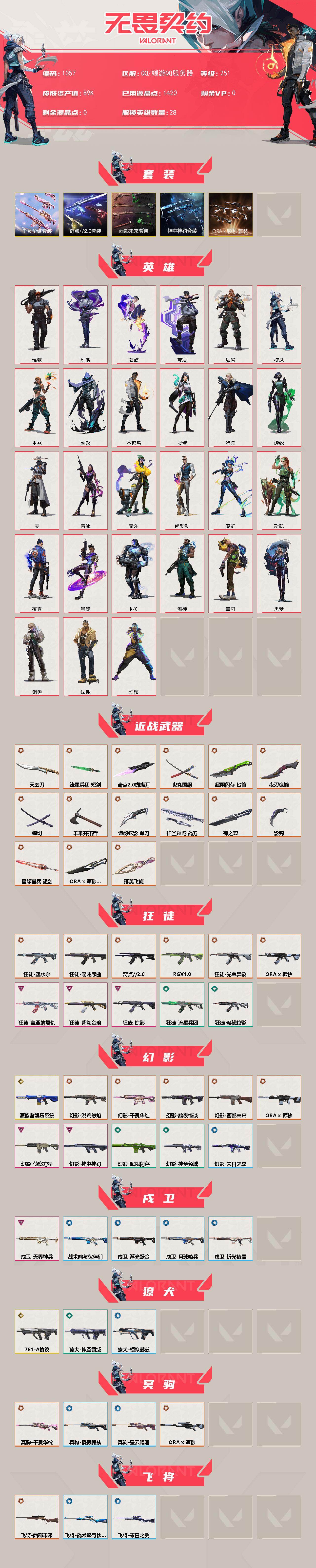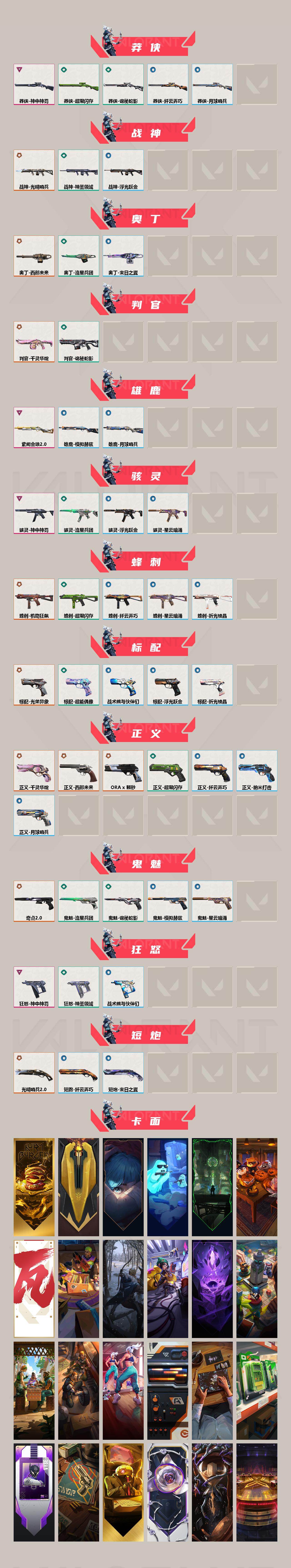 [16337231]【套装】:ORA x 颗秒套装,西部未来套装,千灵华绽套装,奇点//2.0套装,神中神罚套装 【英雄】:幻棱,炼狱,维斯,暮蝶,钛狐,壹决,铁臂,捷风,雷兹,幽影,不死鸟,贤者,猎枭,蝰蛇,零,芮娜,奇乐,尚勃勒,霓虹,斯凯,夜露,星礈,K/O,海神,盖可,黑梦,钢锁 【近战武器】:近战武器-ORA x 颗秒 军刀,近战武器-影钩,近战武器-神之刃,近战武器-奇点//2.0 蝴蝶刀,近战武器-落英飞旋,近战武器-镭切,近战武器-鬼丸国纲,近战武器-未来开拓者,近战武器-流星兵团 短剑,近战武器-超限闪存 匕首,近战武器-天玄刀,近战武器-夜刃诡镰,近战武器-诡秘蛇影 军刀,近战武器-神圣领域 战刀,近战武器-星际猎兵 短剑 【狂徒】:狂徒-混沌序曲,狂徒-奇点//2.0,狂徒-塑水宗,狂徒-RGX 11z Pro,狂徒-光荣异象,狂徒-ORA x 颗秒,狂徒-掠影,狂徒-盖亚的复仇,狂徒-紫阙金琅,狂徒-流星兵团,狂徒-诡秘蛇影 【幻影】:幻影-源能者娱乐系统,幻影-黯夜怪谈,幻影-洪荒怒焰,幻影-千灵华绽,幻影-西部未来,幻影-ORA x 颗秒,幻影-侦察力量,幻影-神中神罚,幻影-超限闪存,幻影-神圣领域,幻影-末日之翼,幻影-西部未来 【戍卫】:戍卫-天界神兵,戍卫-浮光跃金,戍卫-战术熊与伙伴们,戍卫-月球哨兵,戍卫-折光棱晶 【獠犬】:獠犬-781-A协议,獠犬-神圣领域,獠犬-模拟赫兹 【冥驹】:冥驹-千灵华绽,冥驹-ORA x 颗秒,冥驹-模拟赫兹,冥驹-星云暗涌 【飞将】:飞将-西部未来,飞将-战术熊与伙伴们,飞将-末日之翼 【莽侠】:莽侠-神中神罚,莽侠-超限闪存,莽侠-诡秘蛇影,莽侠-纤云弄巧,莽侠-月球哨兵 【战神】:战神-光明哨兵,战神-神圣领域,战神-浮光跃金 【奥丁】:奥丁-西部未来,奥丁-流星兵团,奥丁-末日之翼 【判官】:判官-千灵华绽,判官-诡秘蛇影 【雄鹿】:雄鹿-紫阙金琅//2.0,雄鹿-模拟赫兹,雄鹿-月球哨兵 【骇灵】:骇灵-神中神罚,骇灵-流星兵团,骇灵-浮光跃金,骇灵-星云暗涌 【蜂刺】:蜂刺-机动狂飙,蜂刺-超限闪存,蜂刺-纤云弄巧,蜂刺-星云暗涌,蜂刺-折光棱晶 【标配】:标配-光荣异象,标配-超能偶像,标配-浮光跃金,标配-战术熊与伙伴们,标配-折光棱晶 【正义】:正义-千灵华绽,正义-西部未来,正义-ORA x