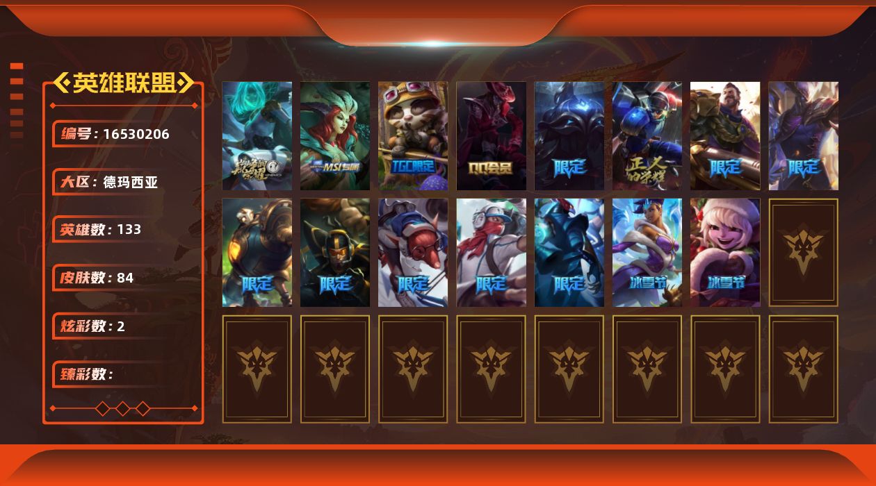 未定级段位-133英雄-84皮肤-2炫彩-0终极-1神话-16限定-12传说-28史诗