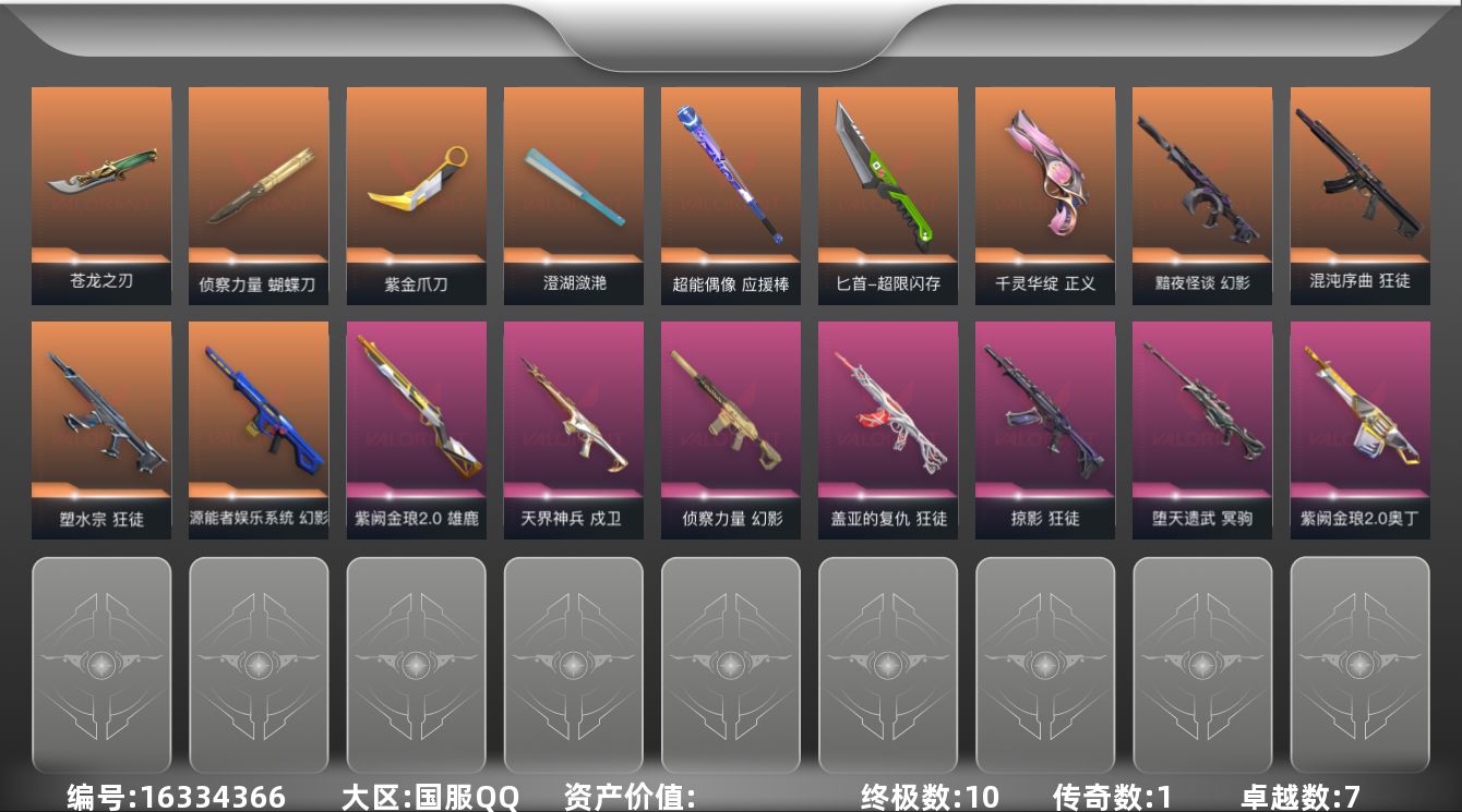 [16334366]【英雄】:幻棱,炼狱,维斯,暮蝶,钛狐,壹决,铁臂,捷风,雷兹,幽影,不死鸟,贤者,猎枭,蝰蛇,零,芮娜,奇乐,尚勃勒,霓虹,斯凯,夜露,星礈,K/O,海神,盖可,黑梦,钢锁 【近战武器】:近战武器-5周年//公测重制版 苍龙之刃,近战武器-侦察力量 蝴蝶刀,近战武器-紫金爪刀,近战武器-澄湖潋滟,近战武器-超能偶像 应援棒,近战武器-超限闪存 匕首 【狂徒】:狂徒-混沌序曲,狂徒-塑水宗,狂徒-掠影,狂徒-盖亚的复仇,狂徒-超能偶像 【幻影】:幻影-源能者娱乐系统,幻影-黯夜怪谈,幻影-侦察力量,幻影-超限闪存,幻影-聚合之力 【戍卫】:戍卫-天界神兵,戍卫-超能偶像,戍卫-浮光跃金 【獠犬】:獠犬-采蜜小蜂队,獠犬-模拟赫兹 【冥驹】:冥驹-堕天遗武,冥驹-模拟赫兹 【飞将】:飞将-聚合之力 【莽侠】:莽侠-超限闪存 【战神】:战神-采蜜小蜂队,战神-浮光跃金 【奥丁】:奥丁-紫阙金琅//2.0 【判官】:判官-超能偶像,判官-采蜜小蜂队 【雄鹿】:雄鹿-紫阙金琅//2.0,雄鹿-模拟赫兹 【骇灵】:骇灵-浮光跃金 【蜂刺】:蜂刺-超限闪存,蜂刺-聚合之力 【标配】:标配-超能偶像,标配-浮光跃金 【正义】:正义-千灵华绽,正义-超限闪存,正义-纳米打击 【鬼魅】:鬼魅-诡秘蛇影,鬼魅-采蜜小蜂队,鬼魅-模拟赫兹,鬼魅-星云暗涌 【狂怒】:狂怒-聚合之力 【短炮】:短炮-蛇吻 【卡面】:终章:激斗汉堡 卡面,进入射程 卡面,《双城之战》拥抱 卡面,精灵大战 卡面,欢迎来到底城 卡面,南瓜盛典 卡面,唱片的故事 卡面,钢弓与箭弦 卡面,排除故障 卡面,战术桌游 卡面,悠享食光 卡面,修车达人 卡面,热舞环节 卡面,模拟赫兹 卡面,浮光跃金 卡面,超限闪存 卡面,维斯工牌 卡面,正义的化身 卡面,至黑之夜 卡面,终章:生意人麦宝 卡面,铁之华 卡面,失而复得 卡面,时间到 卡面,最高舞台 卡面,复活专家 卡面,归乡 // 蝰蛇 卡面,超能偶像 卡面,生意人麦宝 卡面,音熊登场 卡面,声感陷阱设计图 卡面,红鳞松叶 卡面,钢锁工牌 卡面,战术小伙伴的夏日 卡面,采蜜小蜂队 卡面,聚合之力 卡面,梦幻奶茶 卡面,源能反应 卡面,零点嗅探设计图 卡面,无畏契约:蝰蛇 卡面,无畏契约GO!第一卷:芮娜 卡面,清除名单 卡面,无畏契约GO!第一卷:零 卡面,比比看谁快? 卡