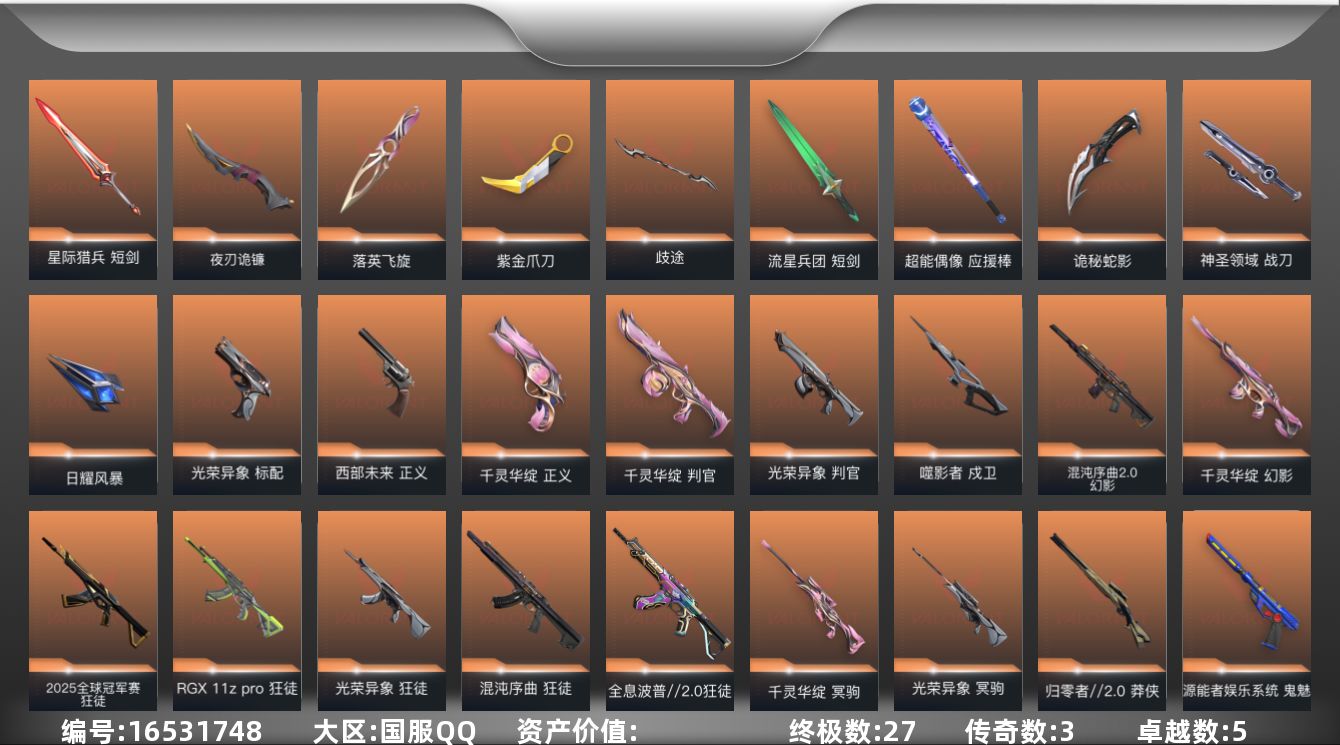 [16531748]【套装】:光荣异象套装,千灵华绽套装 【英雄】:幻棱,炼狱,维斯,暮蝶,钛狐,壹决,铁臂,捷风,雷兹,幽影,不死鸟,贤者,猎枭,蝰蛇,零,芮娜,奇乐,尚勃勒,霓虹,斯凯,夜露,星礈,K/O,海神,盖可,黑梦,钢锁 【近战武器】:近战武器-光荣异象 歧途,近战武器-紫金爪刀,近战武器-落英飞旋,近战武器-流星兵团 短剑,近战武器-超能偶像 应援棒,近战武器-夜刃诡镰,近战武器-诡秘蛇影 军刀,近战武器-神圣领域 战刀,近战武器-日耀风暴 遗器,近战武器-星际猎兵 短剑 【狂徒】:狂徒-2025全球冠军赛,狂徒-混沌序曲,狂徒-全息波普//2.0,狂徒-RGX 11z Pro,狂徒-光荣异象,狂徒-紫阙金琅,狂徒-离子武器//2.0,狂徒-超能偶像,狂徒-流星兵团,狂徒-诡秘蛇影 【幻影】:幻影-千灵华绽,幻影-混沌序曲//2.0,幻影-侦察力量,幻影-神圣领域,幻影-聚合之力,幻影-末日之翼 【戍卫】:戍卫-噬影者,戍卫-超能偶像,戍卫-战术熊与伙伴们,戍卫-月球哨兵,戍卫-折光棱晶 【獠犬】:獠犬-781-A协议,獠犬-神圣领域,獠犬-采蜜小蜂队 【冥驹】:冥驹-千灵华绽,冥驹-光荣异象,冥驹-离子武器,冥驹-星云暗涌 【飞将】:飞将-聚合之力,飞将-战术熊与伙伴们,飞将-末日之翼 【莽侠】:莽侠-归零者//2.0,莽侠-诡秘蛇影,莽侠-纤云弄巧,莽侠-月球哨兵 【战神】:战神-神圣领域,战神-采蜜小蜂队 【奥丁】:奥丁-流星兵团,奥丁-末日之翼 【判官】:判官-千灵华绽,判官-光荣异象,判官-超能偶像,判官-诡秘蛇影,判官-采蜜小蜂队 【雄鹿】:雄鹿-起源,雄鹿-月球哨兵 【骇灵】:骇灵-781-A协议,骇灵-流星兵团,骇灵-星云暗涌 【蜂刺】:蜂刺-聚合之力,蜂刺-纤云弄巧,蜂刺-星云暗涌,蜂刺-折光棱晶 【标配】:标配-光荣异象,标配-超能偶像,标配-战术熊与伙伴们,标配-折光棱晶 【正义】:正义-千灵华绽,正义-西部未来,正义-纤云弄巧,正义-月球哨兵 【鬼魅】:鬼魅-源能者娱乐系统,鬼魅-流星兵团,鬼魅-诡秘蛇影,鬼魅-采蜜小蜂队,鬼魅-灵魂消声者,鬼魅-星云暗涌 【狂怒】:狂怒-神圣领域,狂怒-聚合之力,狂怒-战术熊与伙伴们 【短炮】:短炮-纤云弄巧,短炮-末日之翼 【卡面】:欢迎来到底城 卡面,南瓜盛典 卡面,修车达人 卡面,热舞环节 卡面,正义的化