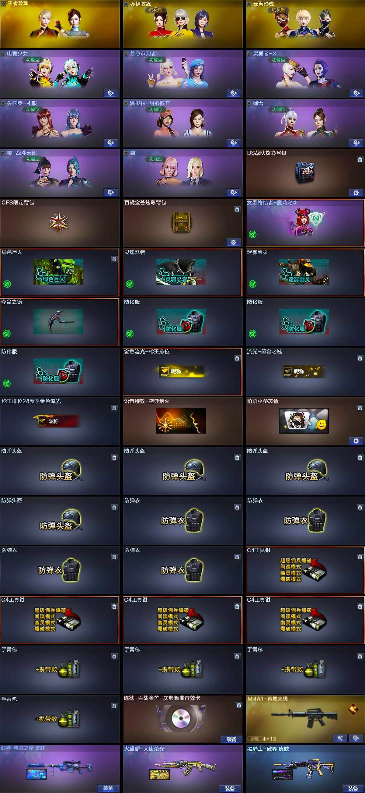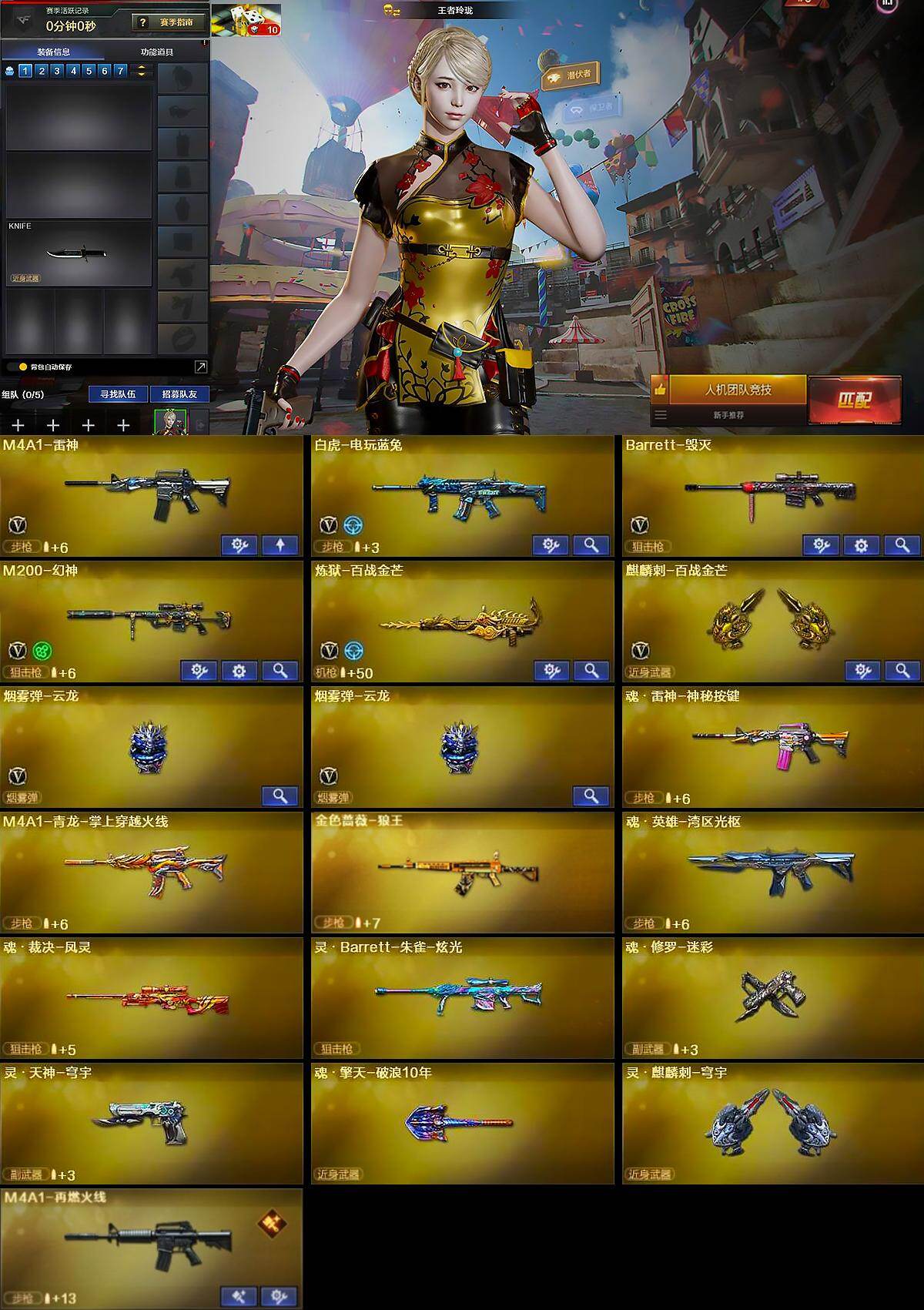 【英雄级武器】:M4A1-雷神,白虎-电玩蓝兔,Barrett-毁灭,M200-幻神,炼狱-百战金芒,麒麟刺-百战金芒,烟雾弹-云龙*2