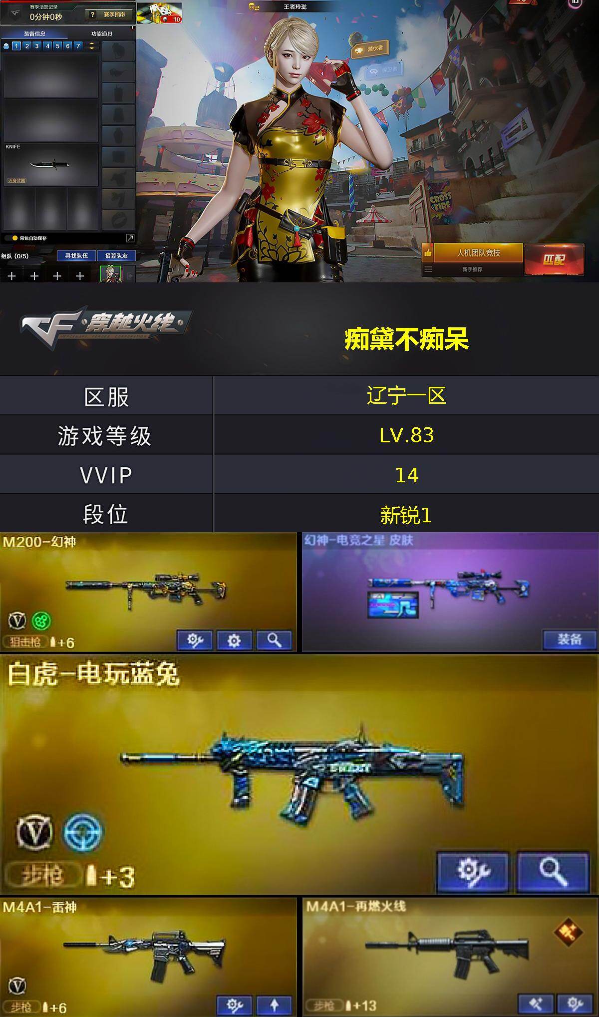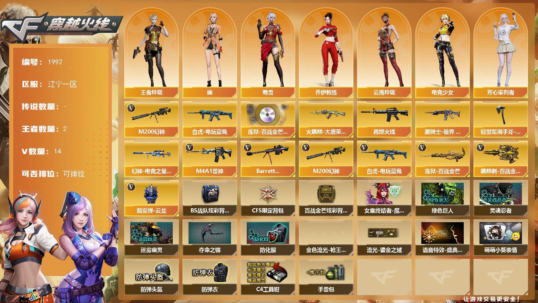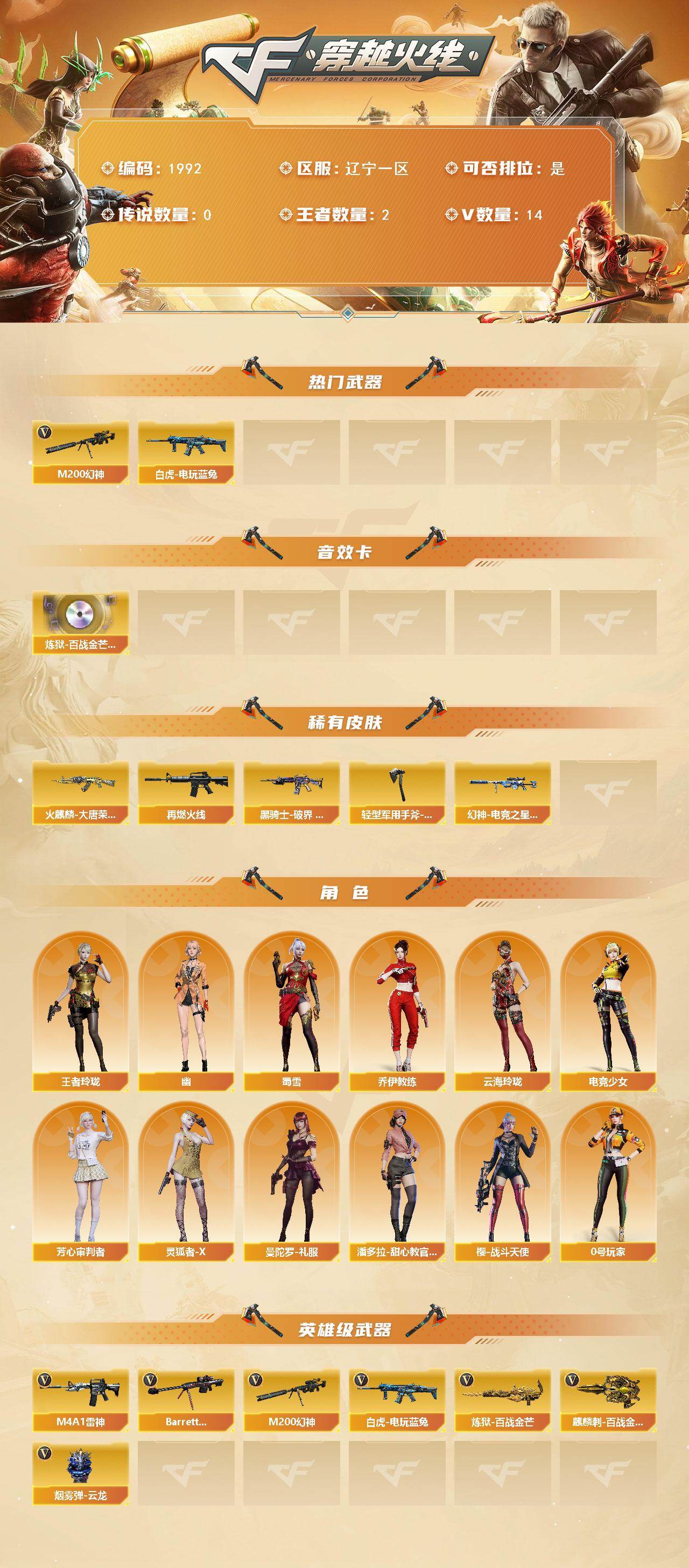 [16531861]辽宁一区-18V-2王者武器数-0炫金武器数 【热门武器】:M200-幻神,白虎-电玩蓝兔 【音效卡】:炼狱-百战金芒-庆典舞曲音效卡 【皮肤】:幻神-电竞之星 皮肤,M4A1-再燃火线,火麒麟-大唐荣光,黑骑士-破界 皮肤,轻型军用手斧-再燃火线 【角色】:王者玲珑,乔伊教练,云海玲珑,电竞少女,芳心审判者,0号玩家,灵狐者-X,曼陀罗-礼服,潘多拉-甜心教官,蜀雪,樱-战斗天使,幽 【英雄级武器】:M4A1-雷神,白虎-电玩蓝兔,Barrett-毁灭,M200-幻神,炼狱-百战金芒,麒麟刺-百战金芒,烟雾弹-云龙*2 【道具】:BS战队炫彩背包,CFS限定背包,百战金芒炫彩背包,女皇终结者-魔龙之吻,绿色巨人,灵魂忍者,迷雾幽灵,夺命之镰,防化服*3,金色流光-枪王排位,流光-鎏金之域,枪王排位28赛季金色流光,语音特效-盛典烟火,萌萌小葵表情,防弹头盔*4,防弹衣*4,C4工具钳*4,手雷包*4 【特殊枪械】: