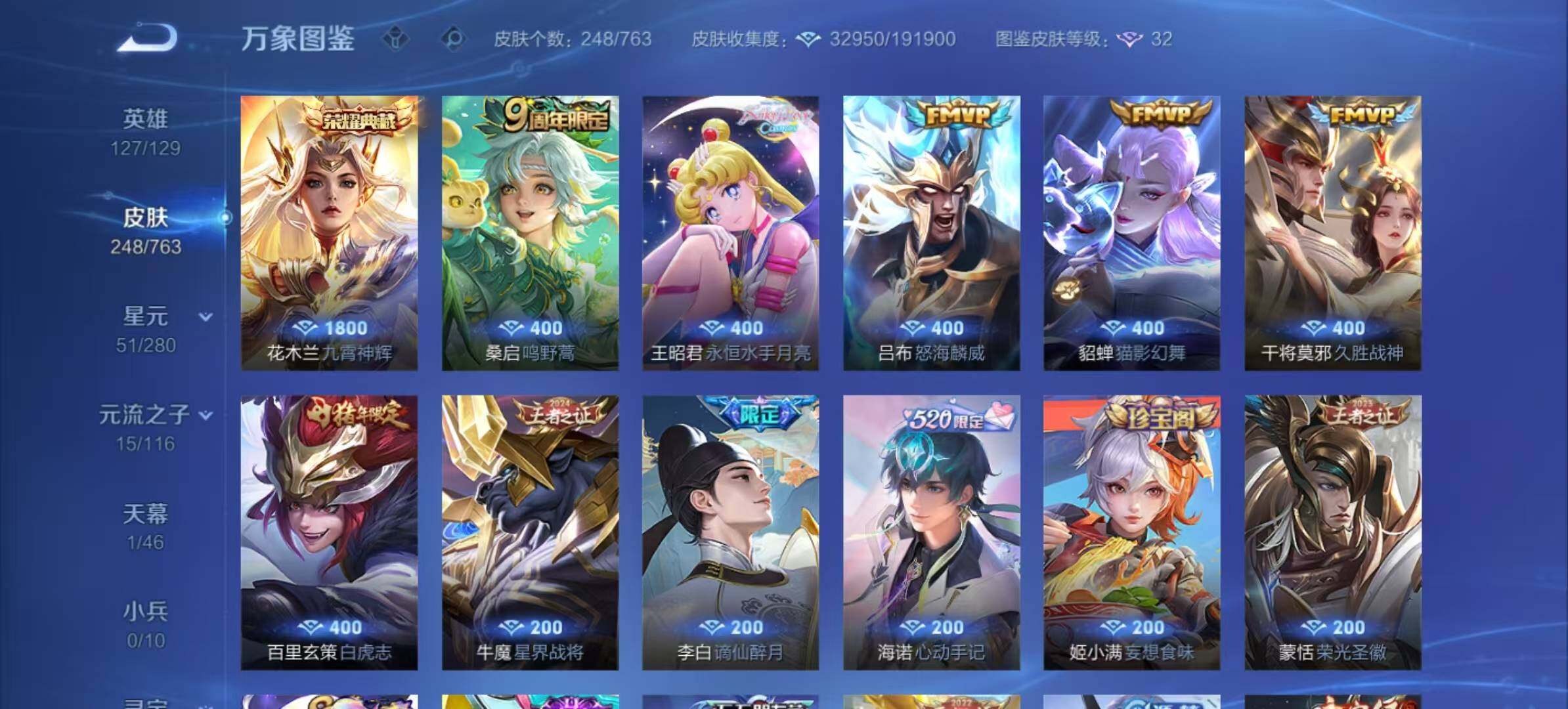 【限定皮肤】:大乔绒语心约,姜子牙天穹之誓,李白谪仙醉月,狄仁杰阴阳师,赵云皇家上将,墨子神迹守卫,妲己时之彼端,嬴政优雅恋人,鲁班七号狮舞东方,庄周高山流水,钟无艳超时空战士,元歌云间偶戏,元歌无心,夏侯惇朔风刀,甄姬游园惊梦,甄姬落雪兰心,典韦穷奇,典韦蓝屏警告,狄仁杰魔术师,狄仁杰万华元夜,达摩沙漠行僧,项羽海滩派对,老夫子醍醐杖,老夫子航海奇遇记,关羽冰锋战神,程咬金演武夺筹,韩信飞衡,王昭君午后时光,兰陵王金庭之子,亚瑟潮玩骑士王,孙悟空至尊宝,牛魔御旌,后羿如梦令,后羿圣弓游侠,刘备百相守梦,李元芳云中旅人,钟馗神迹守卫,钟馗驱傩正仪,杨玉环遇见飞天,女娲朔望之晖,干将莫邪冰霜恋舞曲,干将莫邪胡桃夹子,干将莫邪真爱魔法,雅典娜单词大作战,雅典娜黎明之约,蔡文姬繁星吟游,太乙真人华丽摇滚,鬼谷子原初探秘者,鬼谷子五谷丰年,铠青龙志,苏烈千军破阵,百里玄策白虎志,百里玄策原初追逐者,弈星混沌棋,梦奇顽趣,沈梦溪大漠名商,明世隐疑决卦,裴擒虎李小龙,裴擒虎擒涛扼浪,狂铁御狮,狂铁电玩高手,米莱狄御霄,云中君纤云弄巧,盾山御銮,上官婉儿梁祝,上官婉儿神器万象笔,嫦娥拒霜思,蒙犽狂想玩偶喵,鲁班大师匿光启智者,鲁班大师探海日志,桑启海盐诗旅,阿古朵江河有灵,张良古海寻踪,王昭君永恒水手月亮,蒙恬荣光圣徽,鬼谷子天穹祈灯,姬小满妄想食味,沈梦溪龙舞盛年,刘邦剑破天穹,海诺心动手记,周瑜熔金海岸