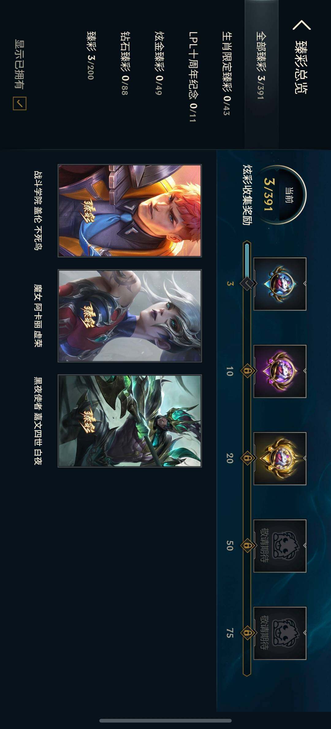 【臻彩皮肤】:战斗学院盖伦不死鸟,魔女阿卡丽虚荣,黑夜使者嘉文四世白夜