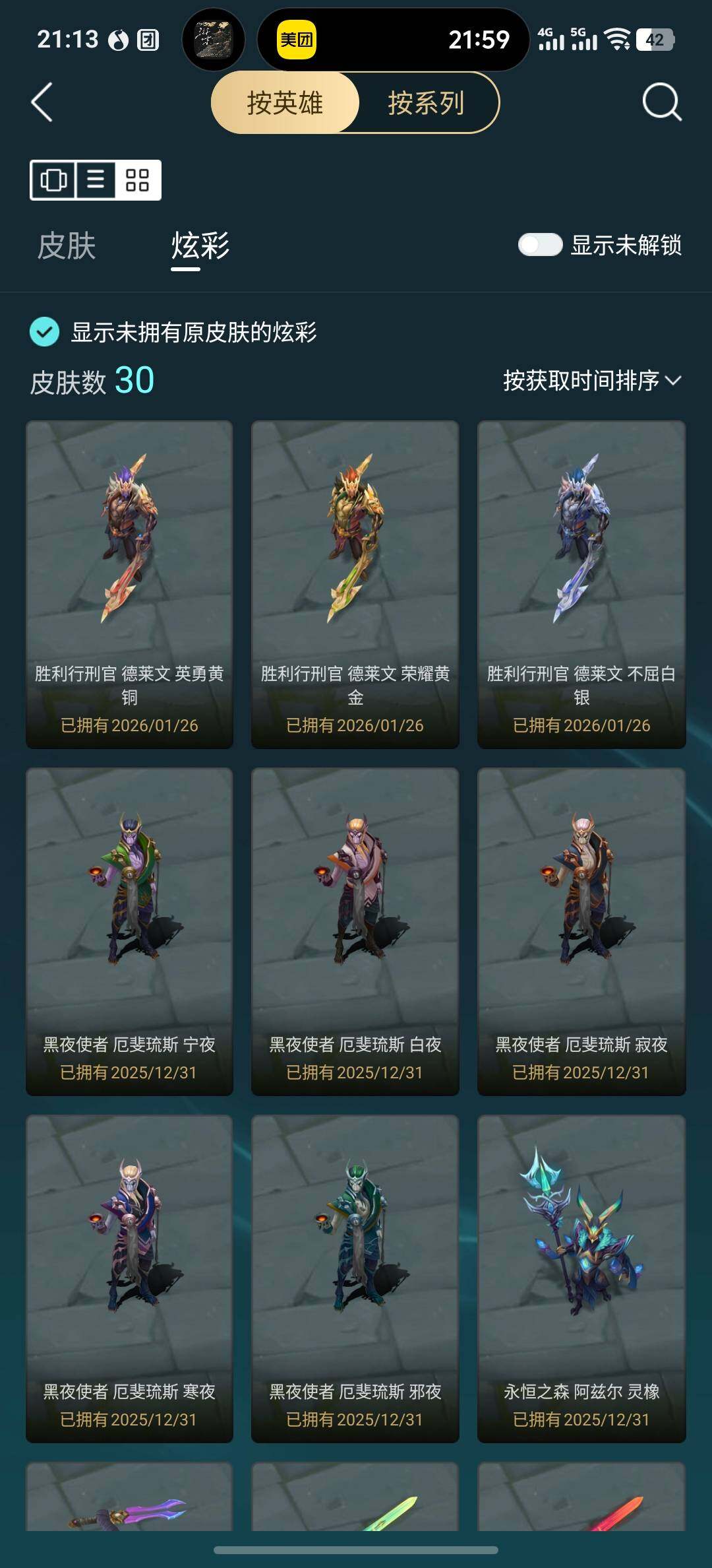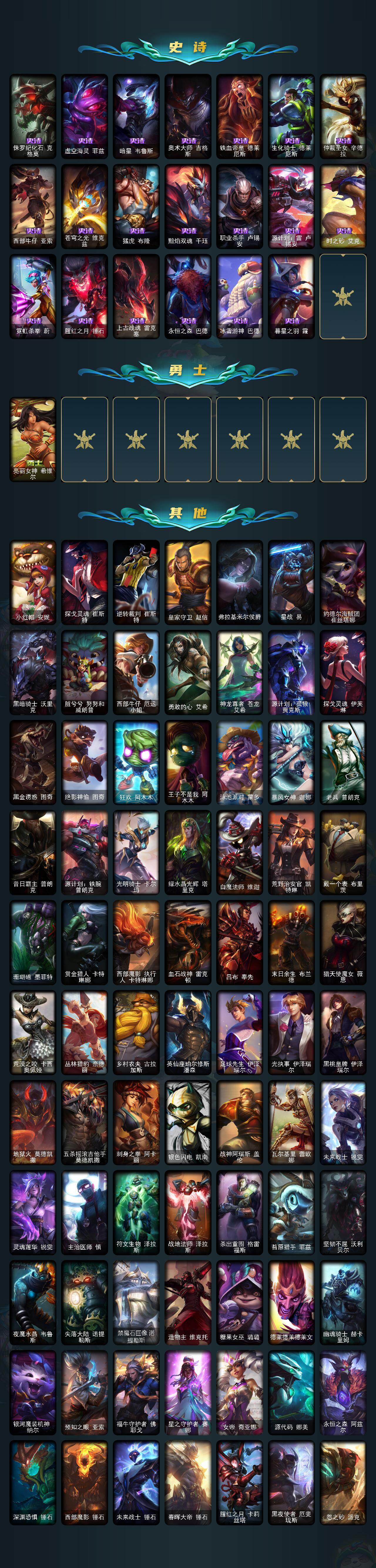 【史诗皮肤】:战场公主希维尔,圣洁化身索拉卡,荒野豺狼沃里克,法国皇室厄运小姐,百夫长贾克斯,侏罗纪化石科加斯,熔火之心拉莫斯,飞越疯人院萨科,夜刃艾瑞莉娅,穿着正装的恶魔维迦,黑曜石守护者墨菲特,霸天巨兽墨菲特,前线指挥官卡特琳娜,凯旋英雄嘉文四世,腥红之月伊莉丝,斗战胜佛孙悟空,至高之拳李青,屠龙勇士薇恩,腥红之月凯南,源计划山蕾欧娜,刺客信条锐雯,侏罗纪化石克格莫,虚空海灵菲兹,暗星韦鲁斯,奥术大师吉格斯,铁血帝皇德莱厄斯,生化骑士德莱厄斯,仲裁圣女辛德拉,西部牛仔亚索,苍穹之光维克兹,猛虎布隆,黯焰双魂千珏,职业杀手卢锡安,源计划雷卢锡安,时之砂艾克,霓虹杀拳蔚,腥红之月锤石,上古战魂雷克塞,永恒之森巴德,冰雪游神巴德,暮星之羽霞