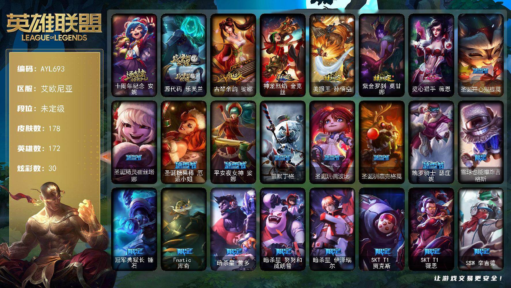 [16533384]【店主推荐捡漏号】未定级段位-172英雄-178皮肤-30炫彩-0终极-2神话-42限定-15传说-41史诗 【神话皮肤】:十周年纪念安妮,源代码乐芙兰 【臻彩皮肤】:战斗学院盖伦不死鸟,魔女阿卡丽虚荣,黑夜使者嘉文四世白夜 【年限皮肤】:古琴余韵娑娜,神龙烈焰金克丝,美猴王孙悟空,紫金罗刹莫甘娜 【情人节限定】:觅心猎手薇恩 【冰雪限定】:圣诞开心鬼提莫,圣诞精灵崔丝塔娜,圣诞糖果棒厄运小姐,平安夜女神娑娜,雪默丁格,圣诞玩偶波比,圣诞驯鹿克格莫,魄罗骑士瑟庄妮,雪球也能爆炸吉格斯 【限定皮肤】:冠军典狱长锤石,Fnatic库奇,暗杀星蒙多,暗杀星努努和威朗普,暗杀星伊泽瑞尔,SKTT1贾克斯,SKTT1薇恩,SSW辛吉德,SSW泰隆,SSW锤石,暗裔英雄盖伦,胜利女神莫甘娜,胜利女神希维尔,胜利之树茂凯,胜利枪神格雷福斯,胜利女神奥莉安娜,胜利之剑亚托克斯,海贼瑞兹,鬼影森森茂凯,蓝色忧郁崔斯特,女猎手希维尔,外星装甲库奇,暗影沃里克,波比的巧克力工坊,都铎王朝图奇,防暴天使凯尔,警用试作体K9内瑟斯 【传说皮肤】:地狱之门卫士加里奥,战地机甲厄加特,恶魔男爵瑞兹,烈焰雄心崔丝塔娜,女主播迦娜,源计划净化薇恩,战斗学院伊泽瑞尔,腥红之月鬼武姬阿卡丽,黯黑魔龙希瓦娜,女校长菲奥娜,金牌主播德莱文,神龙尊者昼日真龙亚索,暗星锤石,星之守护者洛,黎明使者永恩 【史诗皮肤】:战场公主希维尔,圣洁化身索拉卡,荒野豺狼沃里克,法国皇室厄运小姐,百夫长贾克斯,侏罗纪化石科加斯,熔火之心拉莫斯,飞越疯人院萨科,夜刃艾瑞莉娅,穿着正装的恶魔维迦,黑曜石守护者墨菲特,霸天巨兽墨菲特,前线指挥官卡特琳娜,凯旋英雄嘉文四世,腥红之月伊莉丝,斗战胜佛孙悟空,至高之拳李青,屠龙勇士薇恩,腥红之月凯南,源计划山蕾欧娜,刺客信条锐雯,侏罗纪化石克格莫,虚空海灵菲兹,暗星韦鲁斯,奥术大师吉格斯,铁血帝皇德莱厄斯,生化骑士德莱厄斯,仲裁圣女辛德拉,西部牛仔亚索,苍穹之光维克兹,猛虎布隆,黯焰双魂千珏,职业杀手卢锡安,源计划雷卢锡安,时之砂艾克,霓虹杀拳蔚,腥红之月锤石,上古战魂雷克塞,永恒之森巴德,冰雪游神巴德,暮星之羽霞 【勇士皮肤】:亮丽女神希维尔 【其他皮肤1】:小红帽安妮,探戈灵魂崔斯特,逆转裁判崔斯特,皇家守卫赵信,弗拉基米尔侯爵,星战易,约德尔海贼团崔丝塔娜,黑暗骑士沃里克,脏兮兮努