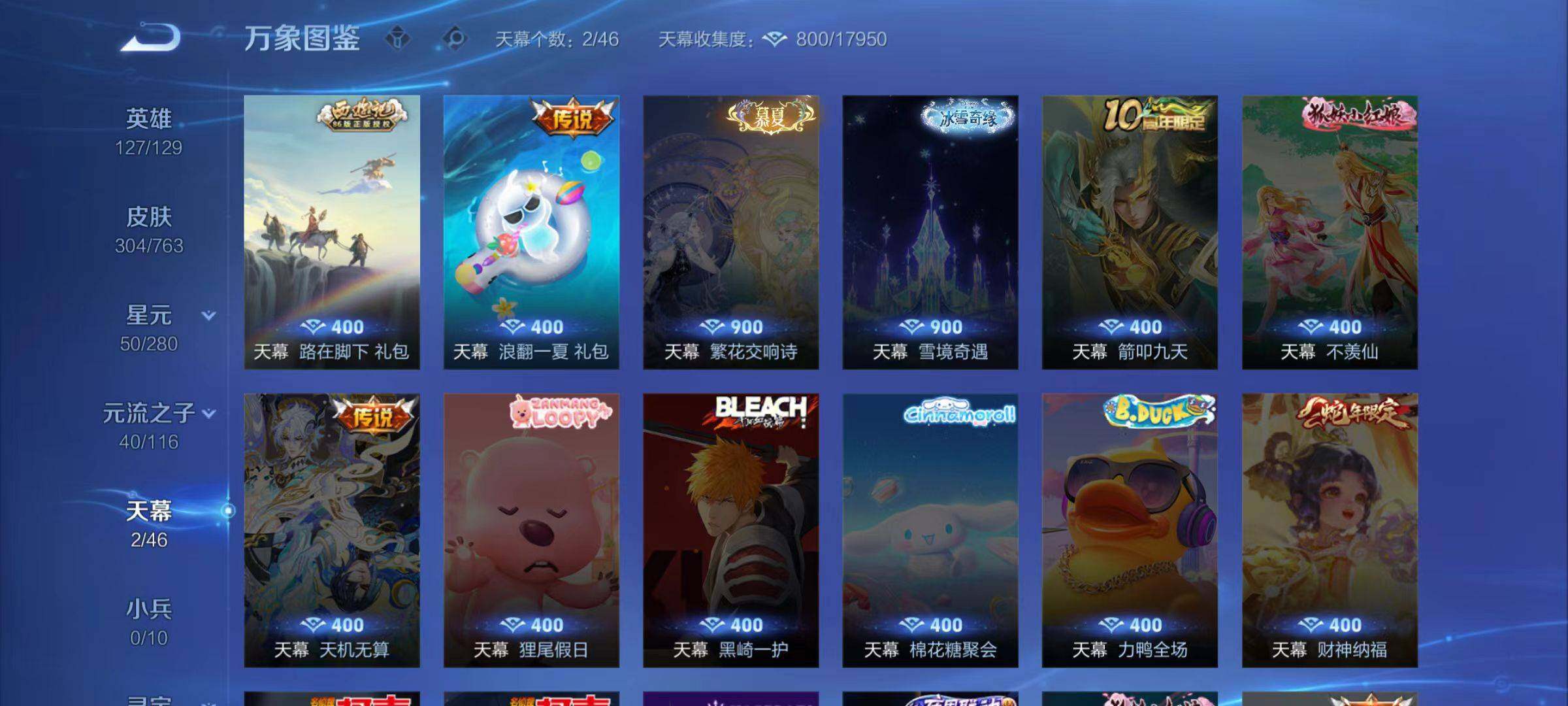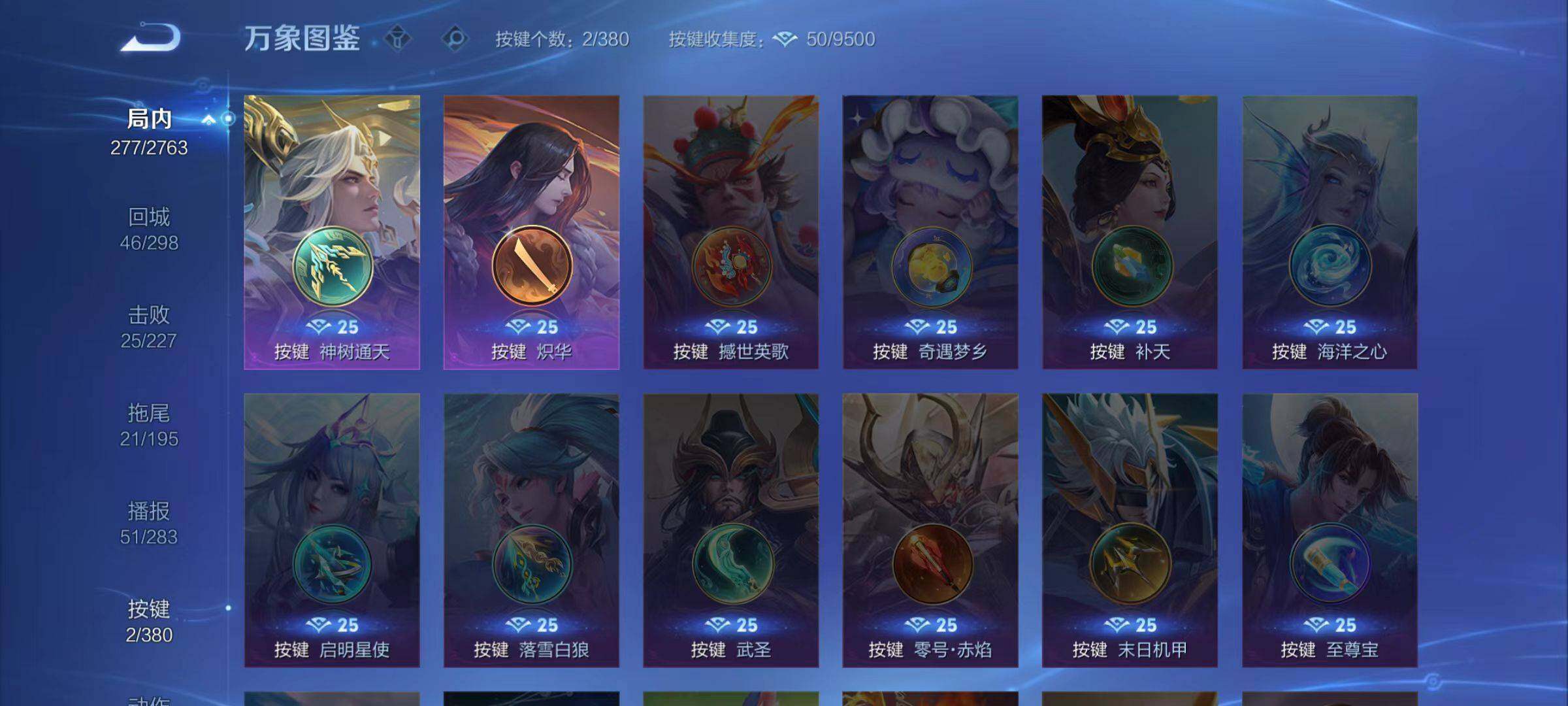 虞姬凯尔特女王,白起狰,太乙真人饕餮,芈月重明,典韦穷奇,狂铁御狮,米莱狄御霄,牛魔御旌,盾山御銮,夏侯惇朔风刀,明世隐疑决卦,老夫子醍醐杖,鬼谷子原初探秘者,狄仁杰万华元夜,程咬金演武夺筹,钟馗驱傩正仪,吕布猎兽之王,嬴政白昼王子,钟馗神迹守卫,鲁班七号狮舞东方,马可波罗暗影游猎,蒙犽狂想玩偶喵,元歌云间偶戏,弈星混沌棋,达摩沙漠行僧,兰陵王金庭之子,沈梦溪大漠名商,李元芳云中旅人,桑启海盐诗旅,裴擒虎擒涛扼浪,鲁班大师探海日志,张良古海寻踪