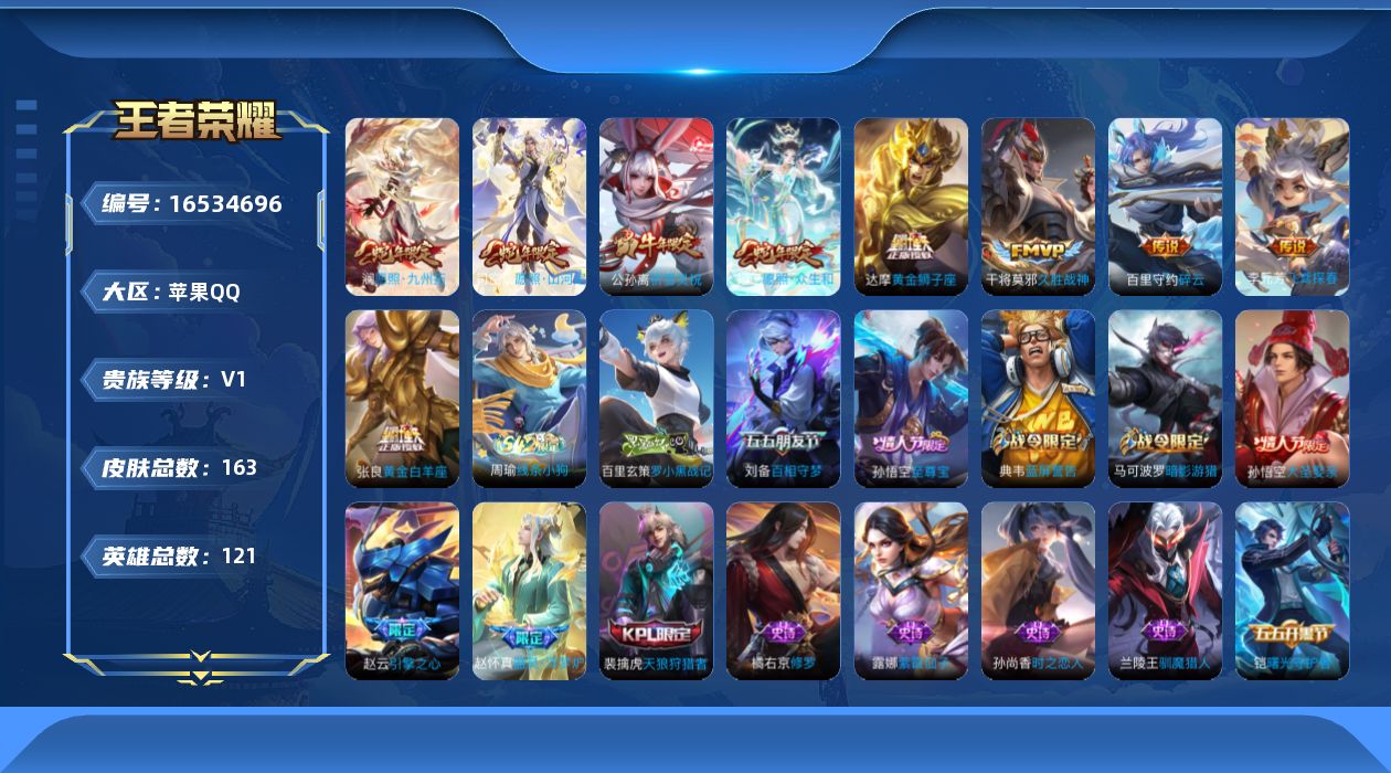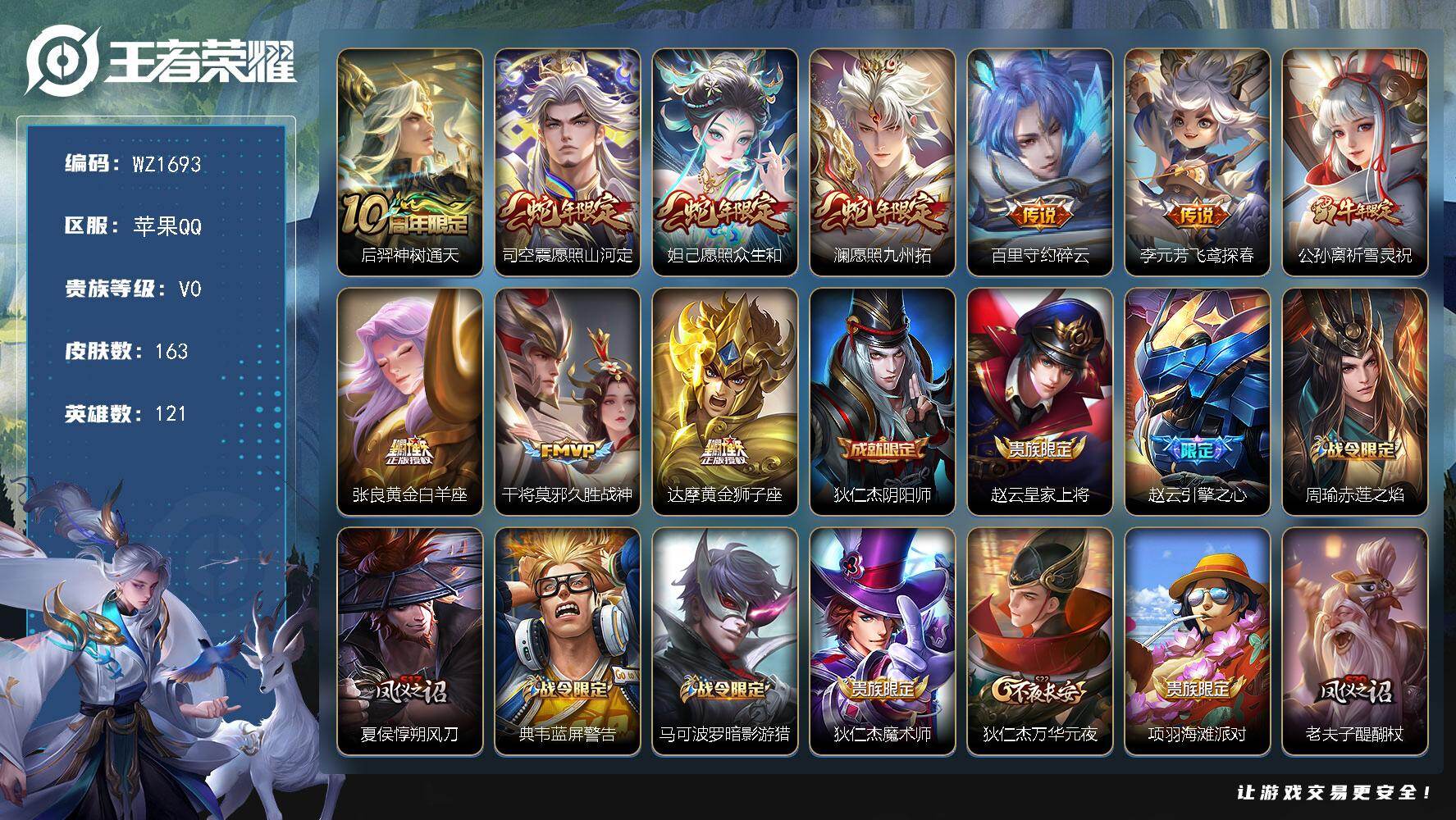[16534696]苹果Q-163皮肤-10传说-45史诗 【英雄全皮】:孙权全皮 【传说皮肤】:后羿神树通天,司空震愿照山河定,妲己愿照众生和,澜愿照九州拓,百里守约碎云,李元芳飞鸢探春,公孙离祈雪灵祝,张良黄金白羊座,干将莫邪久胜战神,达摩黄金狮子座 【限定皮肤】:狄仁杰阴阳师,赵云皇家上将,赵云引擎之心,周瑜赤莲之焰,夏侯惇朔风刀,典韦蓝屏警告,马可波罗暗影游猎,狄仁杰魔术师,狄仁杰万华元夜,项羽海滩派对,老夫子醍醐杖,安琪拉魔法小厨娘,程咬金演武夺筹,兰陵王驯魔猎人,孙悟空至尊宝,孙悟空大圣娶亲,牛魔御旌,刘备百相守梦,钟馗驱傩正仪,女娲朔望之晖,雅典娜黎明之约,鬼谷子原初探秘者,弈星混沌棋,公孙离祈雪灵祝,明世隐疑决卦,裴擒虎天狼狩猎者,米莱狄御霄,盾山御銮,上官婉儿梁祝,鬼谷子天穹祈灯 【年限皮肤】:公孙离祈雪灵祝,司空震愿照山河定,妲己愿照众生和,澜愿照九州拓 【赛季限定】:米莱狄御霄,牛魔御旌,盾山御銮,夏侯惇朔风刀,弈星混沌棋,明世隐疑决卦,老夫子醍醐杖,鬼谷子原初探秘者,狄仁杰万华元夜,程咬金演武夺筹,钟馗驱傩正仪,鬼谷子天穹祈灯,东皇太一噬灭天穹,太乙真人谧流熔炉,钟馗虚灵犬护,亚瑟荣光之誓,雅典娜黎明之约 【战令限定】:典韦蓝屏警告,女娲朔望之晖,兰陵王驯魔猎人,周瑜赤莲之焰,马可波罗暗影游猎,百里守约百相守梦,老夫子百相守梦,孙膑茶境仙,马超访茗客,周瑜线条小狗 【史诗皮肤】:露娜紫霞仙子,赵云皇家上将,貂蝉圣诞恋歌,王昭君偶像歌手,狄仁杰魔术师,廉颇地狱岩魂,孙尚香水果甜心,嬴政暗夜贵公子,妲己魅力维加斯,曹操幽灵船长,李白千年之狐,安琪拉魔法小厨娘,韩信白龙吟,孙悟空至尊宝,赵云引擎之心,花木兰水晶猎龙者,刘邦德古拉伯爵,夏侯惇乘风破浪,小乔缤纷独角兽,兰陵王暗隐猎兽者,诸葛亮黄金分割率,百里守约特工魅影,铠曙光守护者,李元芳逐浪之夏,阿轲节奏热浪,孙策猫狗日记,孙悟空大圣娶亲,典韦蓝屏警告,伽罗箭羽风息,裴擒虎天狼狩猎者,狄仁杰鹰眼统帅,公孙离无限星赏官,兰陵王驯魔猎人,上官婉儿梁祝,橘右京修罗,孙尚香时之恋人,马可波罗暗影游猎,杨戬天秀启明,雅典娜黎明之约,刘备百相守梦,百里守约百相守梦,孙膑茶境仙,弈星万物之道,赵怀真器灵浮梦炉,百里玄策罗小黑战记,周瑜线条小狗 【其他皮肤】:项羽海滩派对,韩信教廷特使,韩信街头霸王,露娜哥特玫瑰,赵云忍炎影,芈月