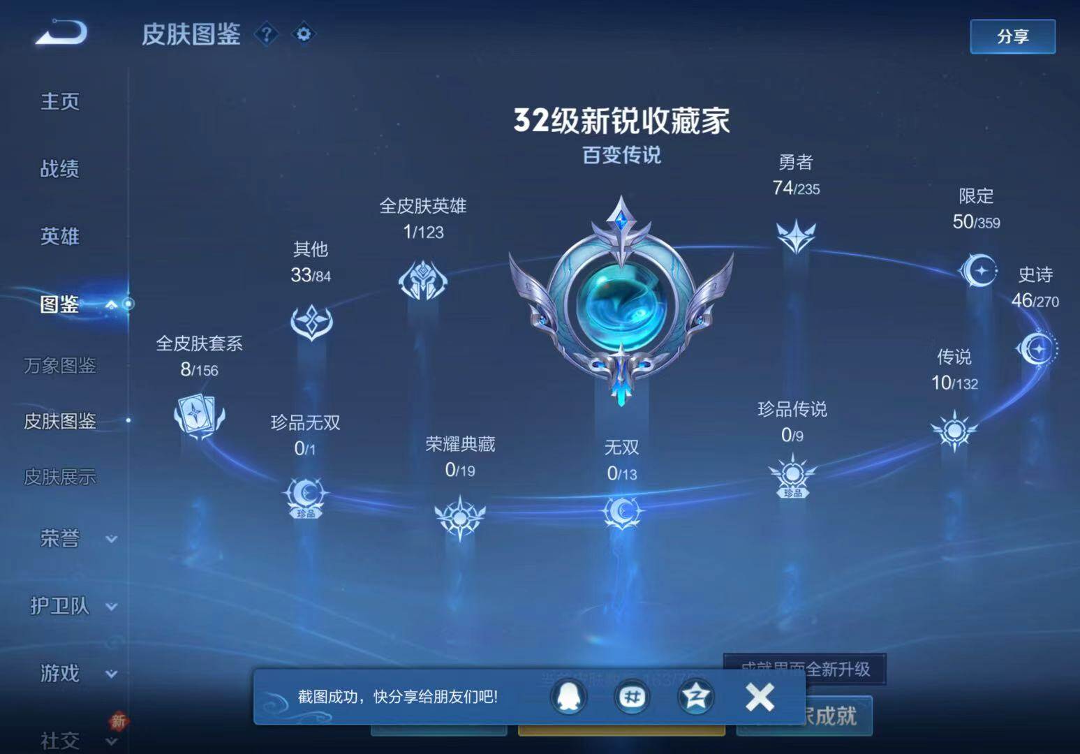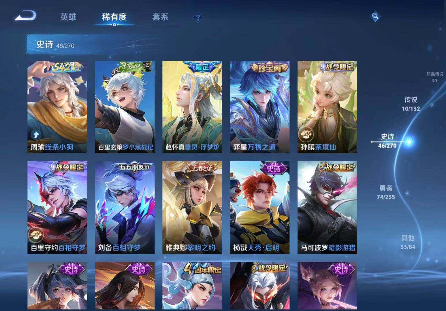 【史诗皮肤】:露娜紫霞仙子,赵云皇家上将,貂蝉圣诞恋歌,王昭君偶像歌手,狄仁杰魔术师,廉颇地狱岩魂,孙尚香水果甜心,嬴政暗夜贵公子,妲己魅力维加斯,曹操幽灵船长,李白千年之狐,安琪拉魔法小厨娘,韩信白龙吟,孙悟空至尊宝,赵云引擎之心,花木兰水晶猎龙者,刘邦德古拉伯爵,夏侯惇乘风破浪,小乔缤纷独角兽,兰陵王暗隐猎兽者,诸葛亮黄金分割率,百里守约特工魅影,铠曙光守护者,李元芳逐浪之夏,阿轲节奏热浪,孙策猫狗日记,孙悟空大圣娶亲,典韦蓝屏警告,伽罗箭羽风息,裴擒虎天狼狩猎者,狄仁杰鹰眼统帅,公孙离无限星赏官,兰陵王驯魔猎人,上官婉儿梁祝,橘右京修罗,孙尚香时之恋人,马可波罗暗影游猎,杨戬天秀启明,雅典娜黎明之约,刘备百相守梦,百里守约百相守梦,孙膑茶境仙,弈星万物之道,赵怀真器灵浮梦炉,百里玄策罗小黑战记,周瑜线条小狗