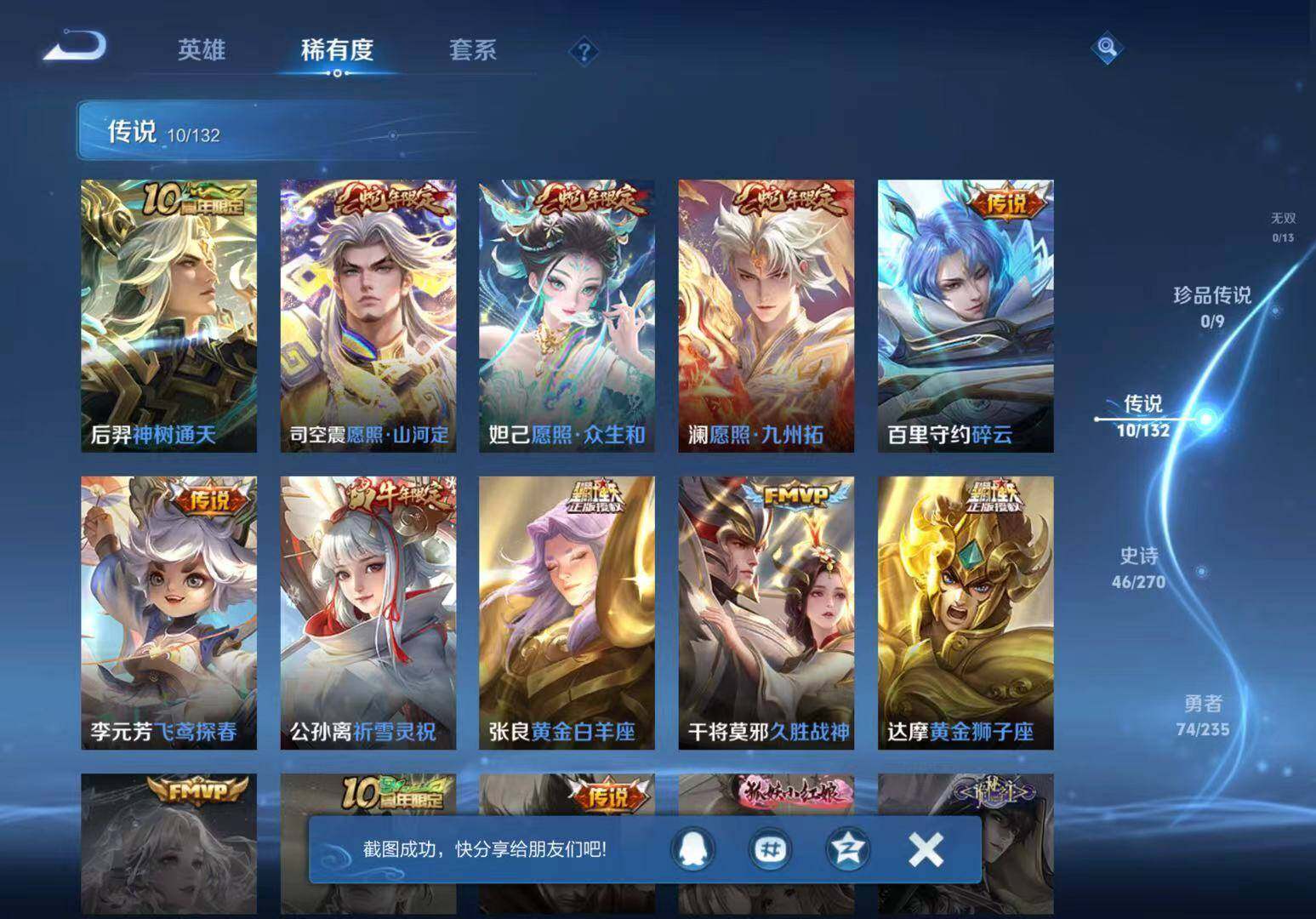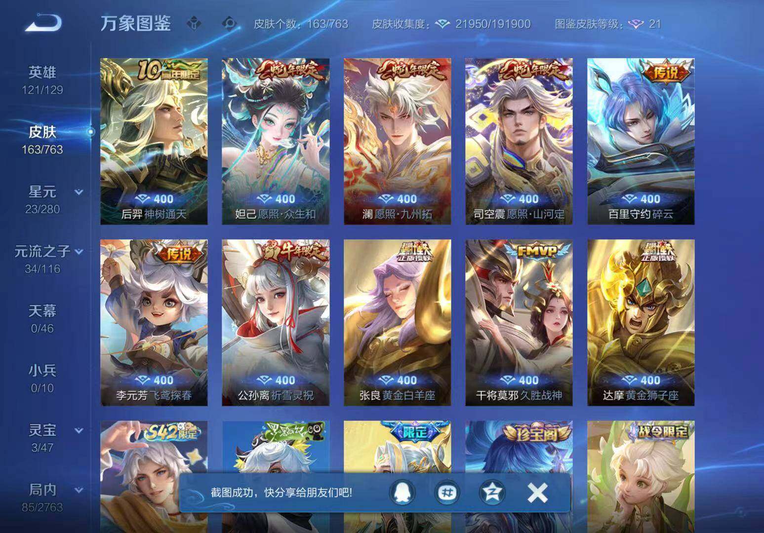 【传说皮肤】:后羿神树通天,司空震愿照山河定,妲己愿照众生和,澜愿照九州拓,百里守约碎云,李元芳飞鸢探春,公孙离祈雪灵祝,张良黄金白羊座,干将莫邪久胜战神,达摩黄金狮子座