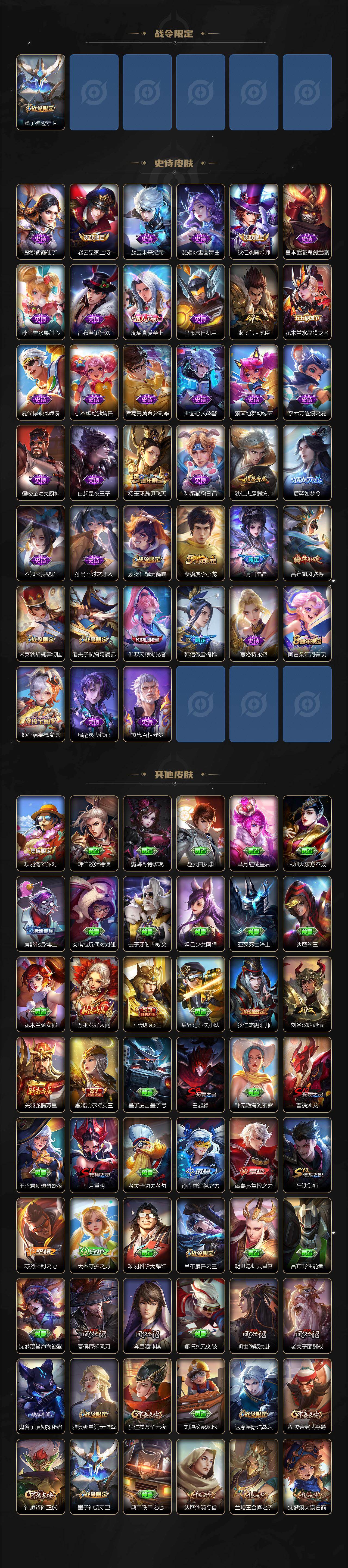 【限定皮肤】:白起狰,狄仁杰阴阳师,虞姬凯尔特女王,赵云皇家上将,墨子神迹守卫,芈月重明,芈月白晶晶,吕布猎兽之王,吕布御风骁将,周瑜真爱至上,夏侯惇朔风刀,曹操烛龙,狄仁杰魔术师,狄仁杰万华元夜,达摩星际陆战队,达摩沙漠行僧,项羽海滩派对,老夫子醍醐杖,老夫子航海奇遇记,程咬金演武夺筹,韩信傲雪梅枪,兰陵王金庭之子,亚瑟狮心王,后羿如梦令,李元芳云中旅人,钟馗驱傩正仪,杨玉环遇见飞天,雅典娜单词大作战,鬼谷子原初探秘者,诸葛亮时雨天司,弈星混沌棋,沈梦溪大漠名商,明世隐疑决卦,裴擒虎李小龙,狂铁御狮,米莱狄胡桃异想国,伽罗天狼溯光者,蒙犽狂想玩偶喵,鲁班大师探海日志,桑启海盐诗旅,阿古朵江河有灵,张良古海寻踪,鬼谷子天穹祈灯,姬小满妄想食味,刘邦剑破天穹