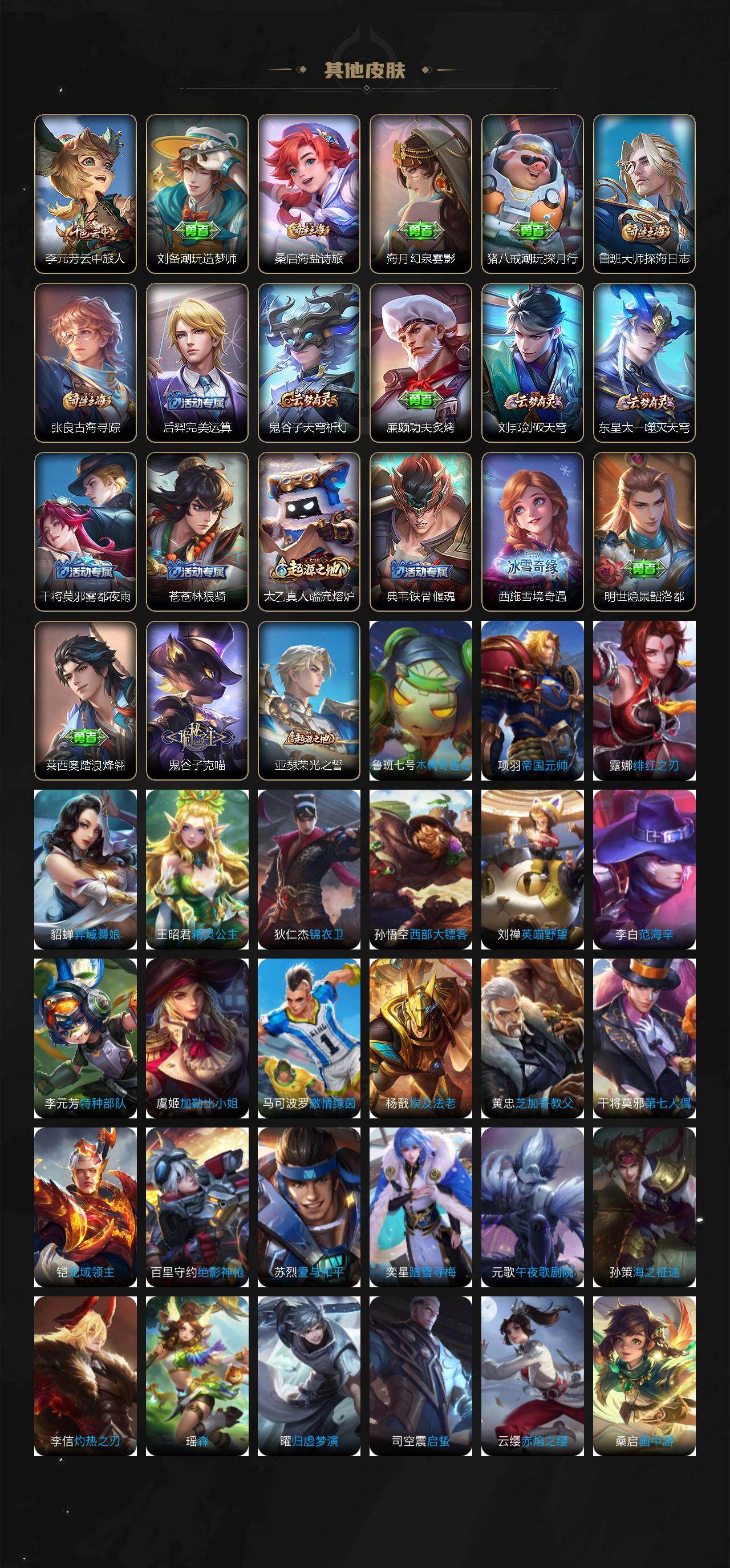 【赛季限定】:亚瑟狮心王,虞姬凯尔特女王,白起狰,曹操烛龙,芈月重明,狂铁御狮,夏侯惇朔风刀,弈星混沌棋,明世隐疑决卦,老夫子醍醐杖,鬼谷子原初探秘者,狄仁杰万华元夜,程咬金演武夺筹,钟馗驱傩正仪,达摩沙漠行僧,兰陵王金庭之子,沈梦溪大漠名商,李元芳云中旅人,桑启海盐诗旅,鲁班大师探海日志,张良古海寻踪,鬼谷子天穹祈灯,刘邦剑破天穹,东皇太一噬灭天穹,太乙真人谧流熔炉,亚瑟荣光之誓