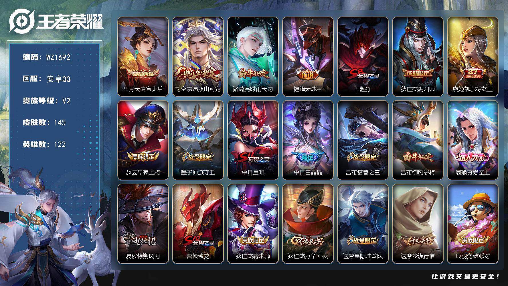 - [16854613]安卓WX-V8-永恒钻石I段位-128英雄-256皮肤-3典藏皮肤-19传说-79史诗 【英雄全皮】:孙权全皮,影全皮 【荣耀典藏】:李白鸣剑曳影,花木兰九霄神辉,韩信弑枪猎影 【传说皮肤】:桑启鸣野蒿,亚连落雪白狼,马超琥珀纪元,铠琥珀纪元,澜逐花归海,宫本武藏惊梅引,马可波罗妄想实况,澜电玩雷克斯,公孙离记忆之芯,曜山海苍雷引,李信山海炽霜斩,马超无双飞将,西施游龙清影,虞姬启明星使,关羽武圣,李信一念神魔,刘备时之恋人,干将莫邪久胜战神,后羿黄金射手座 【限定皮肤】:蔡文姬夏日便利店,大乔绒语心约,虞姬夏日便利店,姜子牙天穹之誓,李白谪仙醉月,狄仁杰阴阳师,赵云皇家上将,赵云百木心枪,孙尚香蔷薇恋人,高渐离玩趣恶龙,钟无艳超时空战士,元歌云间偶戏,元歌无心,甄姬落雪兰心,马可波罗妄想实况,狄仁杰魔术师,狄仁杰万华元夜,达摩沙漠行僧,项羽海滩派对,老夫子航海奇遇记,关羽武圣,韩信傲雪梅枪,兰陵王驯魔猎人,兰陵王金庭之子,孙悟空孙行者,后羿圣弓游侠,李元芳云中旅人,虞姬启明星使,钟馗驱傩正仪,蔡文姬繁星吟游,鬼谷子原初探秘者,鬼谷子五谷丰年,苏烈千军破阵,百里玄策原初追逐者,梦奇顽趣,公孙离玉兔公主,沈梦溪大漠名商,裴擒虎擒涛扼浪,云中君纤云弄巧,李信山海炽霜斩,嫦娥拒霜思,嫦娥暖冬兔眠,曜山海苍雷引,鲁班大师探海日志,桑启海盐诗旅,暃星界游侠,艾琳女武神,艾琳流音漫舞,司空震地狱燃心,阿古朵江河有灵,张良古海寻踪,蒙恬荣光圣徽,高渐离燃音魔法,妲己灵卜魔法,鬼谷子天穹祈灯,铠琥珀纪元,马超琥珀纪元,亚连落雪白狼,沈梦溪龙舞盛年,鲁班七号蔬乡物语,李元芳蔬乡物语,刘邦剑破天穹,上官婉儿群星魔术团,程咬金群星魔术团,镜青焰无极,项羽苍威无极,周瑜熔金海岸 【年限皮肤】:曜山海苍雷引,李信山海炽霜斩 【赛季限定】:鬼谷子原初探秘者,狄仁杰万华元夜,钟馗驱傩正仪,苏烈千军破阵,达摩沙漠行僧,兰陵王金庭之子,沈梦溪大漠名商,李元芳云中旅人,桑启海盐诗旅,裴擒虎擒涛扼浪,鲁班大师探海日志,张良古海寻踪,鬼谷子天穹祈灯,刘邦剑破天穹,姜子牙天穹之誓,东皇太一噬灭天穹,太乙真人谧流熔炉,钟馗虚灵犬护,甄姬逆浪荇歌,亚瑟荣光之誓,百里玄策原初追逐者,梦奇顽趣,蒙恬荣光圣徽,牛魔星界战将,项羽九幽镇关 【战令限定】:兰陵王驯魔猎人,元歌云间偶戏,老夫子航海奇遇记,后羿圣弓游侠,钟