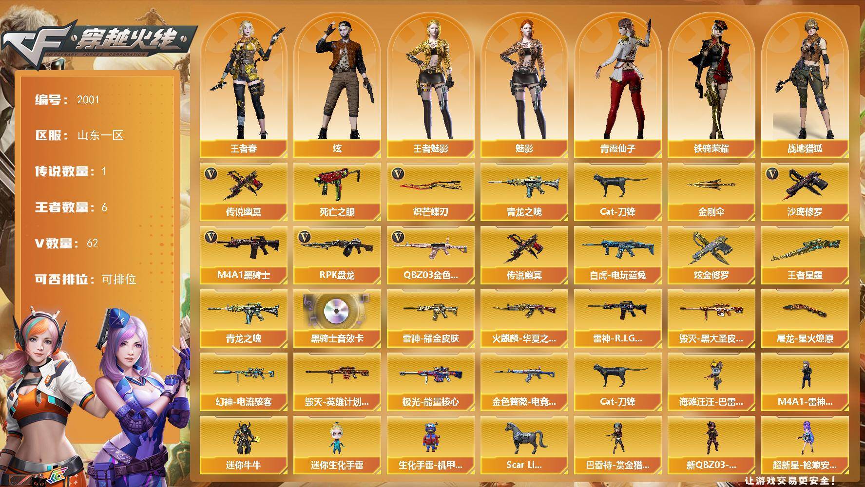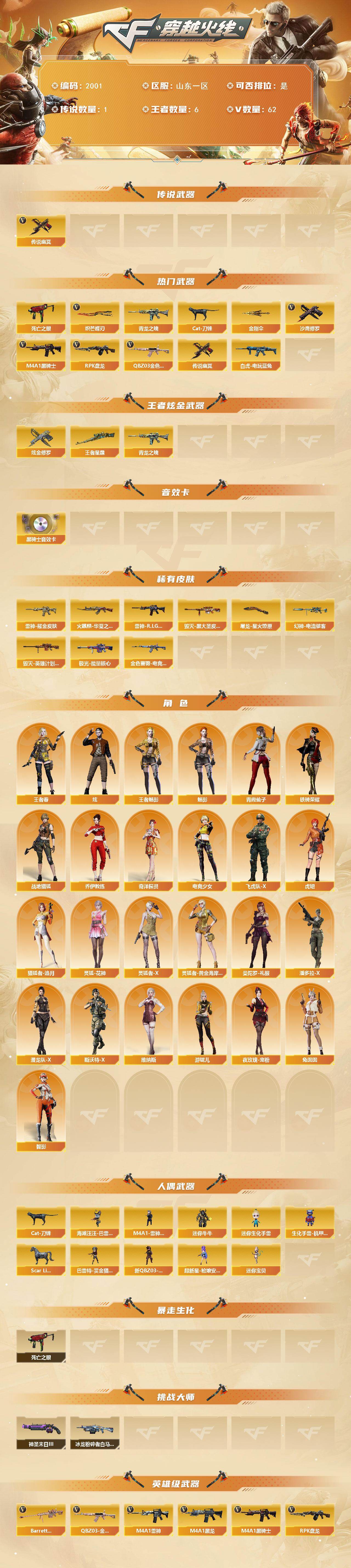 [16534849]山东一区-67V-6王者武器数-1炫金武器数 【传说武器】:传说幽冥 【热门武器】:传说幽冥,QBZ03-金色蔷薇,死亡之眼,青龙之魄,白虎-电玩蓝兔,Cat-刀锋,M4A1-黑骑士,RPK-盘龙,沙鹰-修罗,炽芒蝶刃*2,金刚伞 【王者炫金武器】:青龙之魄,王者星霆,炫金修罗 【音效卡】:M4A1-黑骑士音效卡 【皮肤】:幻神-电流骇客 皮肤,金色蔷薇-电竞之星 皮肤,雷神-耀金皮肤,雷神-R.LGD-CFPLS18冠军,火麒麟-华夏之心,毁灭-黑大圣皮肤,毁灭-英雄计划 皮肤,极光-能量核心,屠龙-星火燎原 【角色】:魅影,炫,战地猎狐,王者春,王者-魅影,奇洋探员,乔伊教练,电竞少女,飞虎队-X,虎妞,猎狐者-追月,灵狐-花神,灵狐者-X,灵狐者-黄金海岸,曼陀罗-礼服,潘多拉-X,潜龙队-X,青霞仙子,斯沃特-X,铁骑荣耀,兔囡囡,维纳斯,夜玫瑰-宠粉,游珑儿,智影 【人偶武器】:M4A1-雷神-精英刀锋,超新星-枪娘安琪儿,迷你宝贝,Scar Light-马枪,海滩汪汪-巴雷特,Cat-刀锋,迷你牛牛,迷你生化手雷,生化手雷-机甲核心,巴雷特-赏金猎人,新QBZ03-精英斯沃特 【暴走生化】:死亡之眼 【挑战大师】:冰龙粉碎者-白马银枪,神圣爆裂者-末日III 【英雄级武器】:AK47-火麒麟,M4A1-黑龙,M4A1-雷神,M4A1-黑骑士,无影-神兵利器,黑武士-锦绣游龙,超新星-热带奇洋,QBZ03-金色蔷薇,王者之势-觉醒版*2,白虎-电玩蓝兔,AWM-天龙,Barrett-毁灭,Barrett-极光,Barrett-金色蔷薇,王者风神-觉醒版,王者凰鸣-觉醒版,RPK-盘龙,沙鹰-修罗,沙鹰-天神*5,屠龙,擎天,麒麟刺,擎天-竞技荣光,炽芒蝶刃*2,龙啸-热带奇洋,高爆手雷-雷霆*4,高爆手雷-云龙*3,手雷-热带奇洋,闪光弹-雷霆*4,闪光弹-竞技荣光,闪光弹-云龙*3,烟雾弹-雷霆*4,烟雾弹-竞技荣光*2,烟雾弹-云龙*2,M4A1-赤狱骑士 【道具】:CFS限定背包,云山科技背包,亚洲杯纪念炫彩背包,冰冰企鹅背包,奇洋探员-海龟背包,机械魔影背包-红色,热带奇洋炫彩背包,白狐背包*4,老虎背包,背包-洛丽塔,超级背包,黄金曼提柯尔的背包,救世主-黑桃战神,绿色巨人,灵魂忍者,迷雾幽灵,生化弹匣,夺命之镰,防化服*2,枪王排位28赛季金